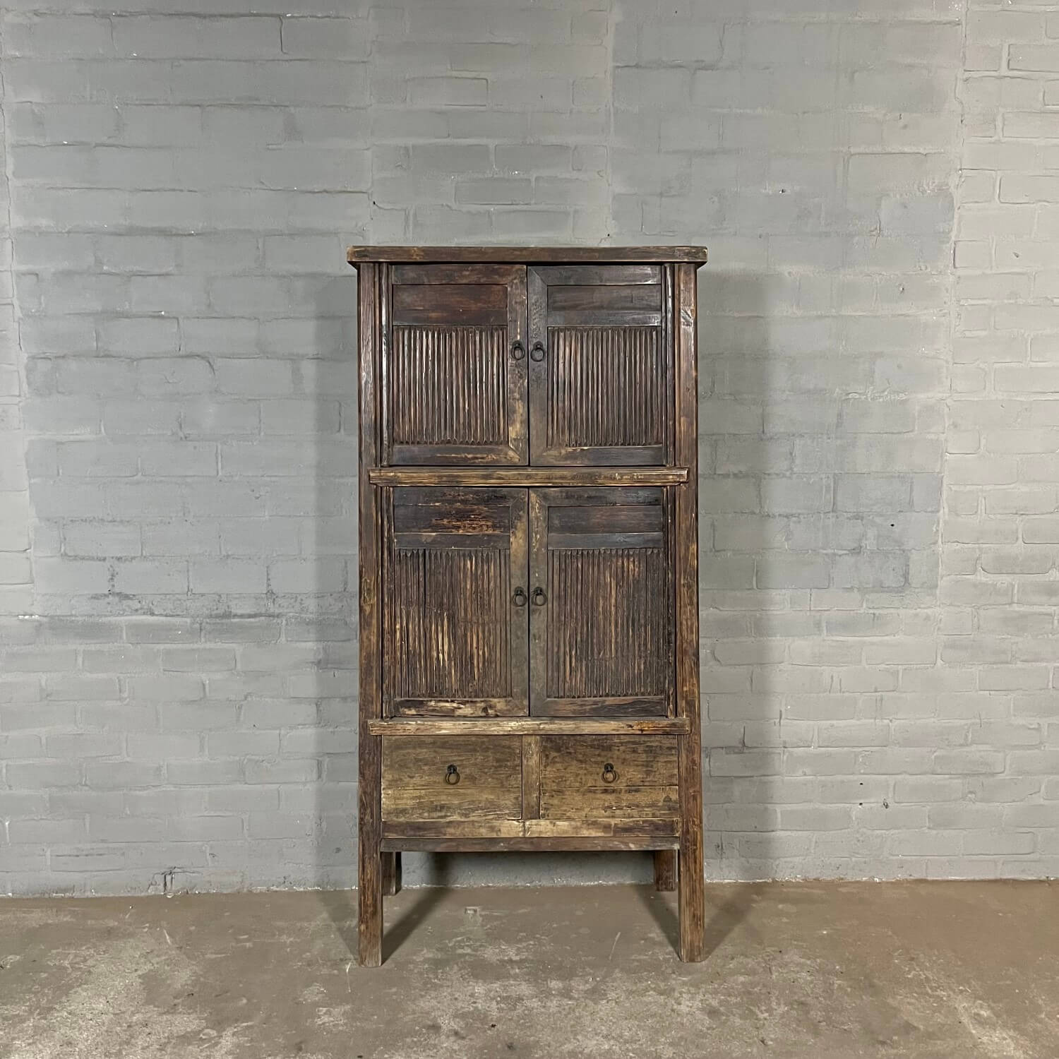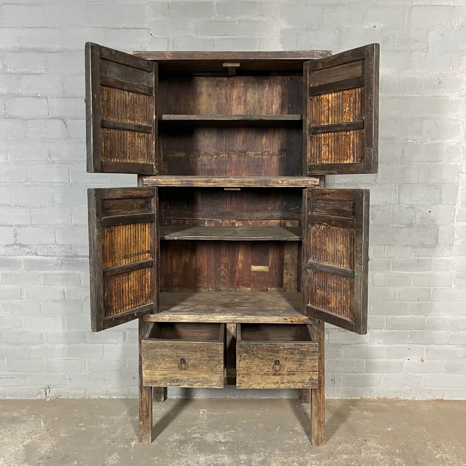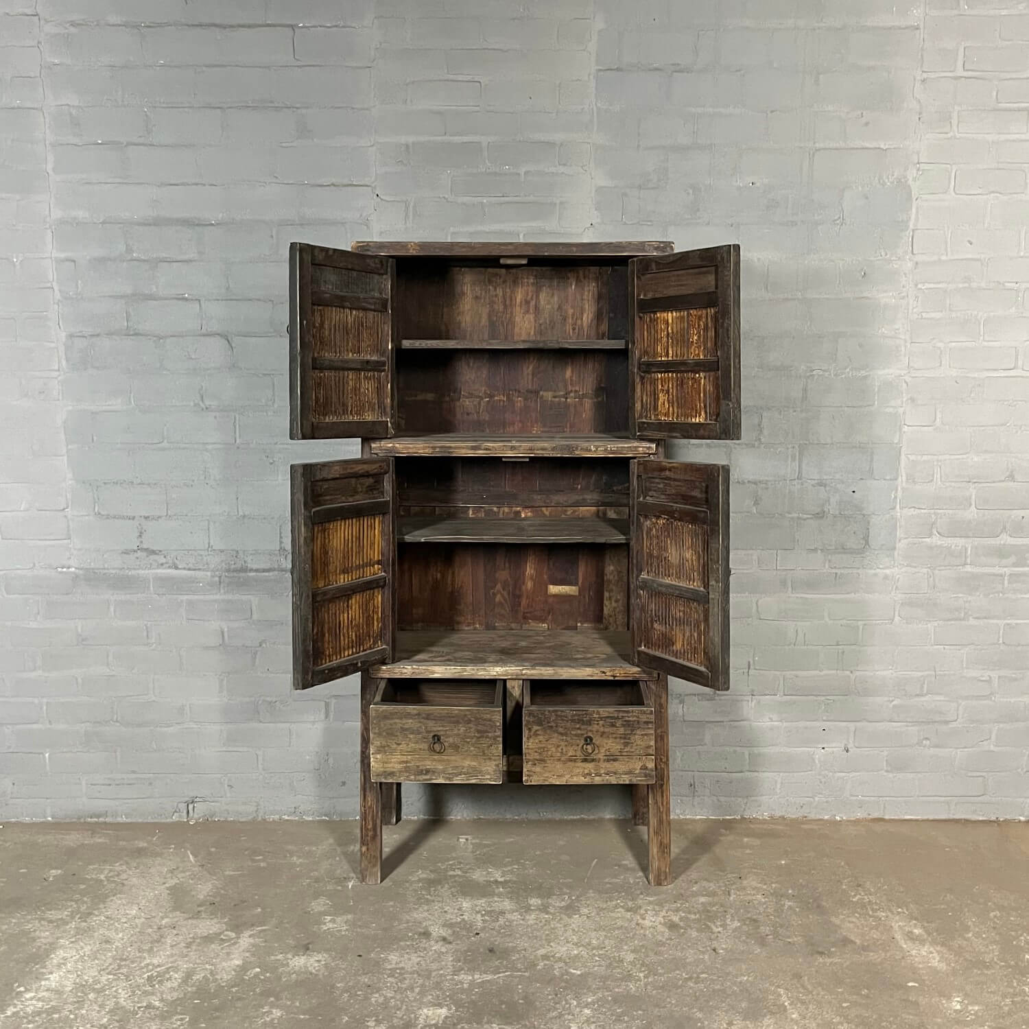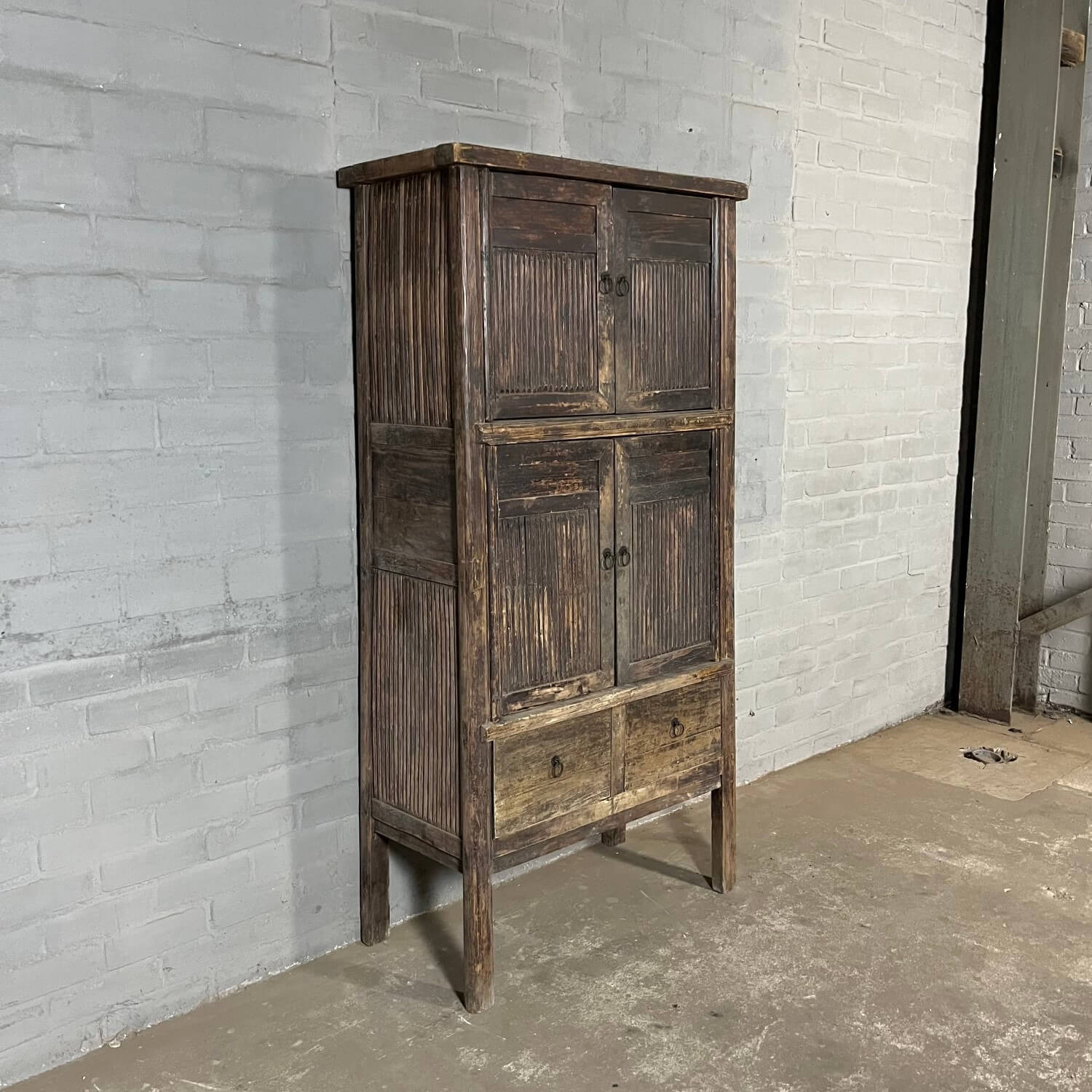 Alter chinesischer Schrank aus Ulmenholz und Bambusplatten. Der Schrank ist mit 4 Türen, 2 Schubladen und schönen Details ausgestattet. Die 4 Türen und die Seiten des Schranks sind aus Bambusplatten gefertigt.