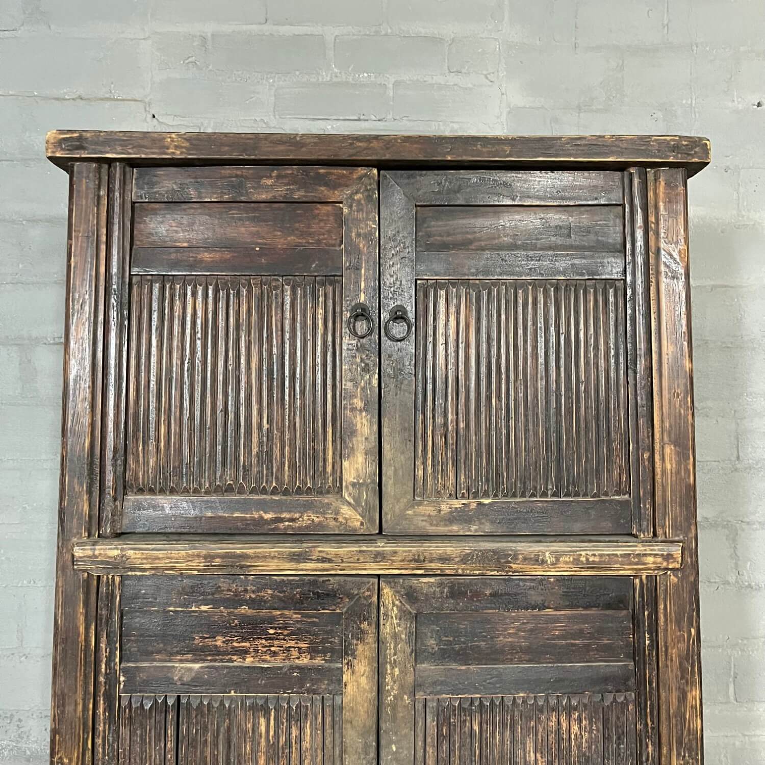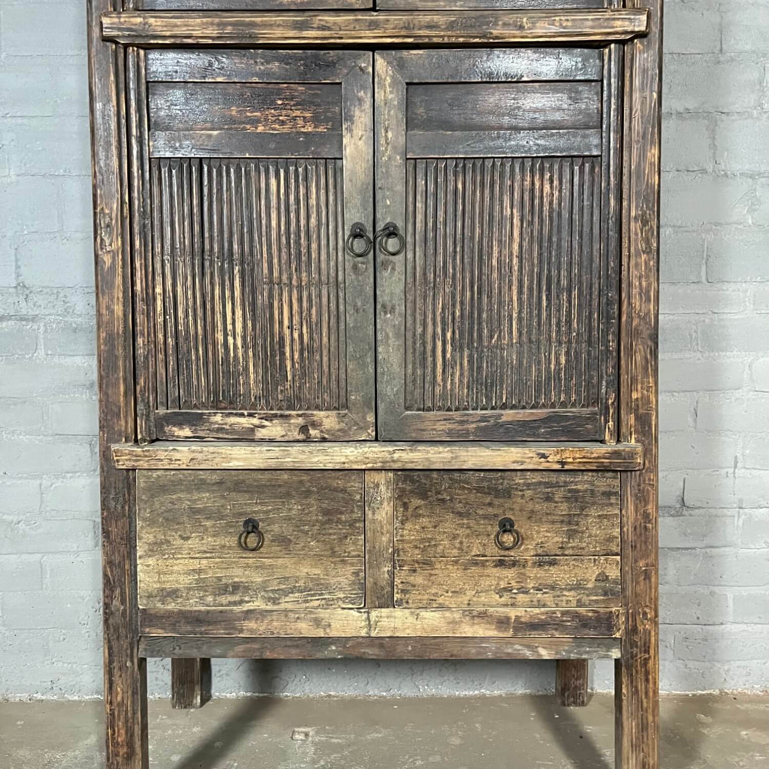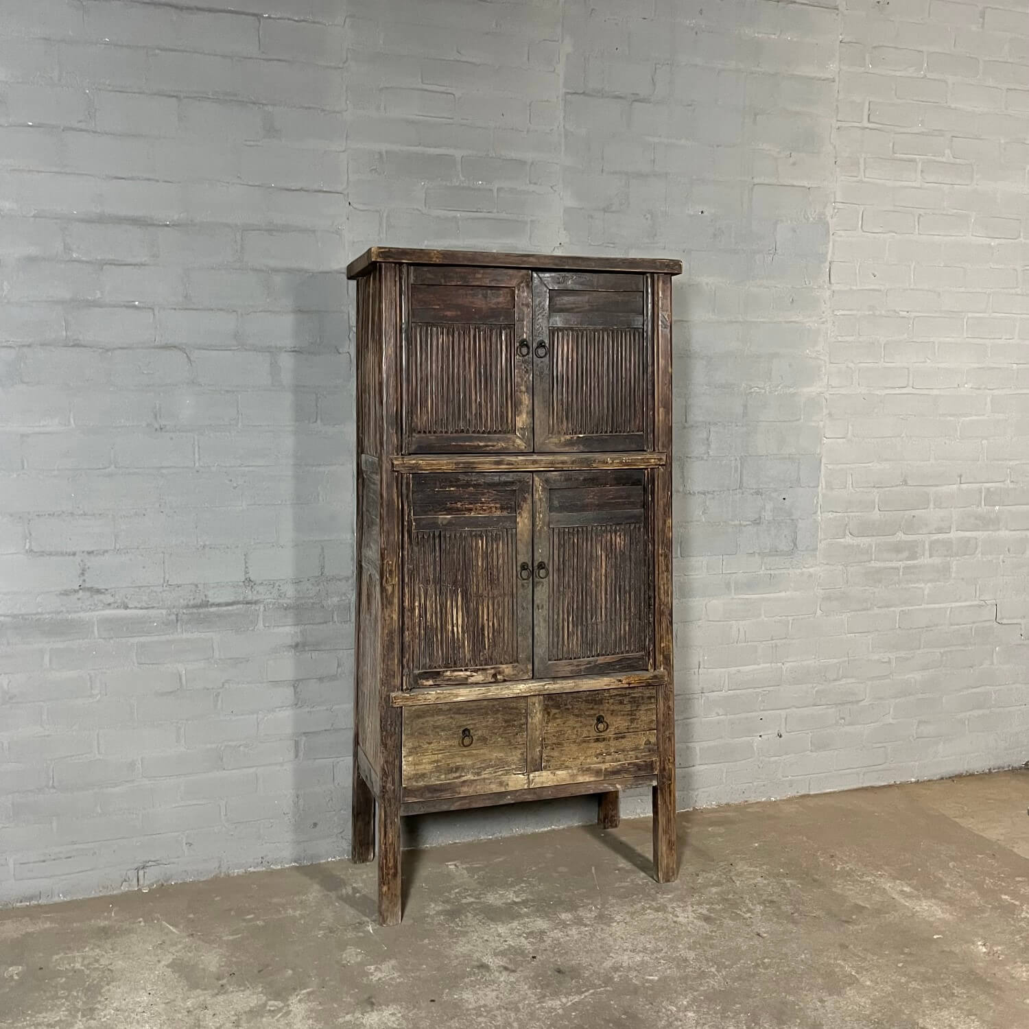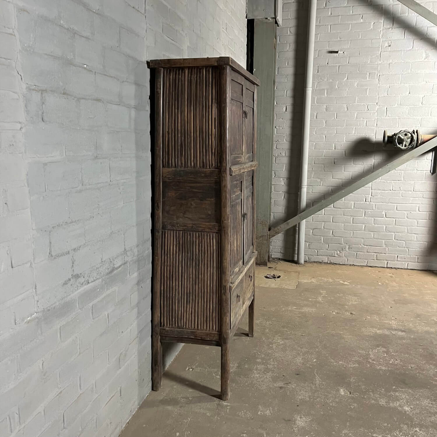 Alter chinesischer Schrank aus Ulmenholz und Bambusplatten. Der Schrank ist mit 4 Türen, 2 Schubladen und schönen Details ausgestattet. Die 4 Türen und die Seiten des Schranks sind aus Bambusplatten gefertigt.