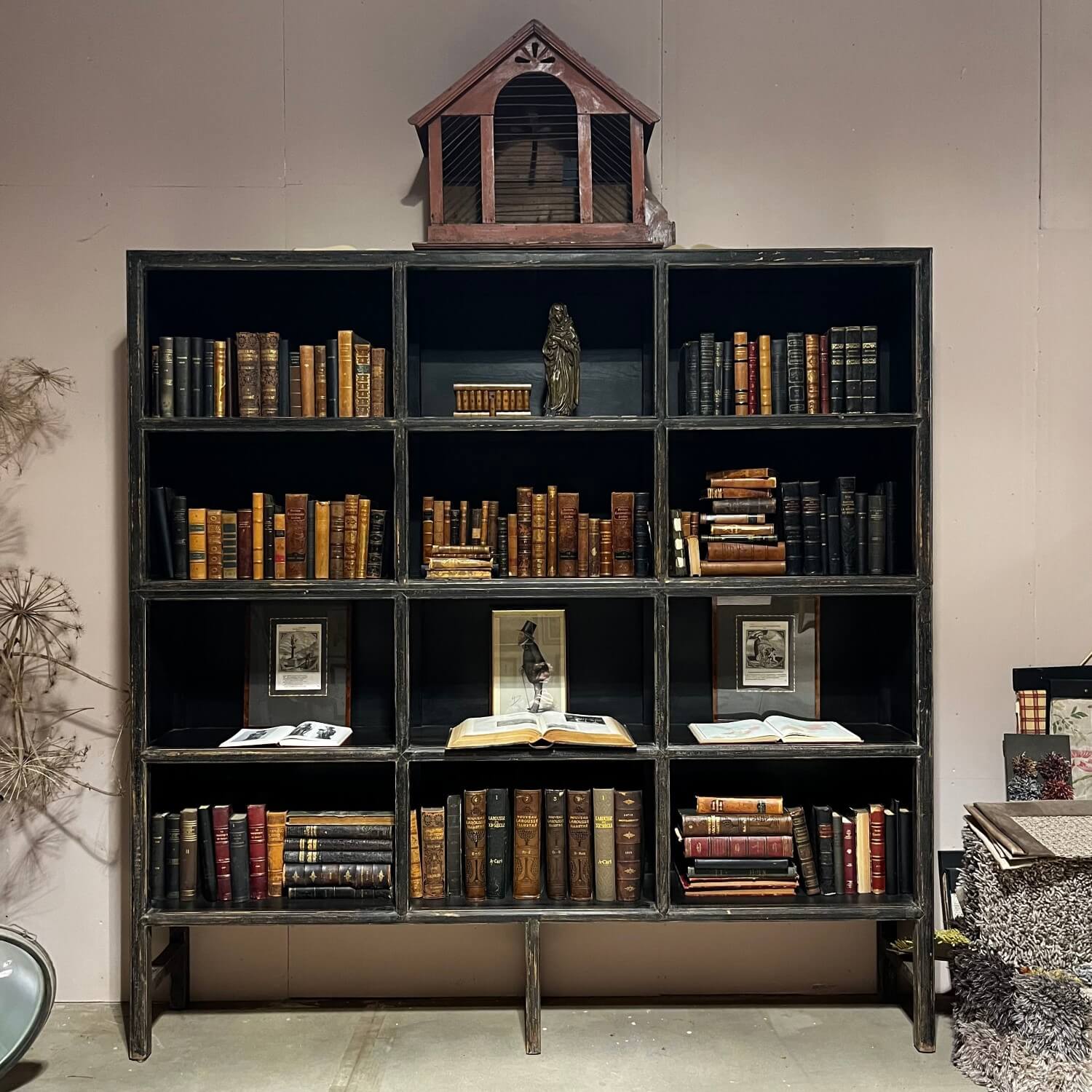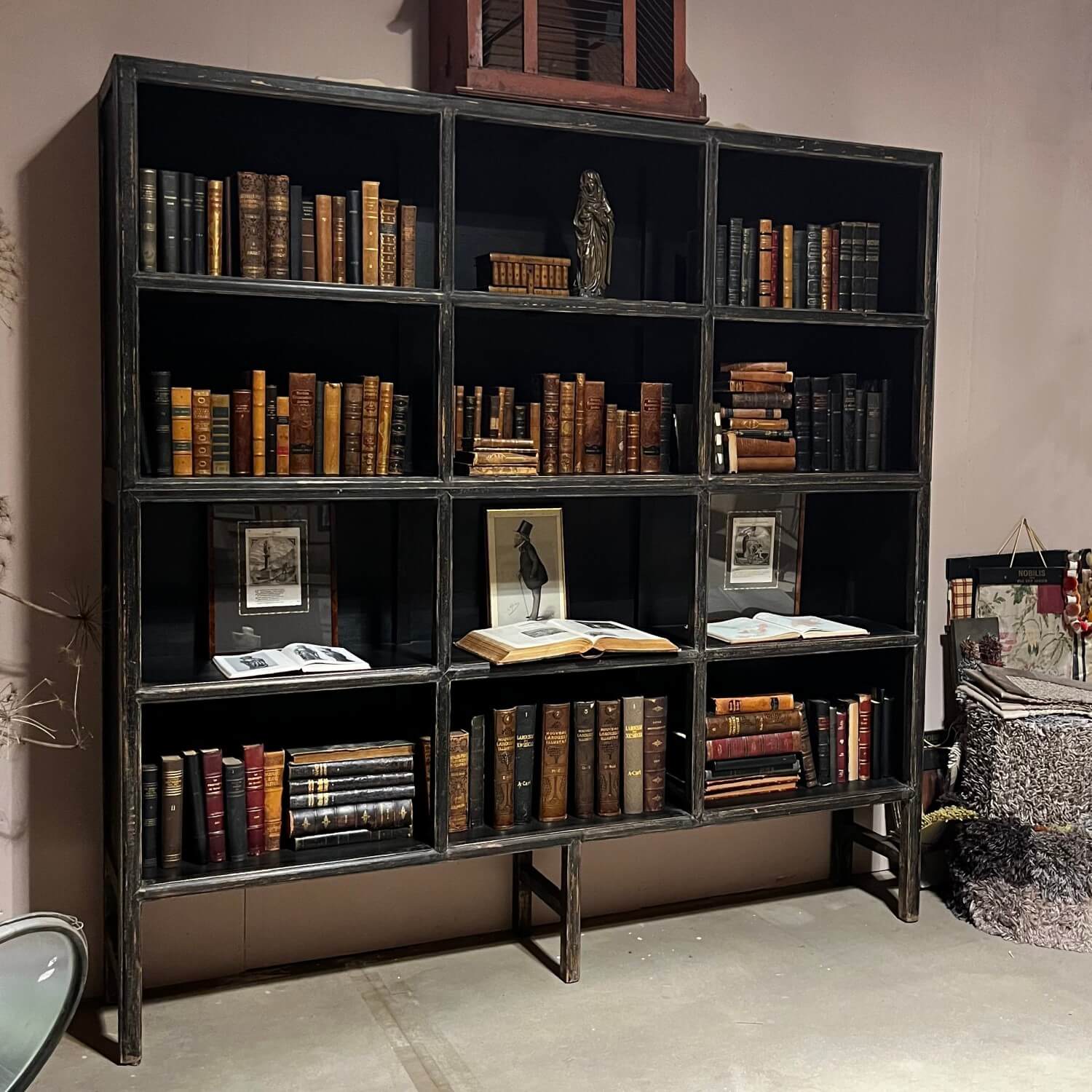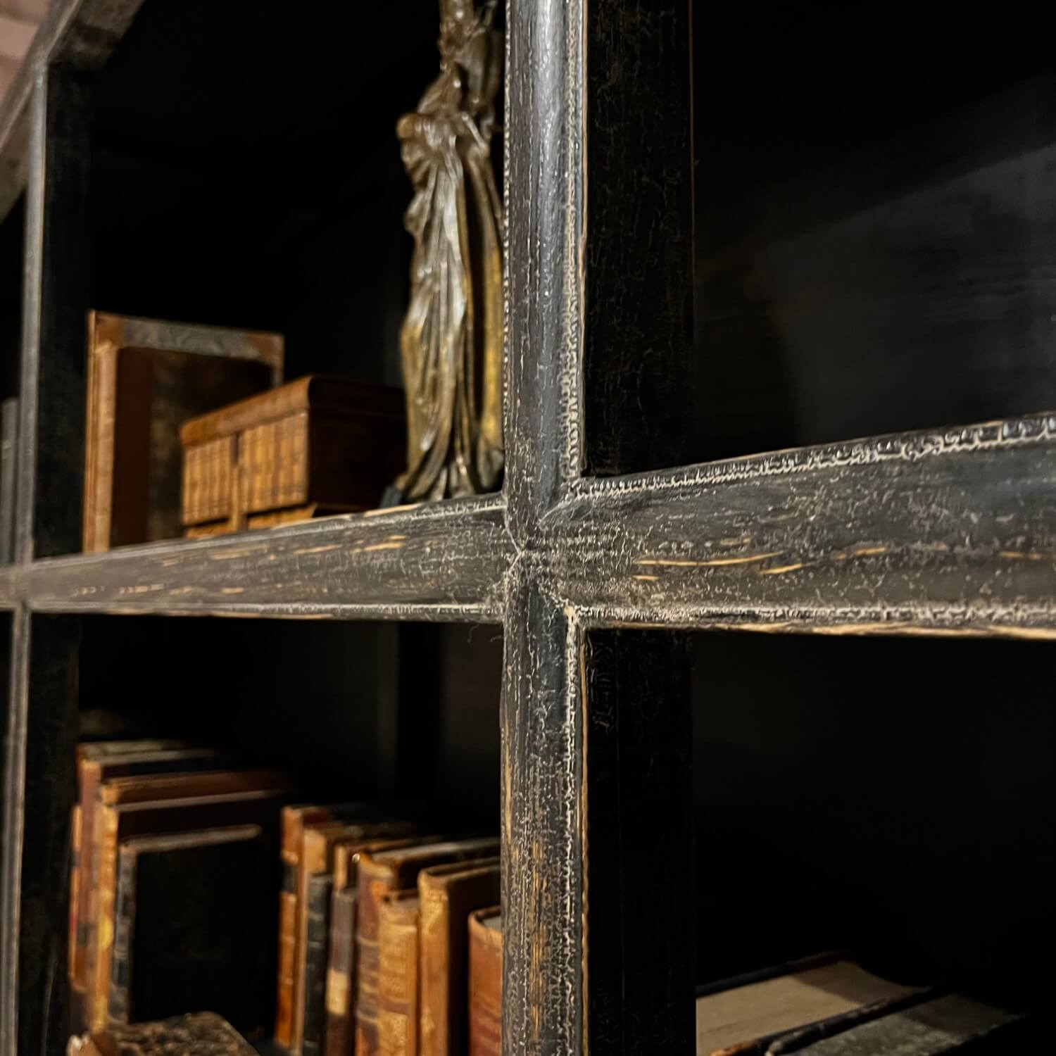 Großer alter chinesischer Wandschrank aus Ulme. Dieser Wandschrank verfügt über 12 gleiche Einlegeböden für die Präsentation von Gegenständen. Das Ulmenholz ist mit einer schwarzen Patina überzogen.