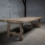 Spanischer Esstisch Salamanca im authentischen Kloster-Stil. Der Klostertisch wurde in unserer Werkstatt aus massiver alter Eiche aus alten Bauernhöfen gefertigt. Da die Eiche jahrzehntelang als Verkleidung in der Sonne gelegen hat, hat sie eine schöne Patina bekommen. Die Tischplatte ist 7 cm dick und fleckenfrei behandelt.
