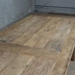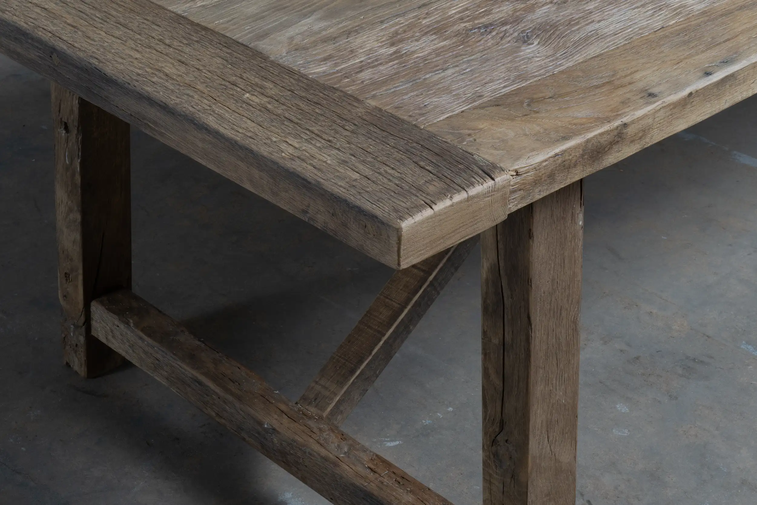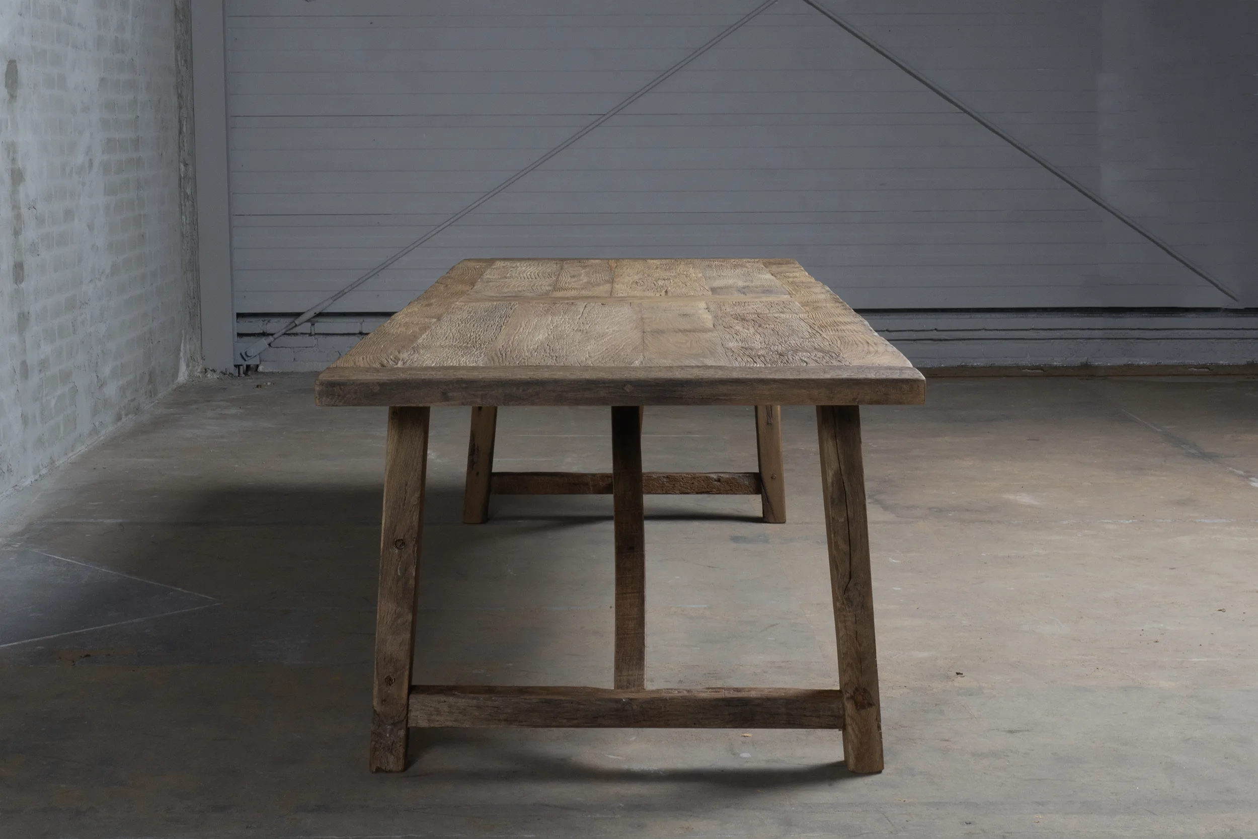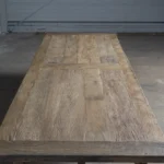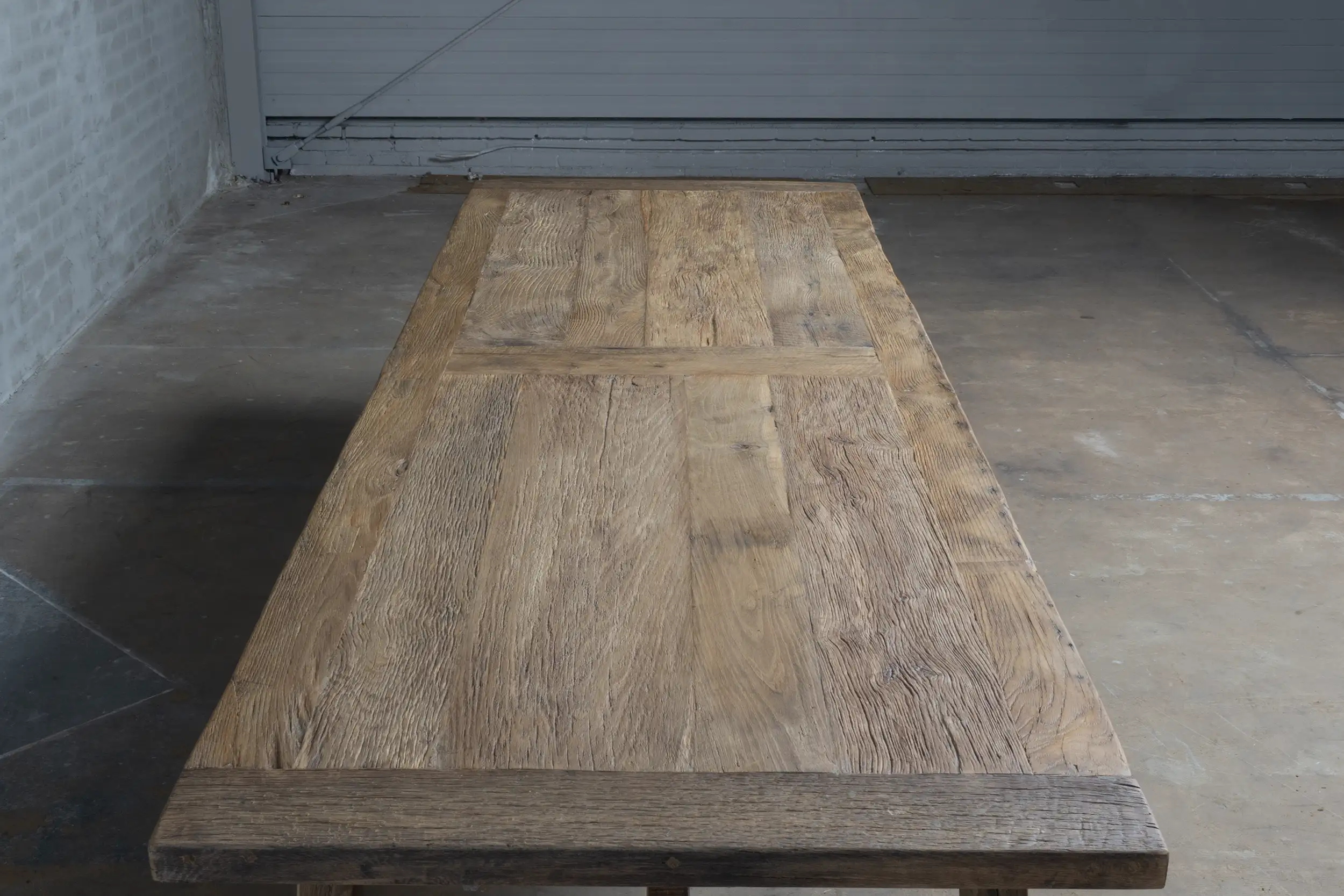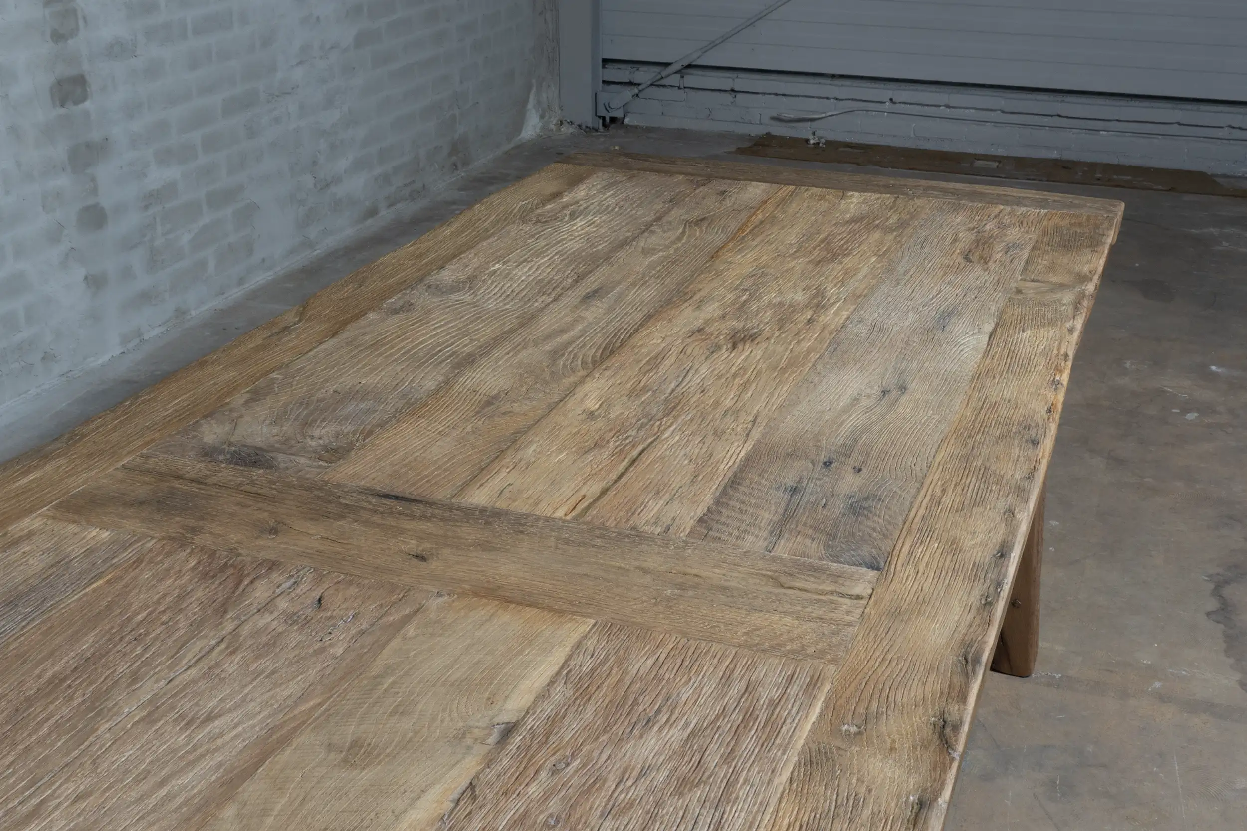 Die ca. 4 cm dicke Tischplatte ist aus dünnem, sonnenverbranntem, altem Eichenholz (von der Außenseite alter Balken gesägt) auf eine Möbelplatte geklebt. Die Außenkanten sind aus massiven Brettern gefertigt. Weil das Eichenholz jahrzehntelang als Wandverkleidung in der Sonne getönt wurde, hat es eine schöne Patina bekommen!