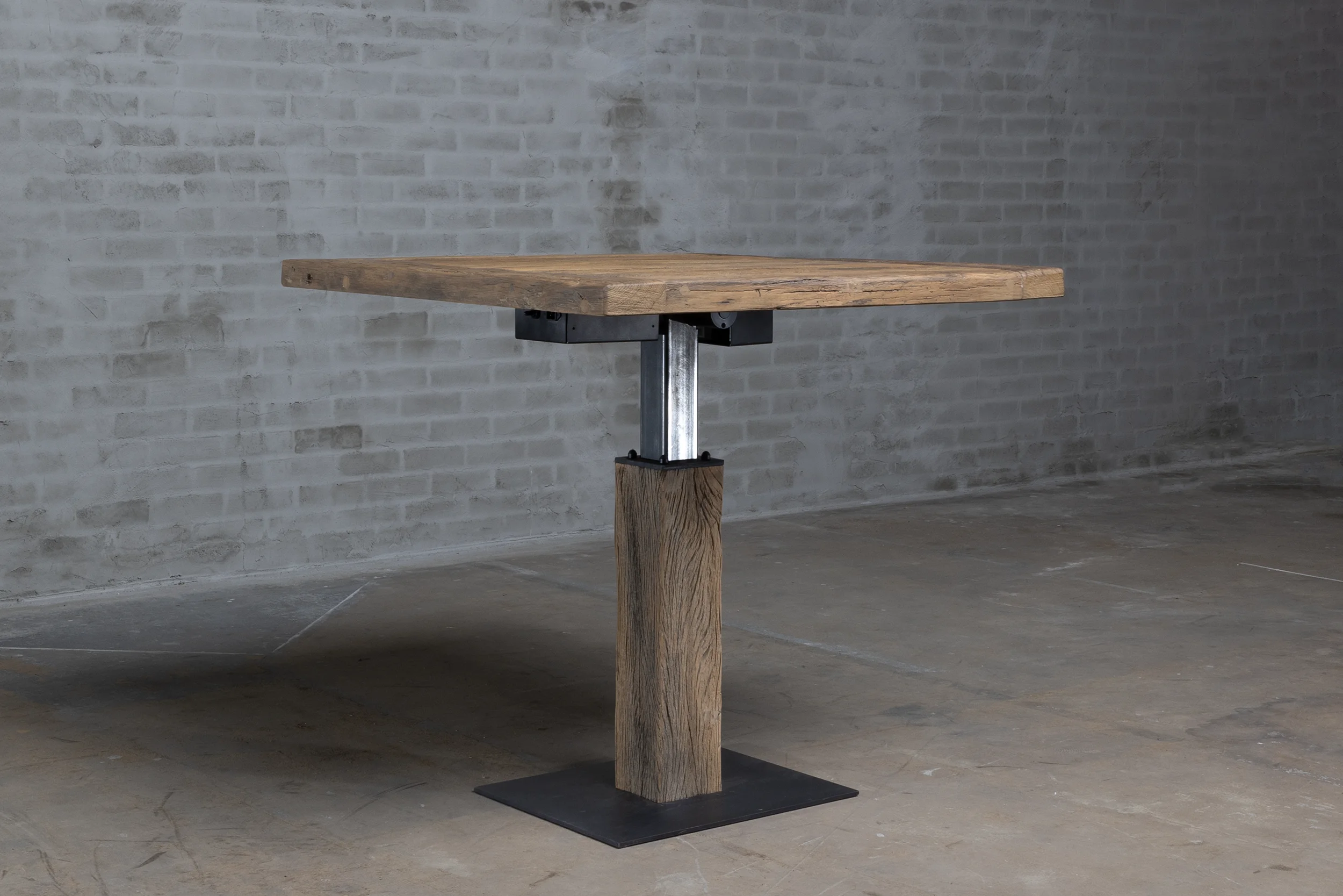 Der Bartisch aus Holz “Bastro” mit Volta elektrisch höhenverstellbarem Fuß. Dank des Höhenverstellmechanismus im Bein kann die Tischplatte von 75 cm bis ca. 115 cm Höhe verstellt werden. Dadurch kann er sowohl als Esstisch (niedrig) als auch als Stehtisch (hoch) verwendet werden.