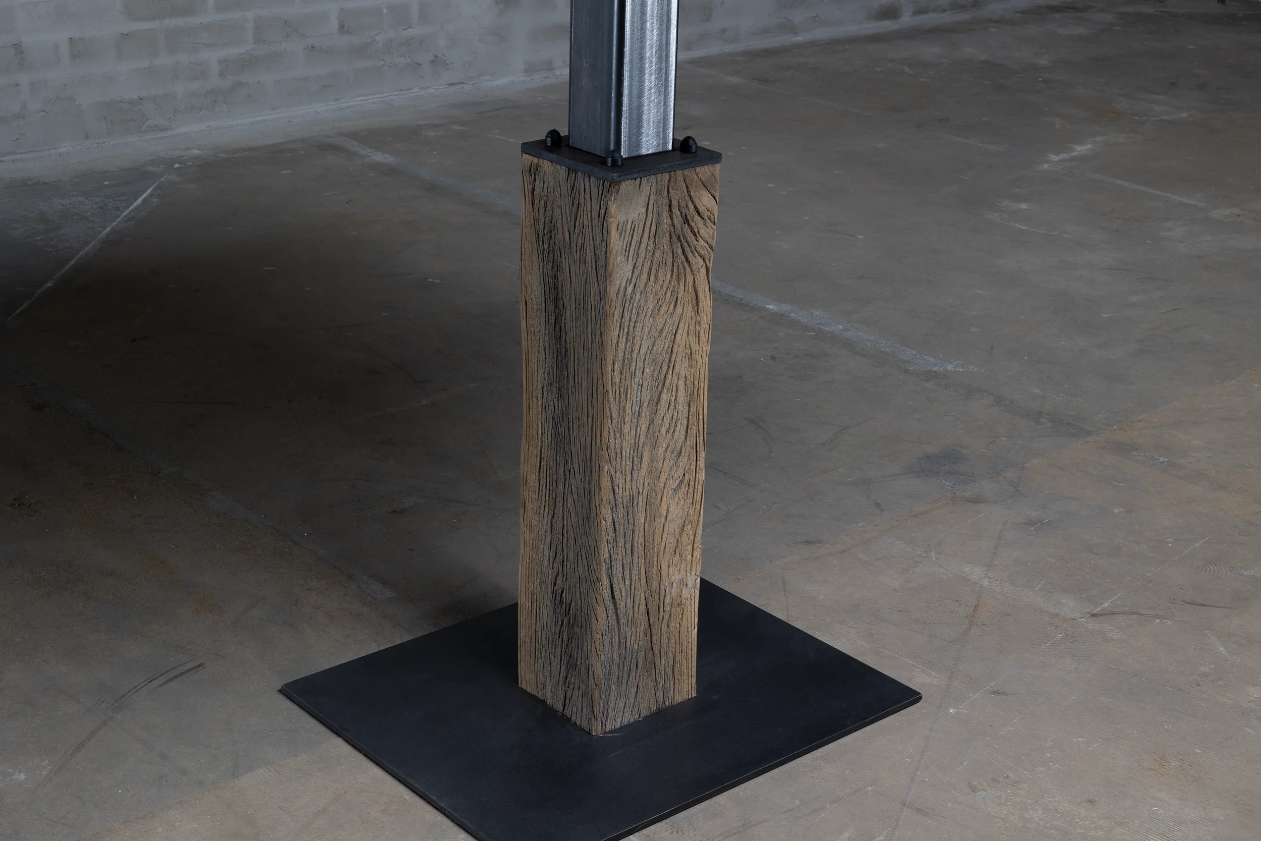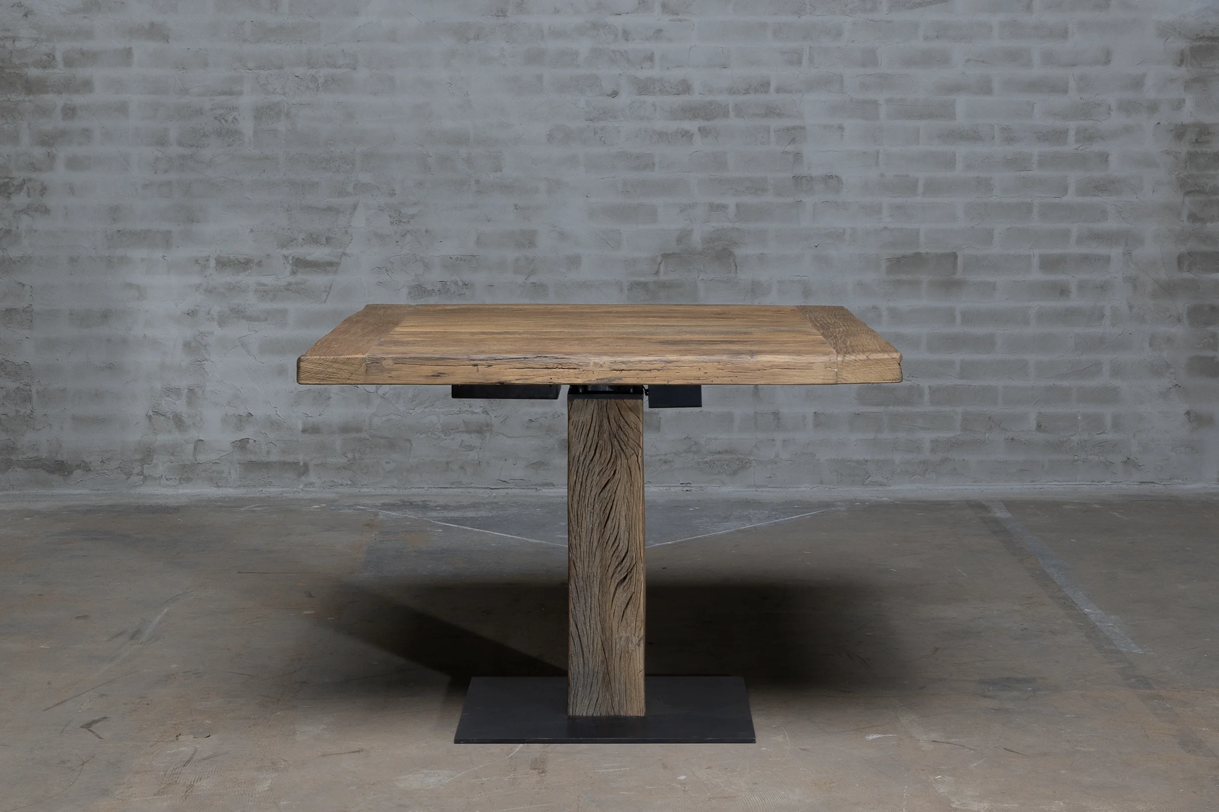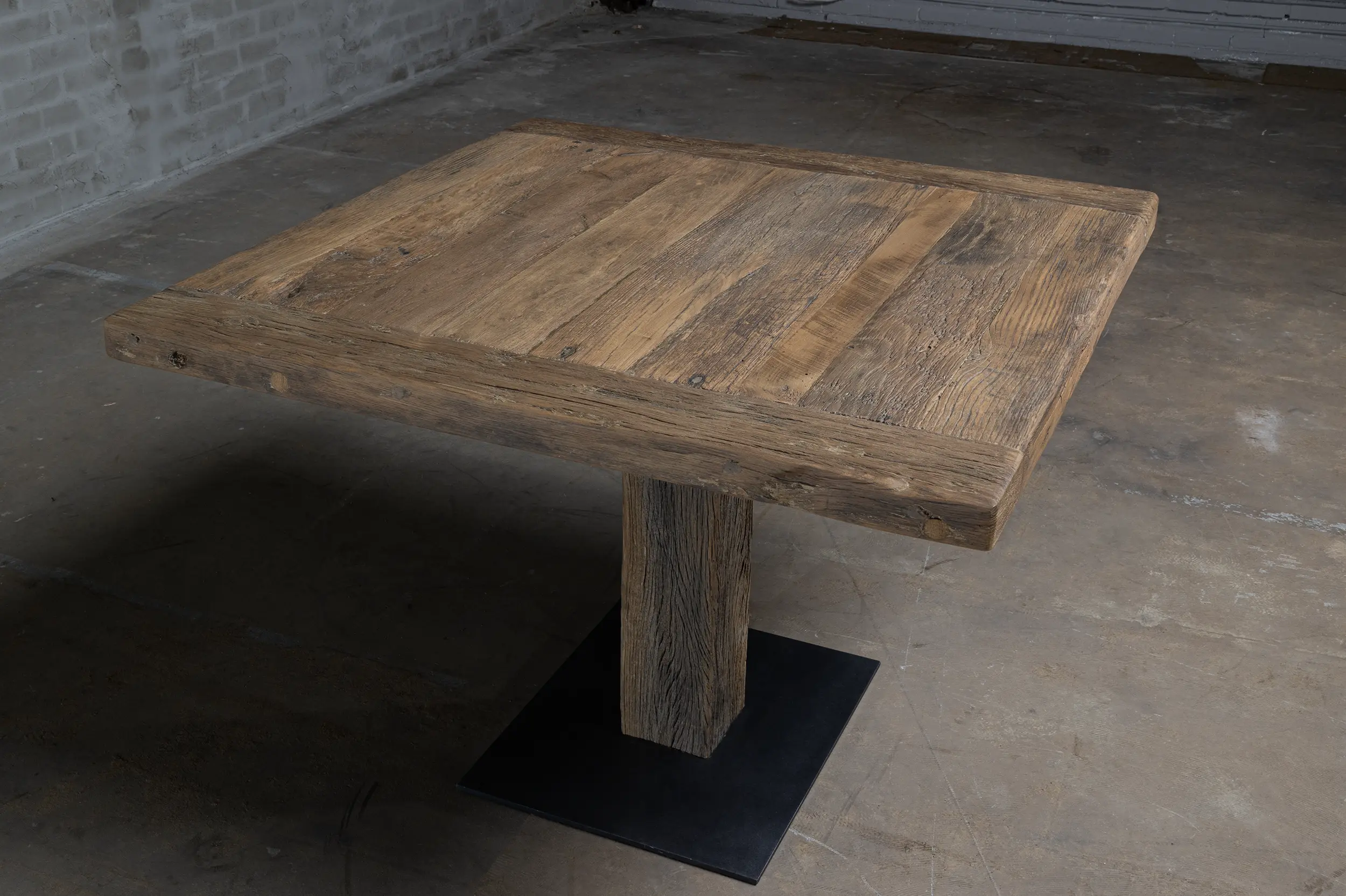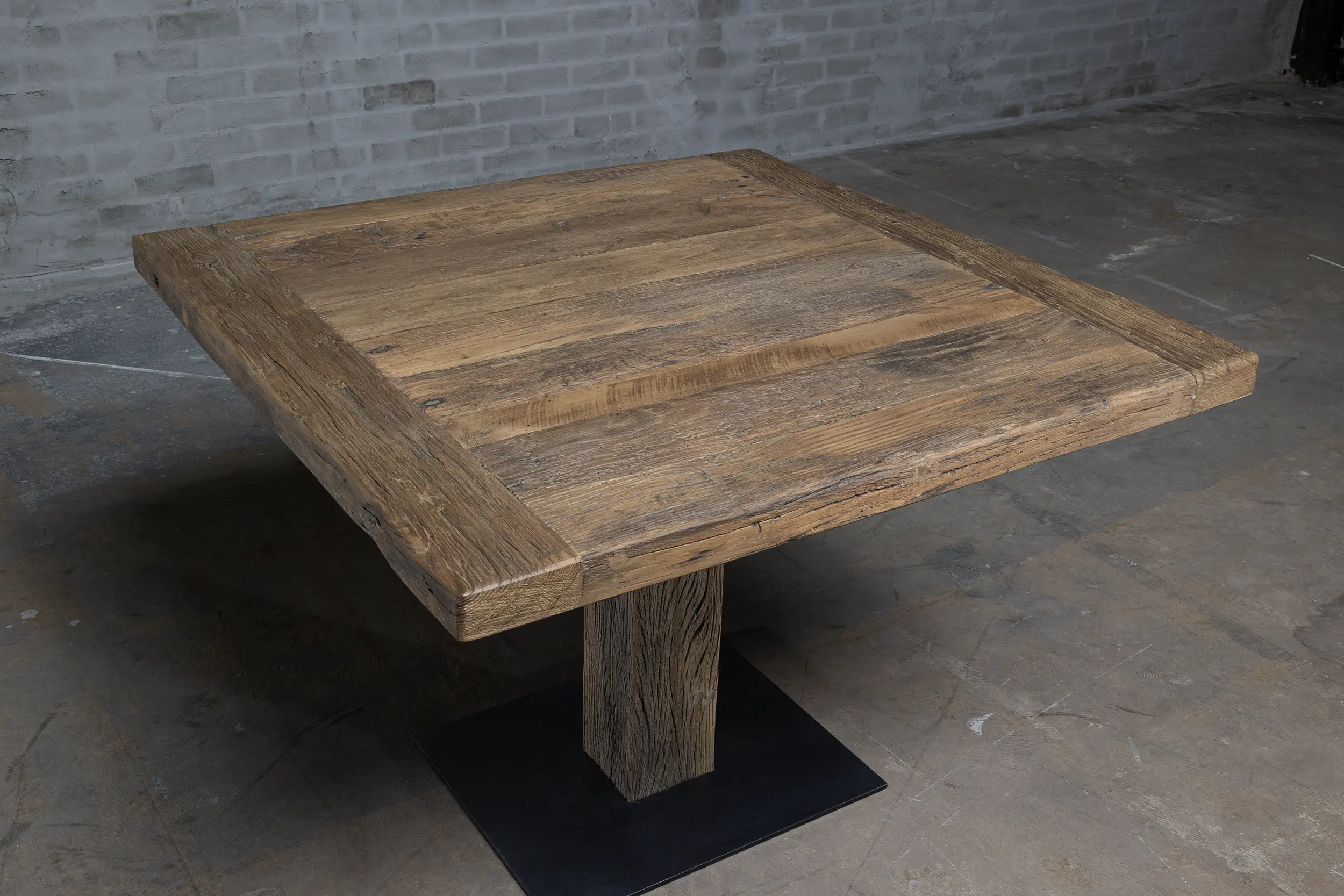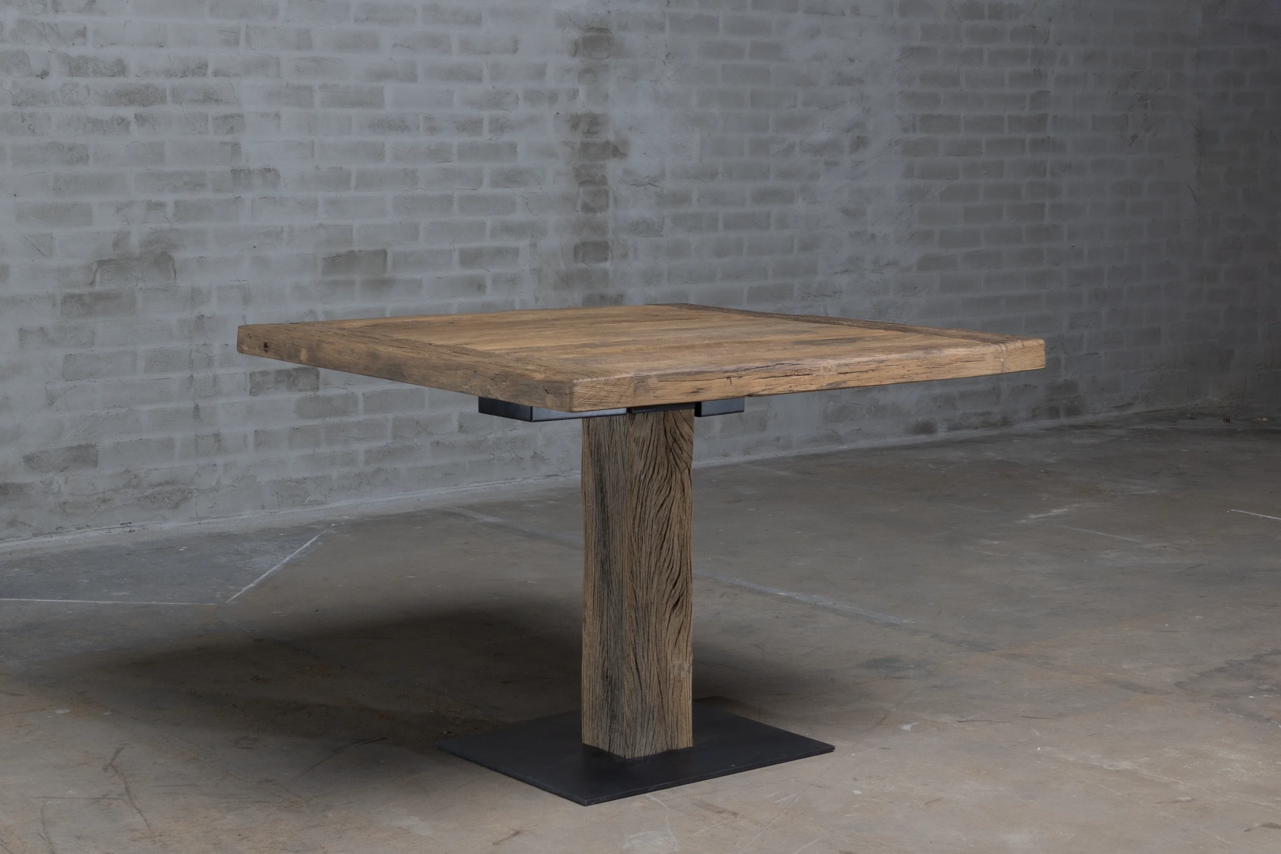 Die Tischplatte besteht aus dünnem, sonnenverbranntem altem Eichenholz (von der Außenseite alter Balken geschnitten), das auf eine Möbelplatte geklebt ist. Die Außenkanten bestehen aus massiven Bohlen. Da die Eiche jahrzehntelang als Verkleidung sonnengefärbt war, hat sie eine schöne Patina bekommen. Tischplatte und Tischbein aus Holz sind fleckenfest behandelt. Eine andere Holzfarbe oder -art kann besprochen werden.