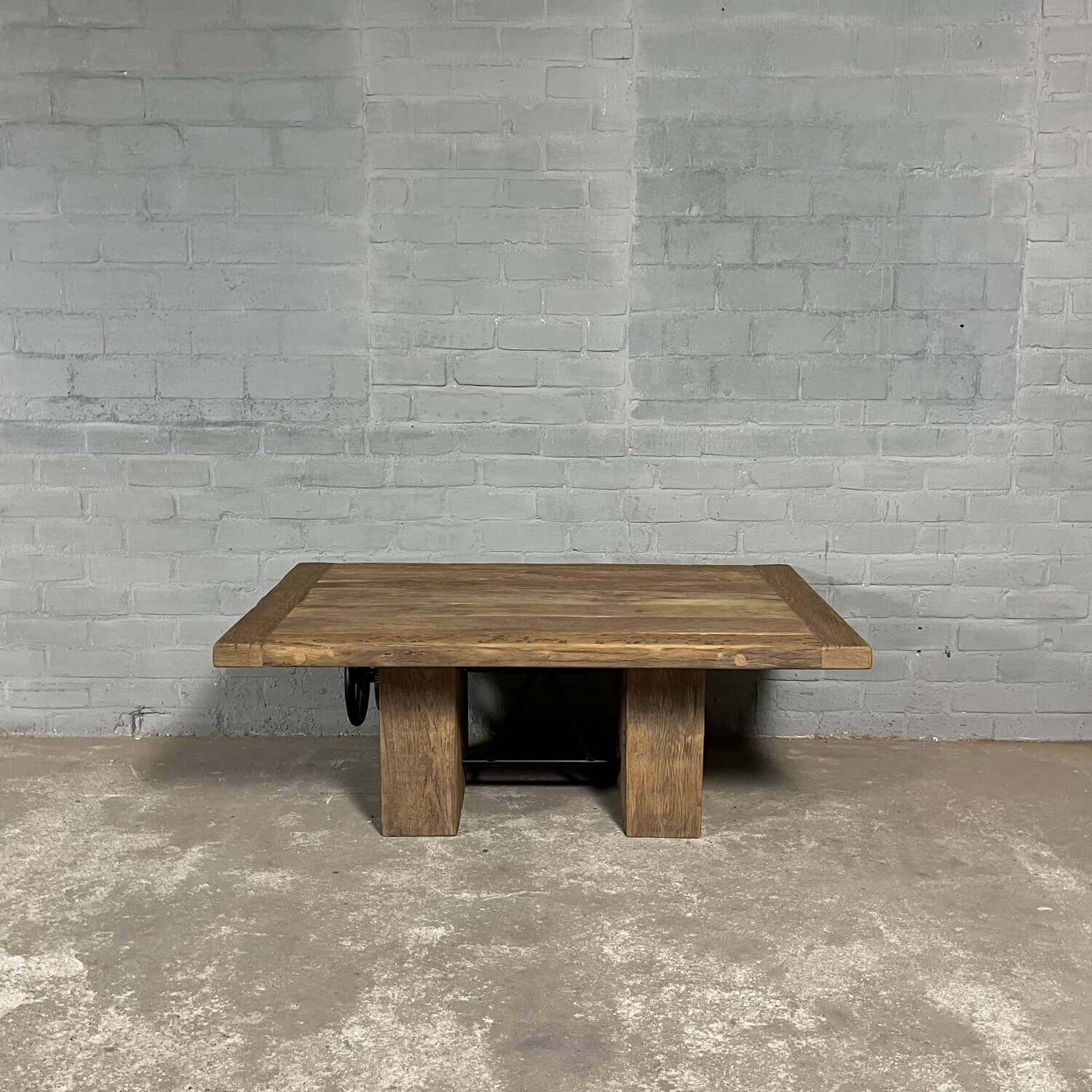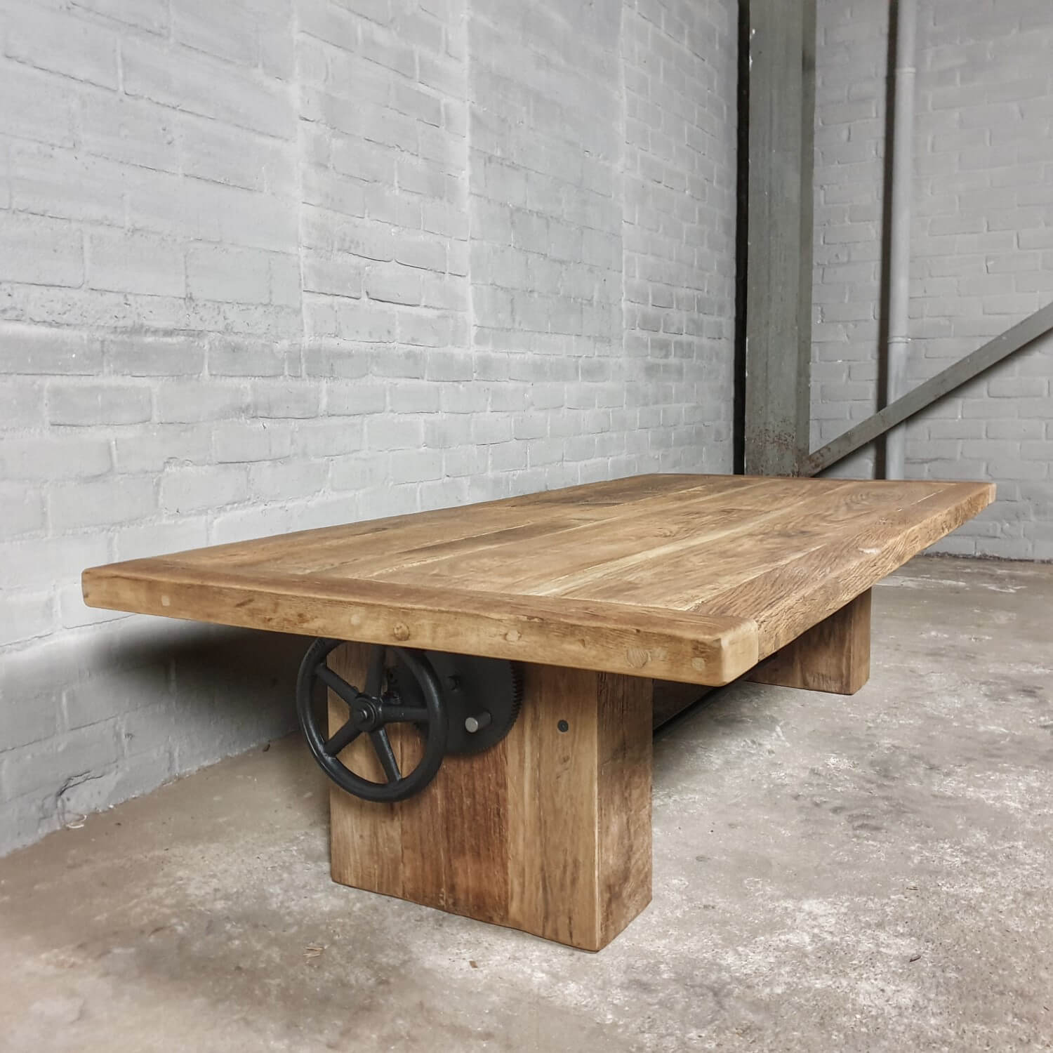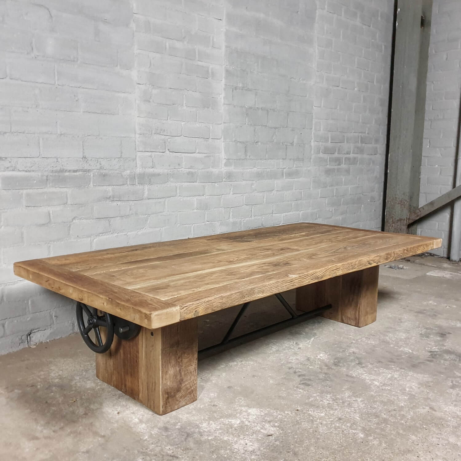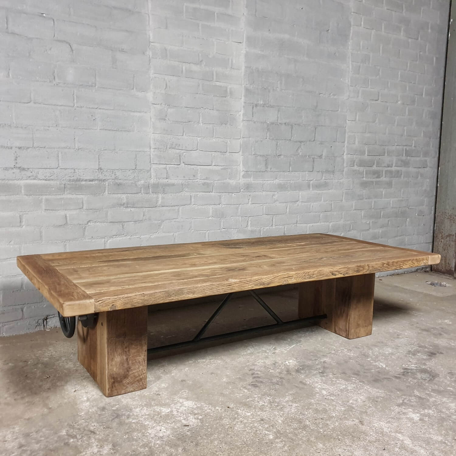 Dieser stilvolle Couchtisch aus Alter Eiche ist höhenverstellbar und kann daher auch als Esstisch verwendet werden.