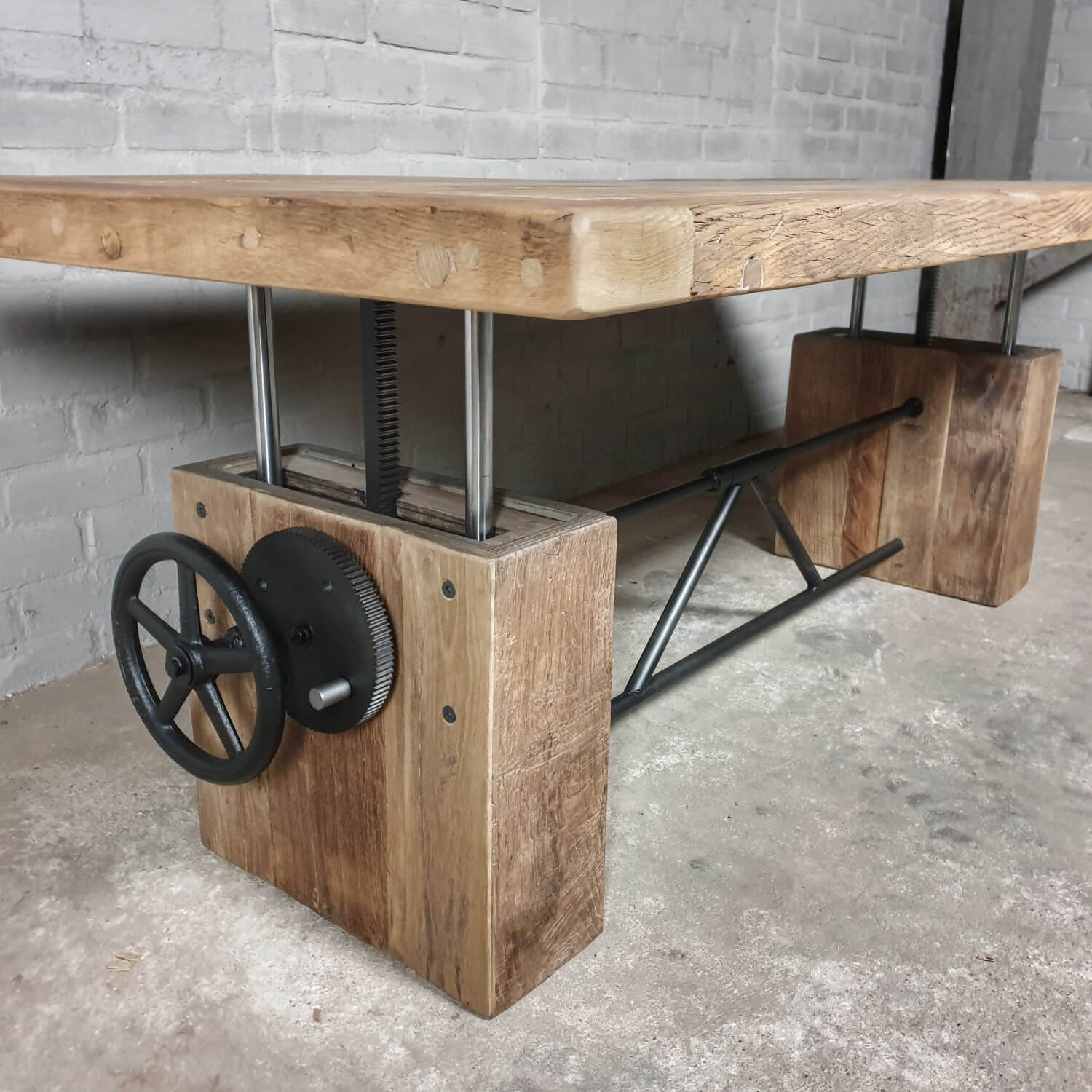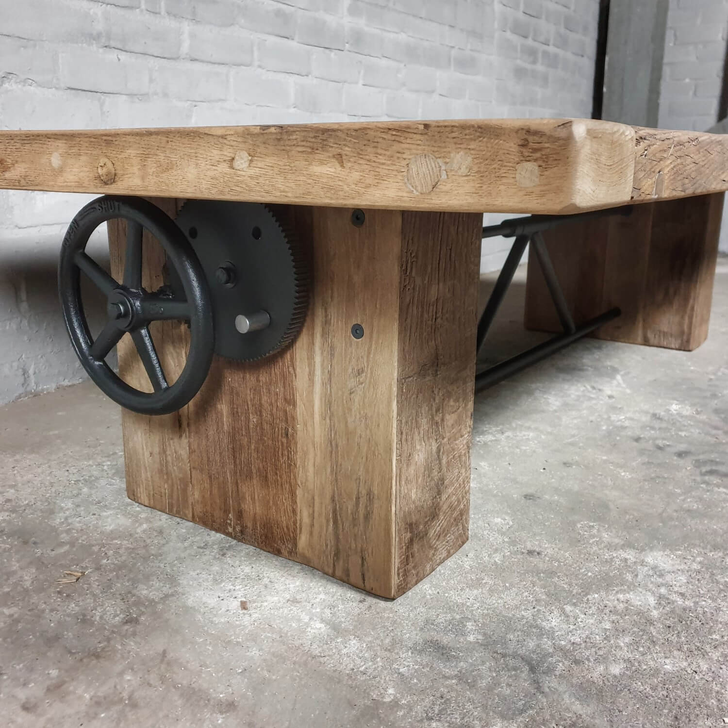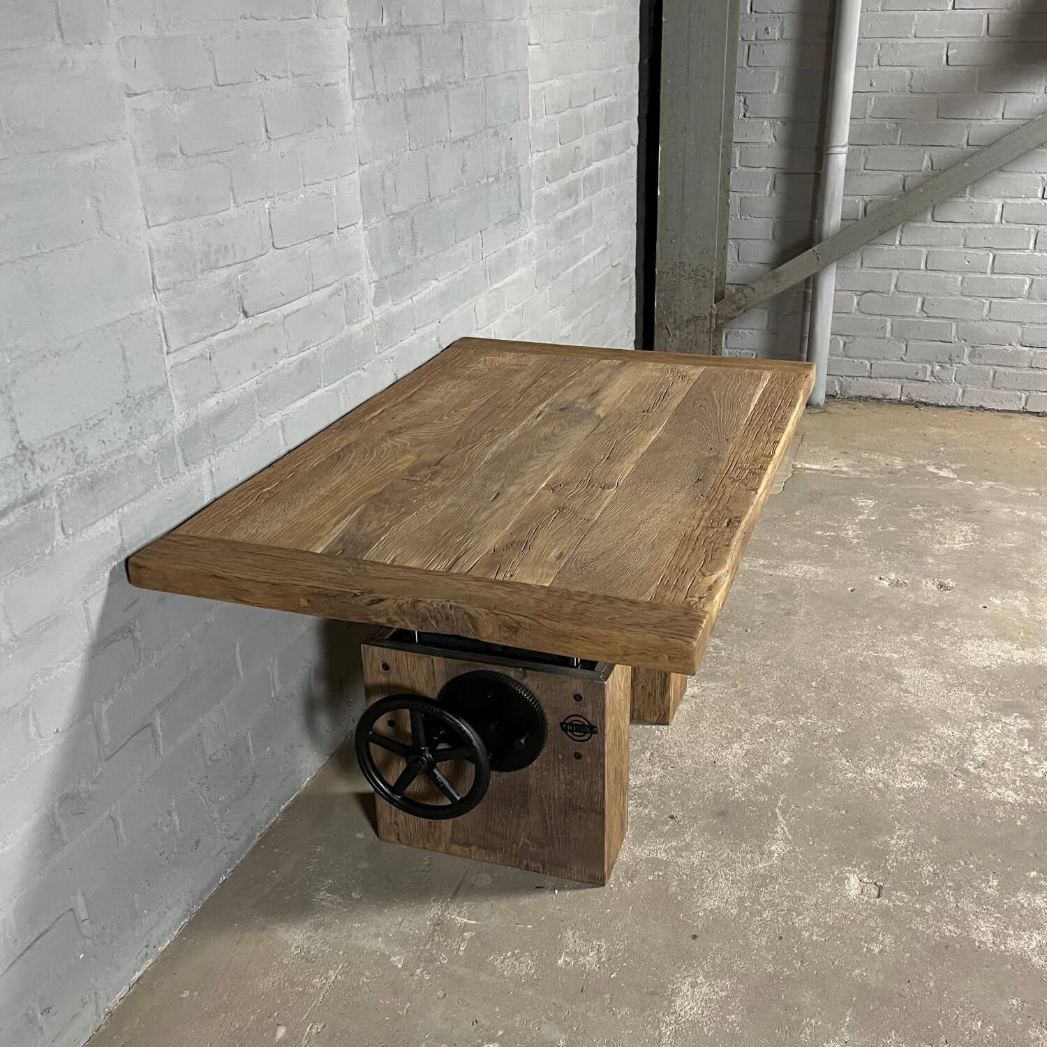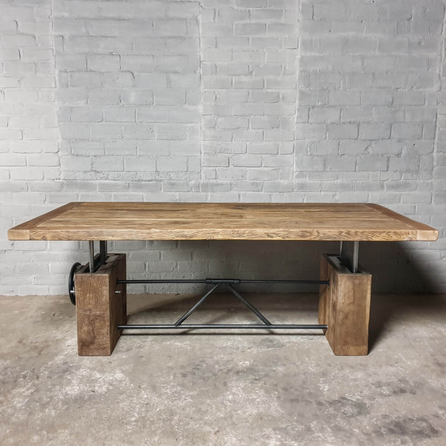 Dieser stilvolle Couchtisch aus Alter Eiche ist höhenverstellbar und kann daher auch als Esstisch verwendet werden.