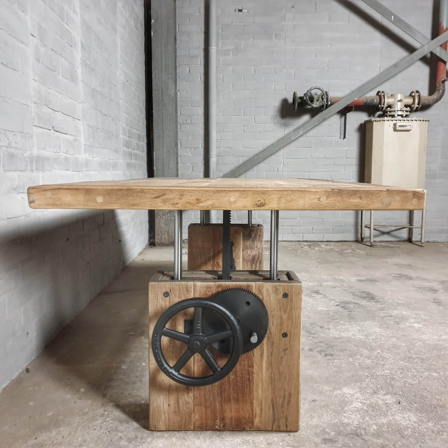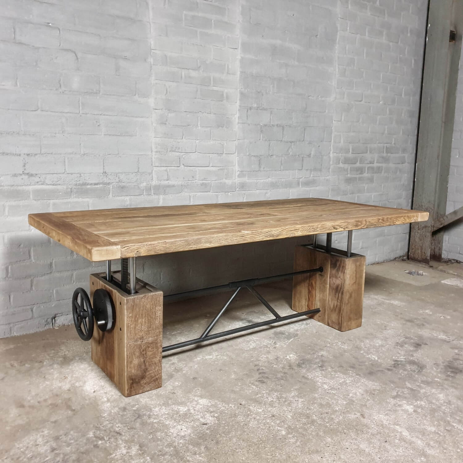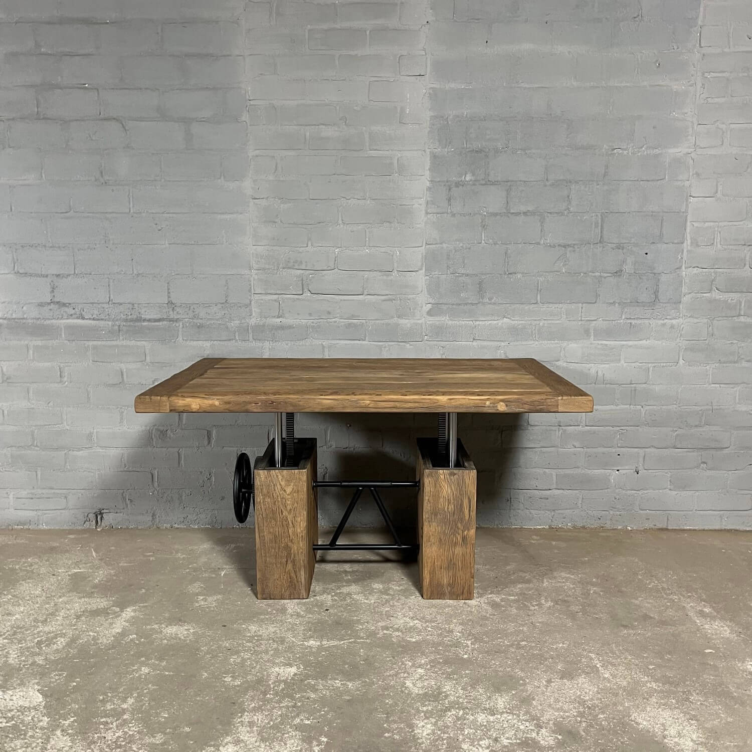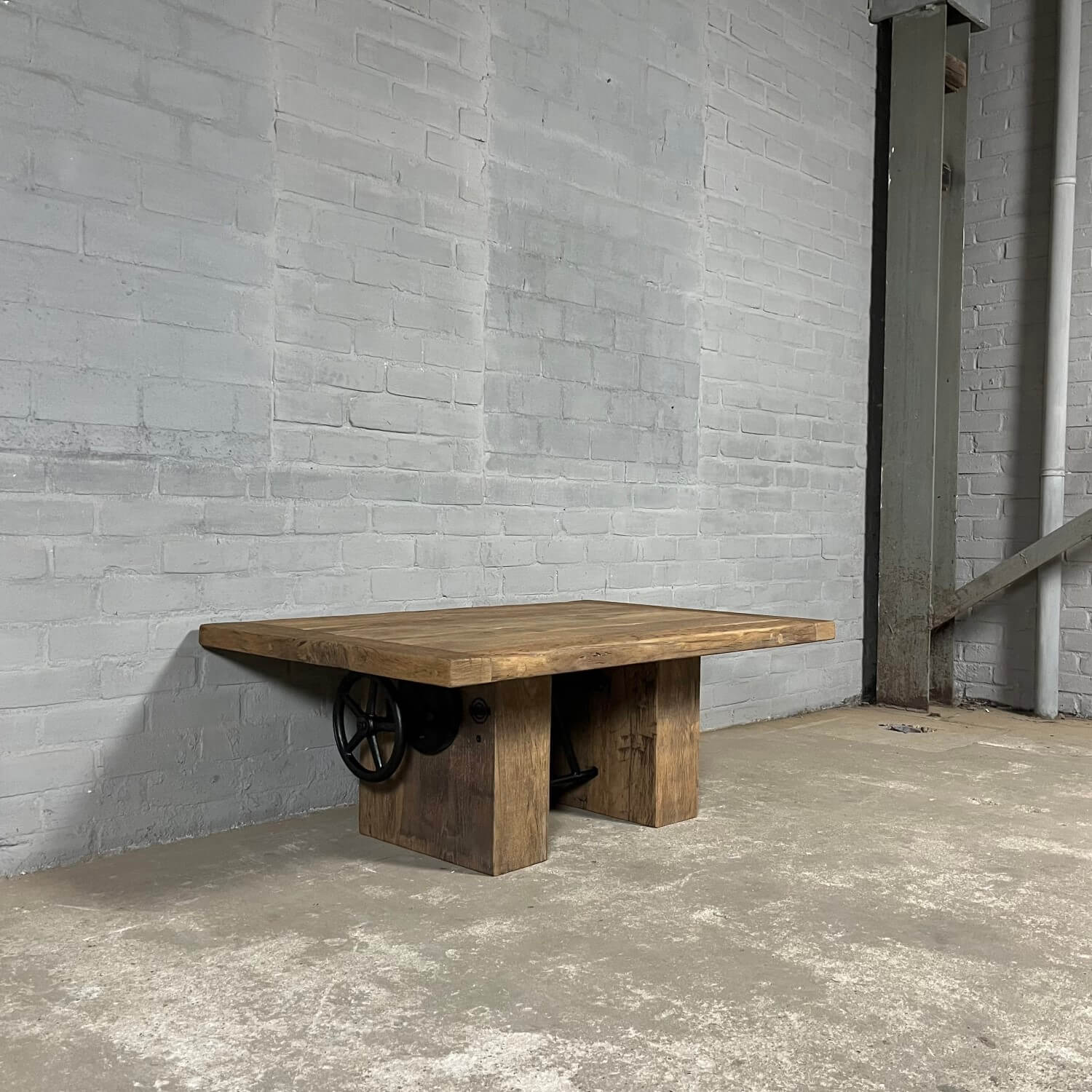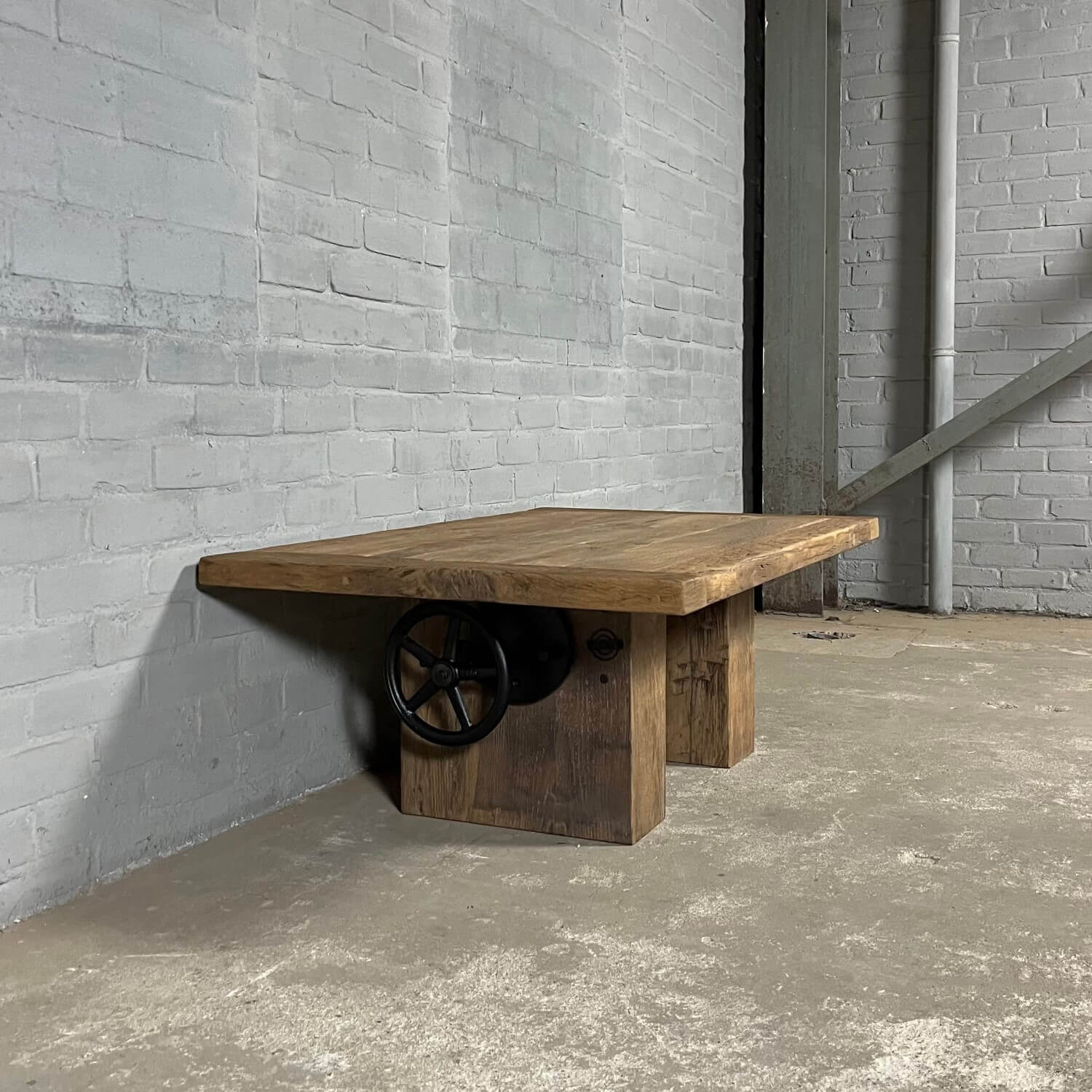 Dieser stilvolle Couchtisch aus Alter Eiche ist höhenverstellbar und kann daher auch als Esstisch verwendet werden.