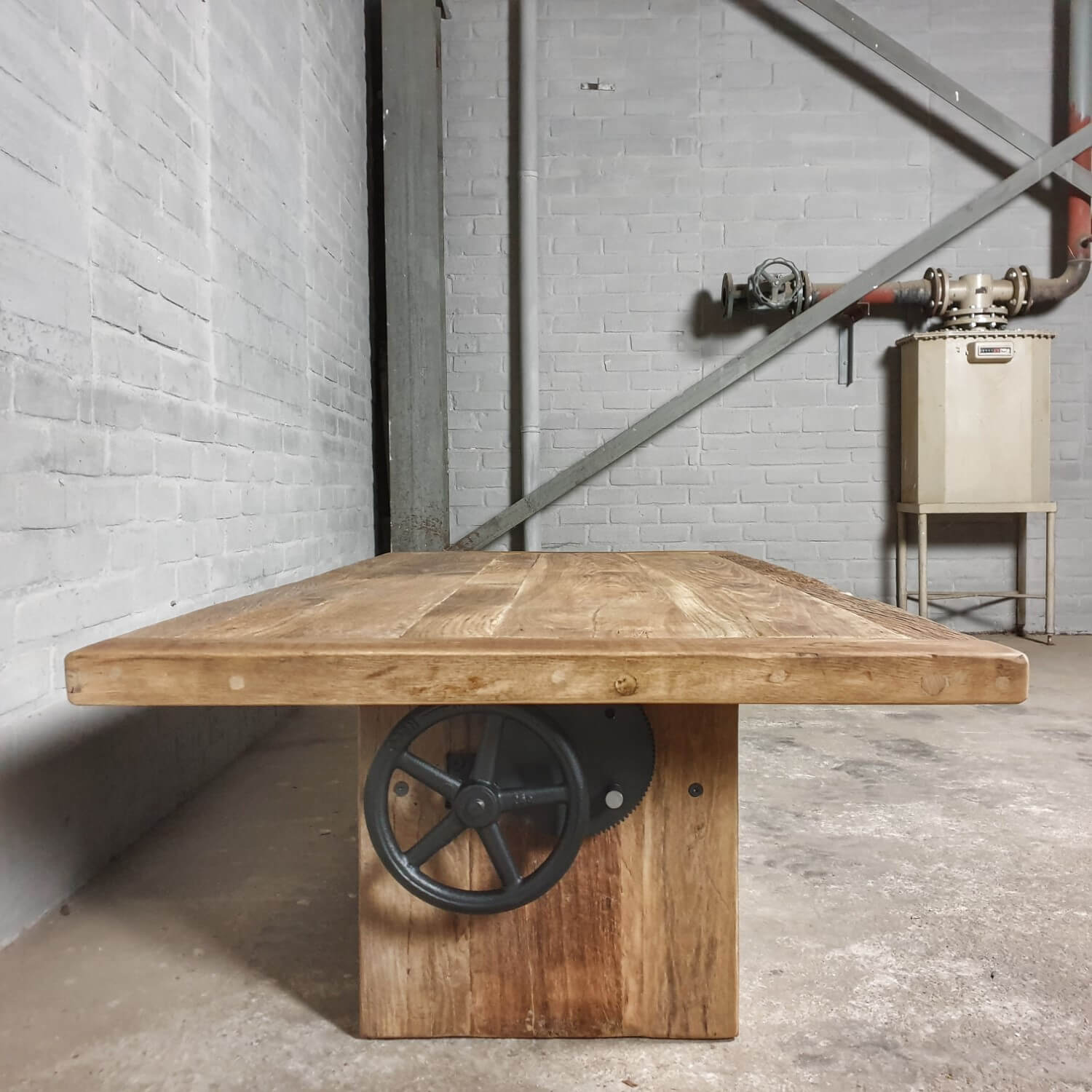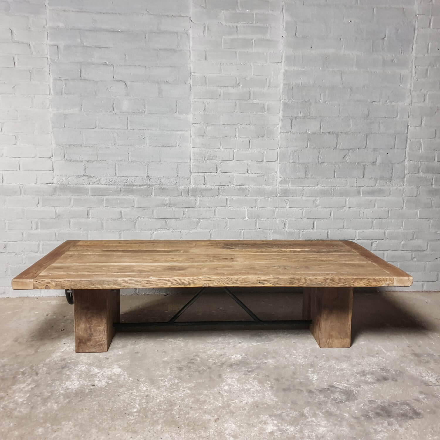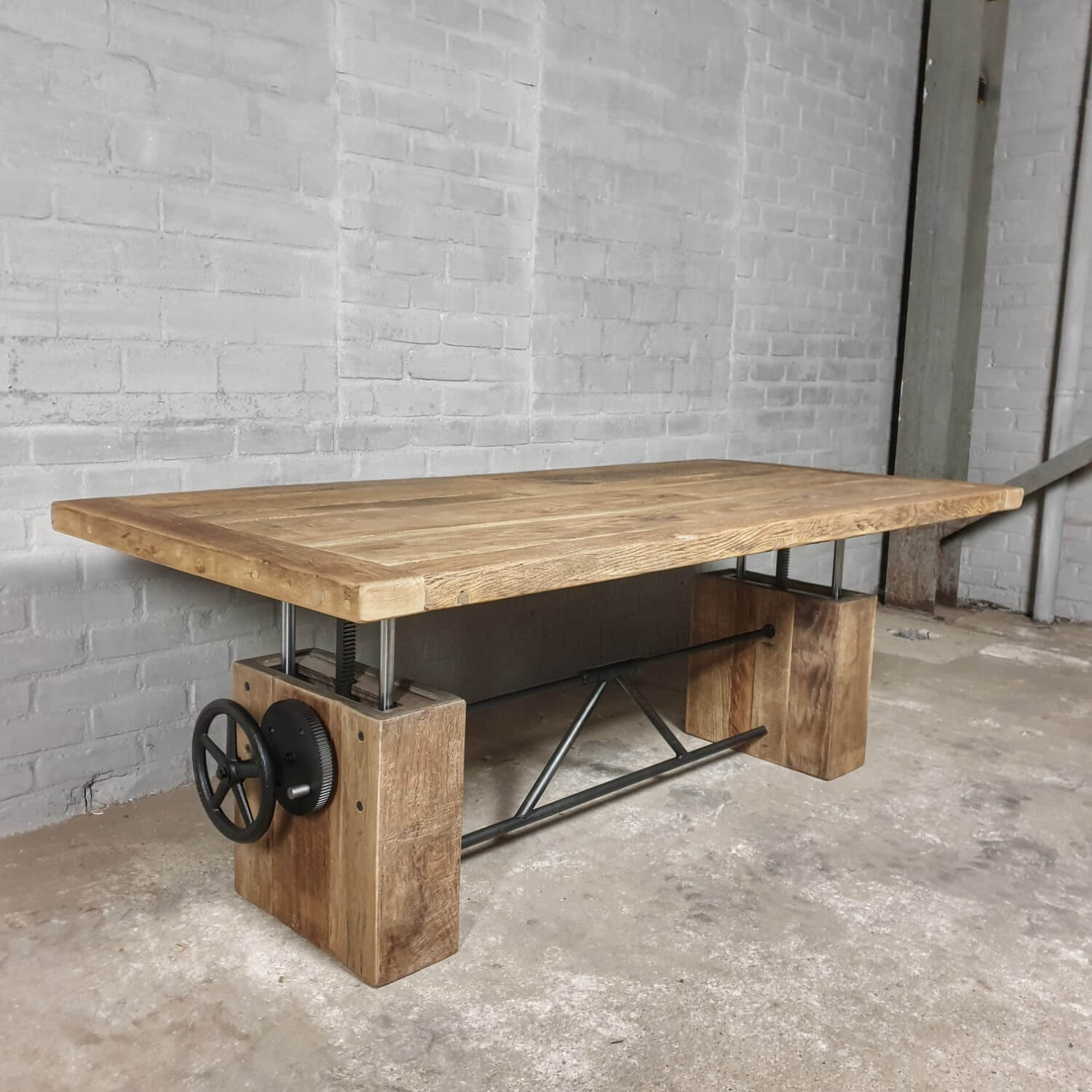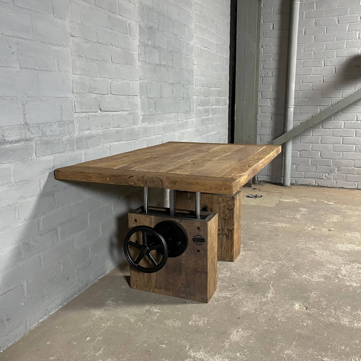 Dieser stilvolle Couchtisch aus Alter Eiche ist höhenverstellbar und kann daher auch als Esstisch verwendet werden.