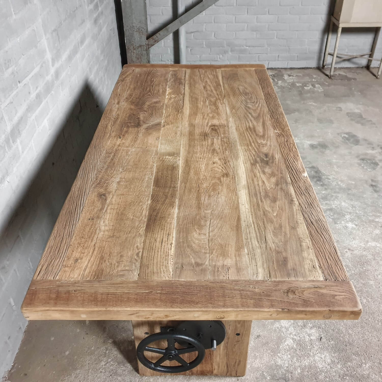 Die Tischplatte von 5cm dick und das Tischgestell sind verarbeitet aus dünnem sonnenverbrannten Altholz Eichen Brettern (gesägt aus die äußere Schicht alten Balken) die auf einer Möbelbauplatte geklebt sind.