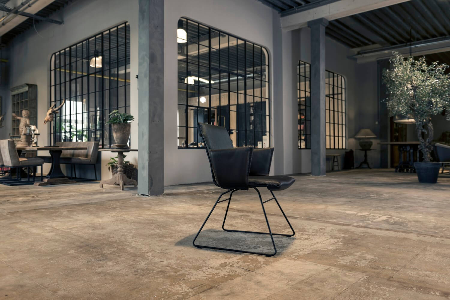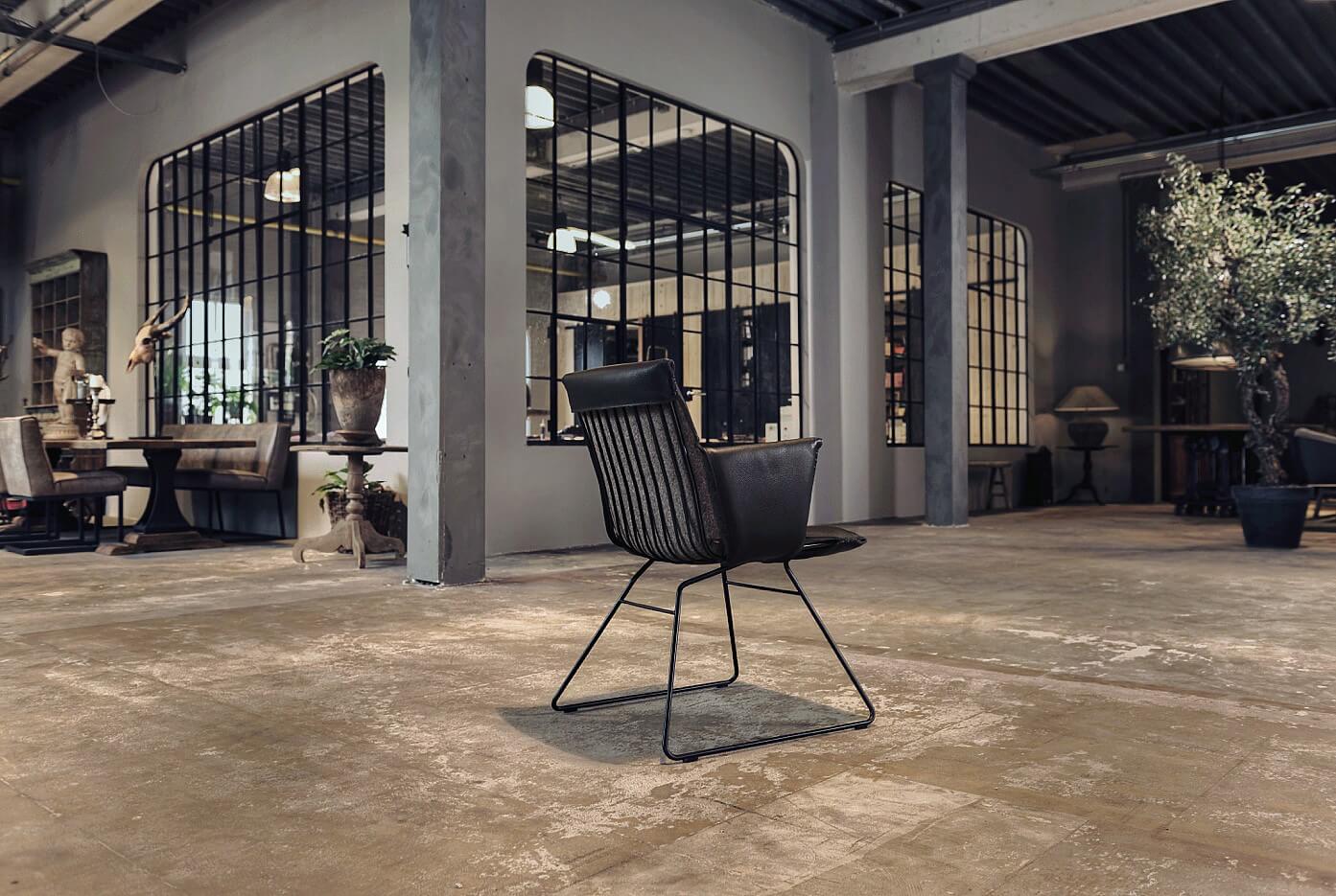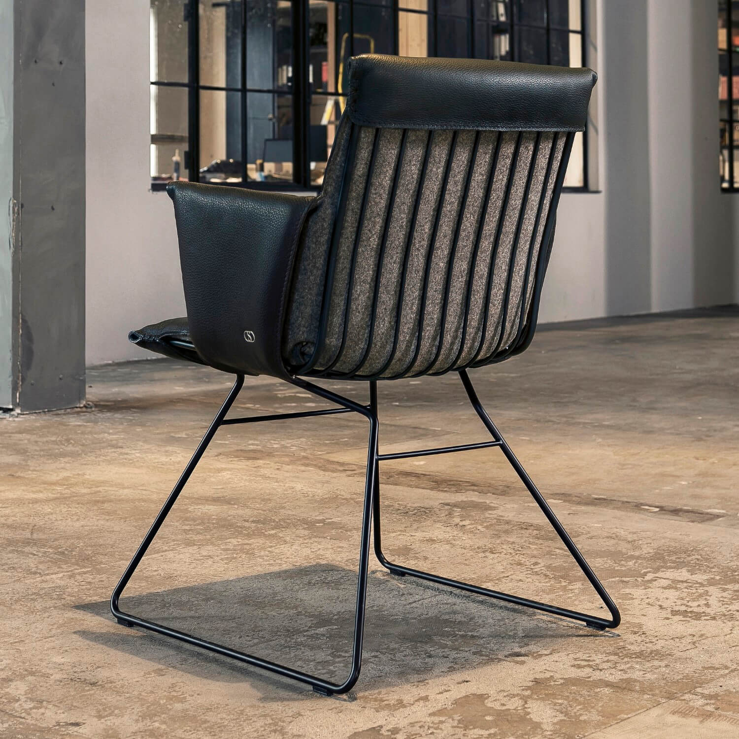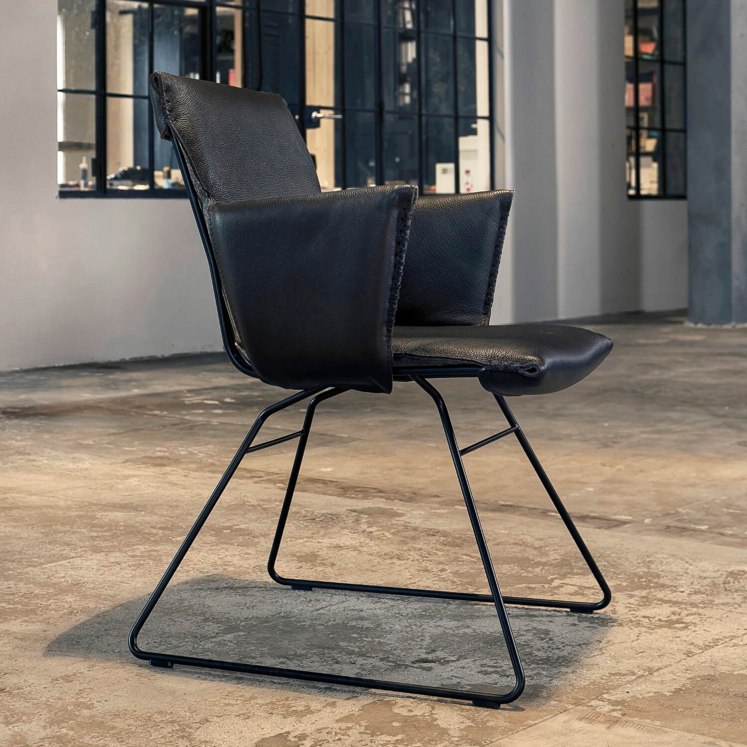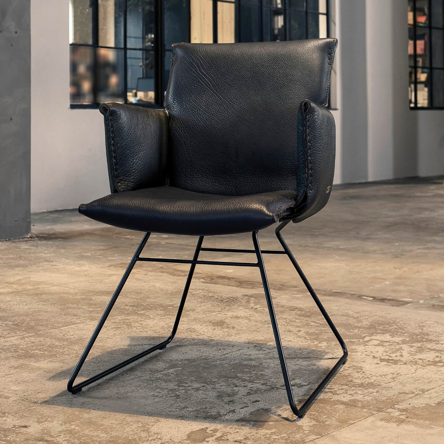 Dieses Design stammt vom Designstudio Greutmann Bolzern! Und das kann man sehen: ein filigranes Untergestell aus Stahl in Kufenform tragt den einladenden Sitzbereich. Eine dünne Drahtkonstruktion fungiert beim DS-515 als formbindender Rahmen, über den eine gepolsterte Lederhusse gezogen ist. Das gefaltete und umgeschlagene Leder definiert die Formgebung.