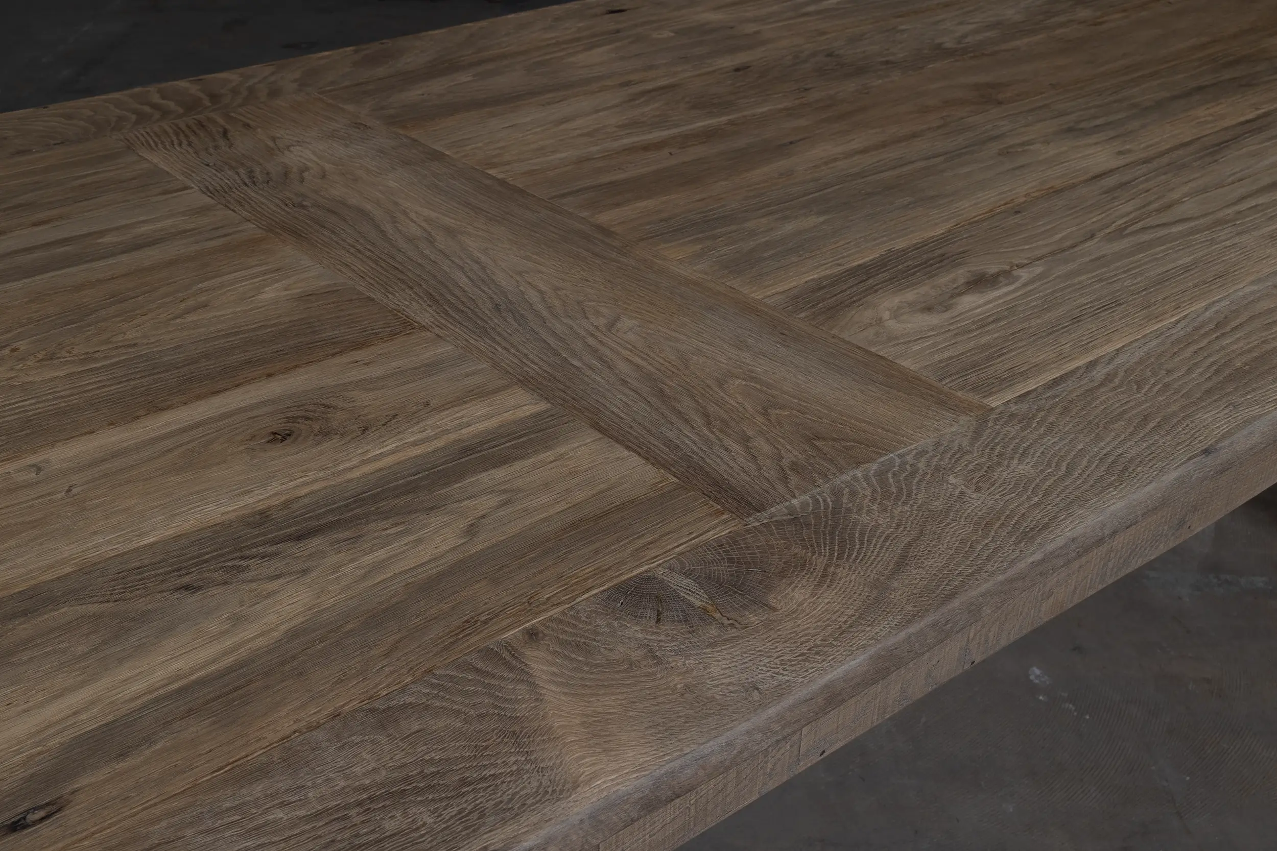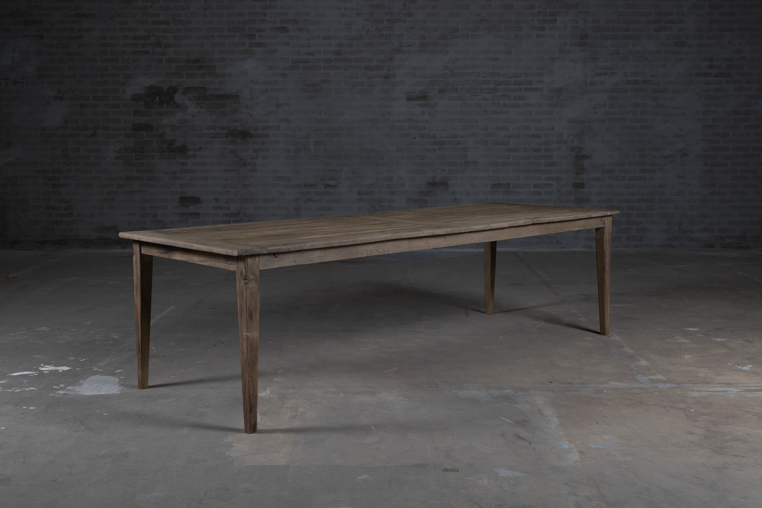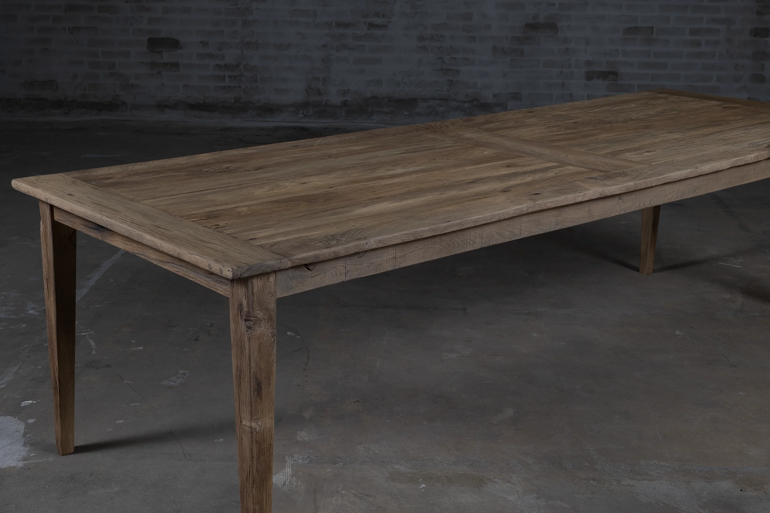 Dieser Eiche Bauerntisch ist in unserer Werkstatt nach dem Vorbild der authentischen Esstische hergestellt. Der Esstisch besteht aus sonnenverbrannter Eiche. Da dieses Holz seit Jahren in der Sonne als Fassadenverkleidung verfärbt ist, hat es eine wunderschönes Patina erhalten.