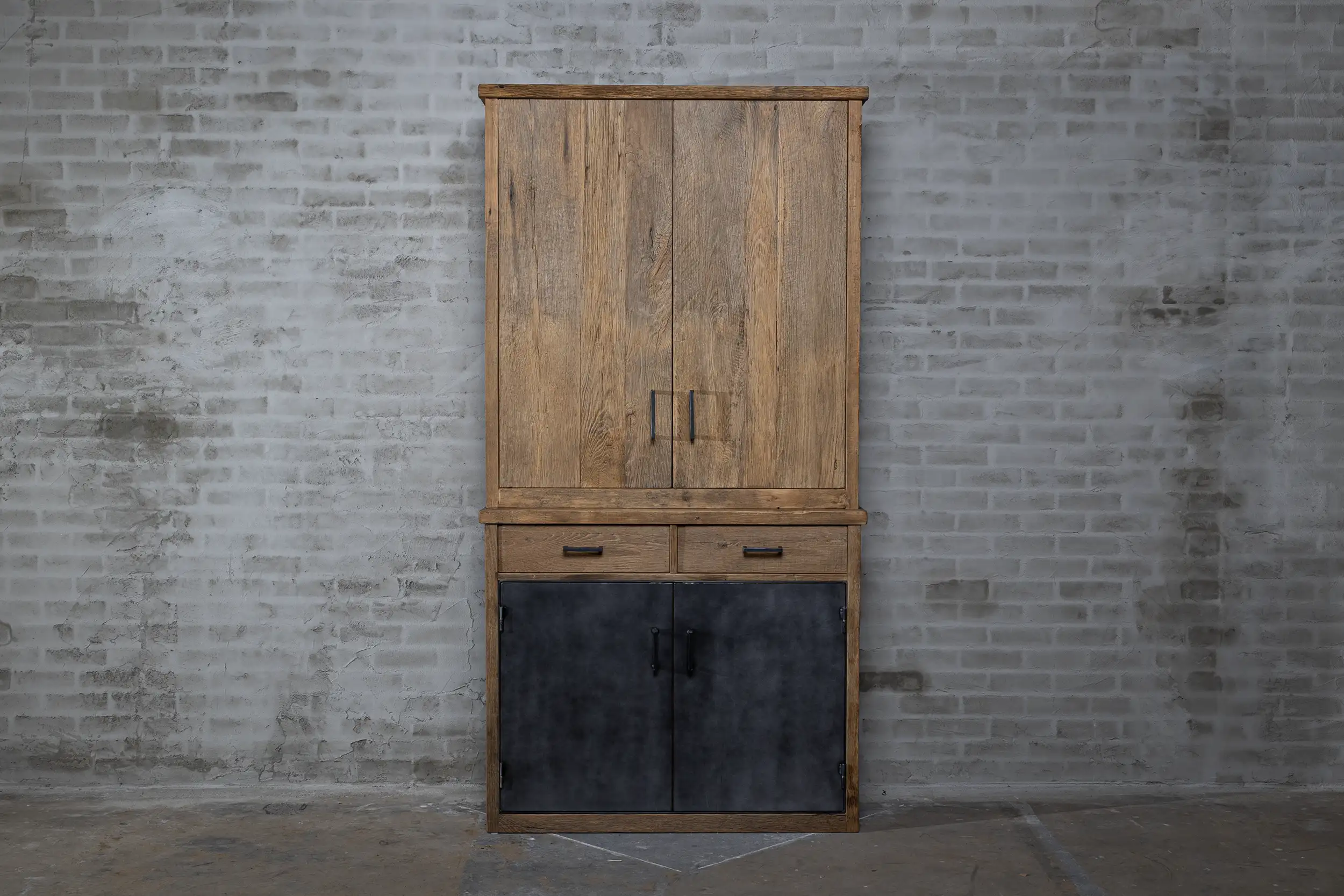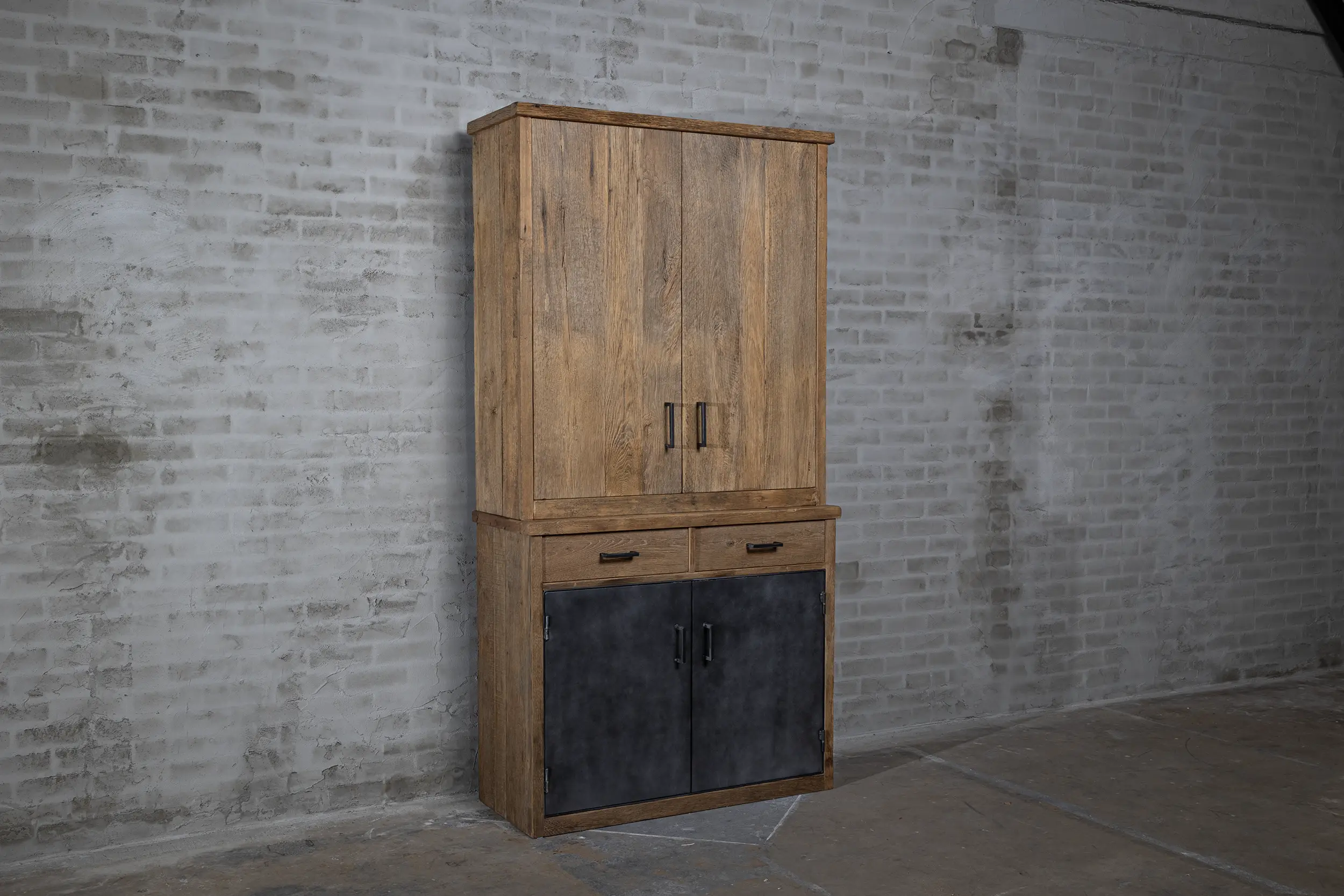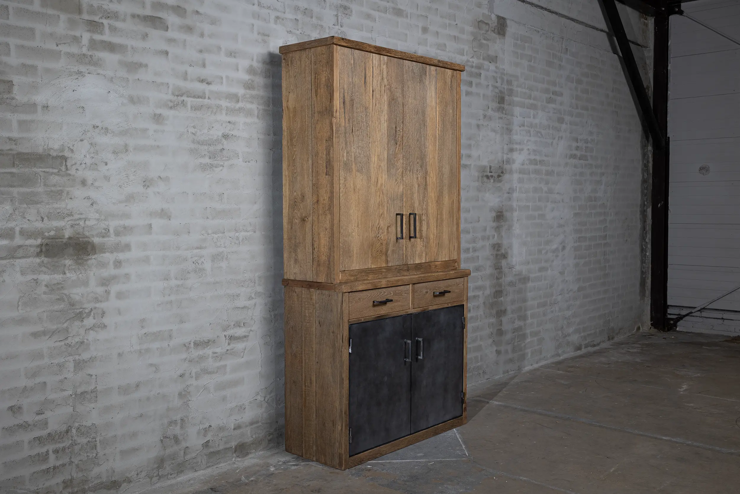 Diese Rustikaler Buffetschrank im Landhausstil ist hergestellt aus aufgearbeiteter alter Eiche, Möbelplatten, industriellem Stahlblech und Eisenbeschlägen. Dieses Modell ist für zusätzlichen Stauraum konzipiert. So verfügt der untere Teil über Flügeltüren, und Schubladen mit Soft-Close-Mechanismus. Darüber hinaus besteht der Oberschrank aus zwei geräumigen Ablagefächern mit großen Flügeltüren aus Eiche.