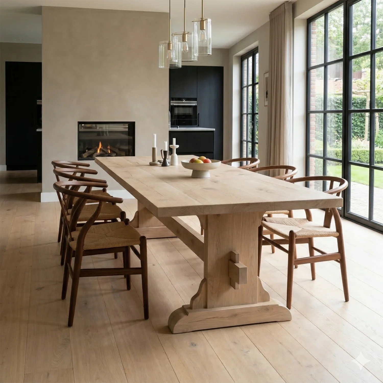 Dieser Rittertisch aus Eichenholz wurde von uns selbst entworfen und in unserer eigenen Werkstatt handgefertigt. Die Tischplatte besteht aus mindestens 6 massiven Eichenbohlen mit einer Stärke von jeweils ca. 4,5 cm. Das Modell dieses Tisches ist von den robusten Tischen inspiriert die in mittelalterlichen Schlössern üblich waren. Zum Beispiel ist die Form der Beine mit Querstange in Kombination mit der Oberseite charakteristisch für mittelalterliche Rittertische.