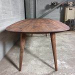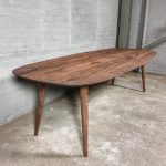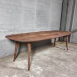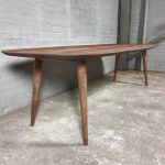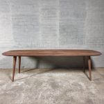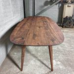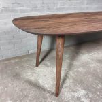 Dieser ‘Dänisch Oval’ Esstisch ist aus massivem amerikanischem Nussbaumholz gefertigt und wurde behandelt, um den Charakter des Holzes hervorzubringen. Ein auffälliges Detail dieses Tisches ist die facettierte Kante, die auf der Tischplatte angebracht wurde.