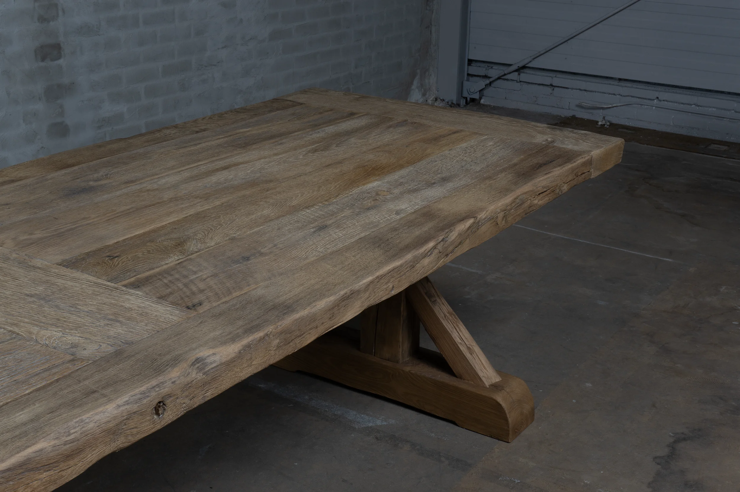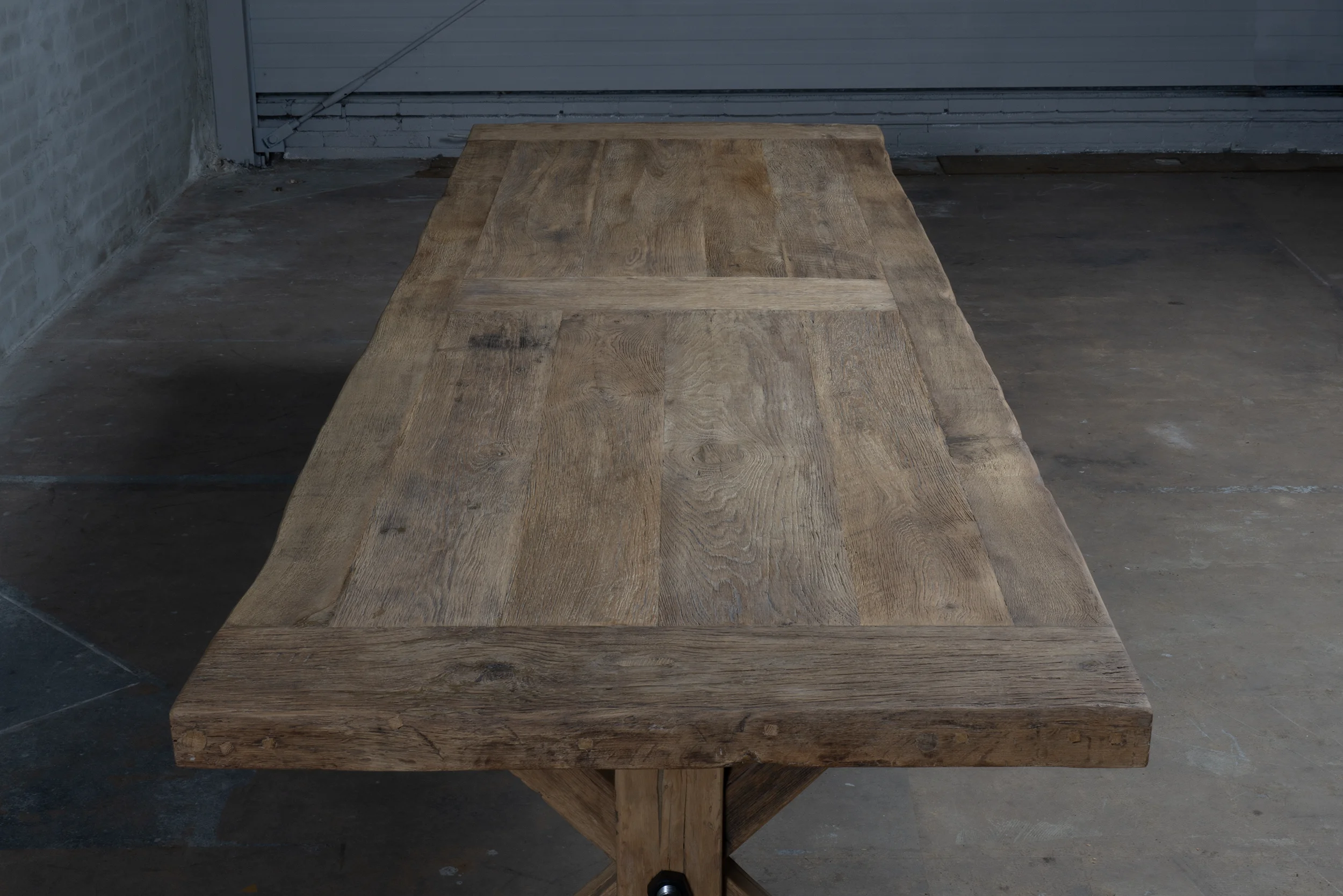 Die Tischplatte ist 7cm dick und verarbeitet aus dünnem sonnenverbrannten Altholz Eicheholz (gesägt aus die äußere Schicht alten Balken) die auf einer Möbelbauplatte geklebt sind. Die Außenkanten der Tischplatte sind aus massiven Brettern. Die sonnenverbrannten Bretter stammen aus alten Häusern, und haben eine wunderschöne Patina. Von der Sonne getönt!