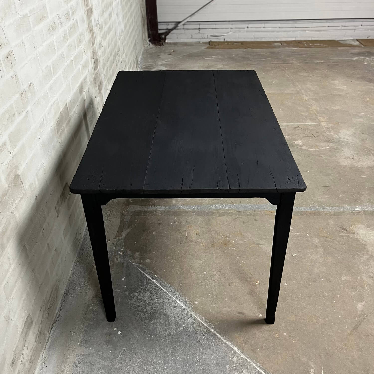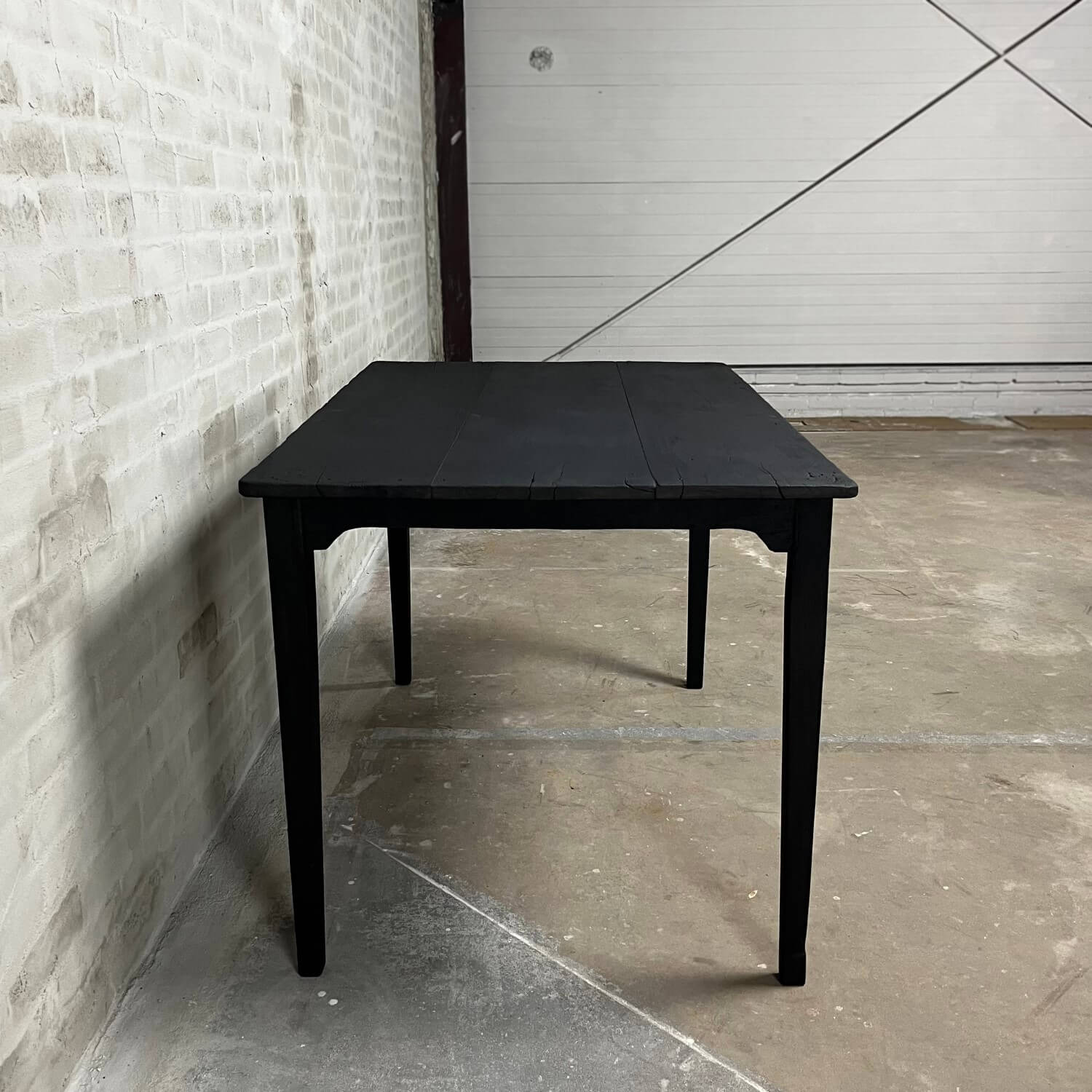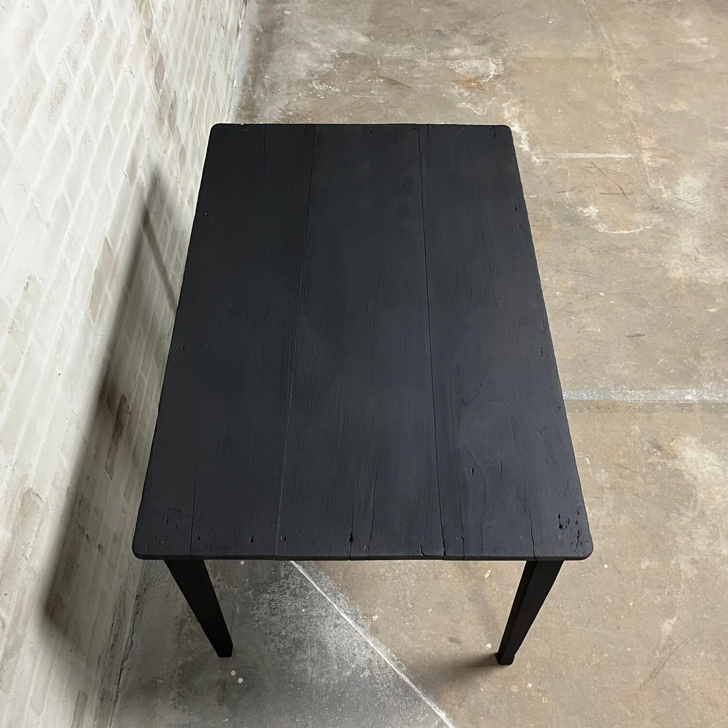 Kleiner schwarzer Esstisch, restauriert und bearbeitet nach der alten japanischen Technik Shou Sugi Ban. Bei dieser Holzbearbeitungstechnik wird das Holz sozusagen zugebrannt, wodurch es sehr robust und pflegeleicht wird (keine Flecken auf der Kleidung).
