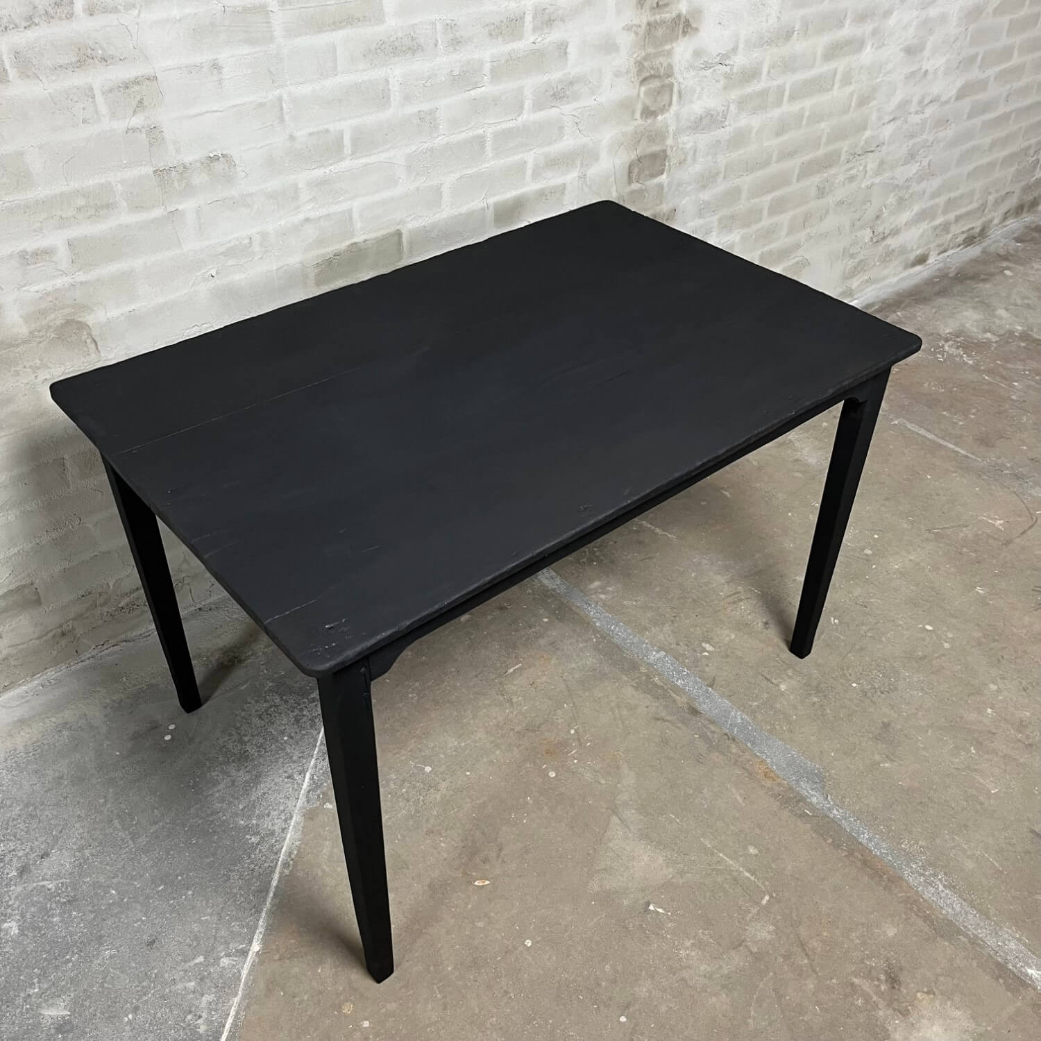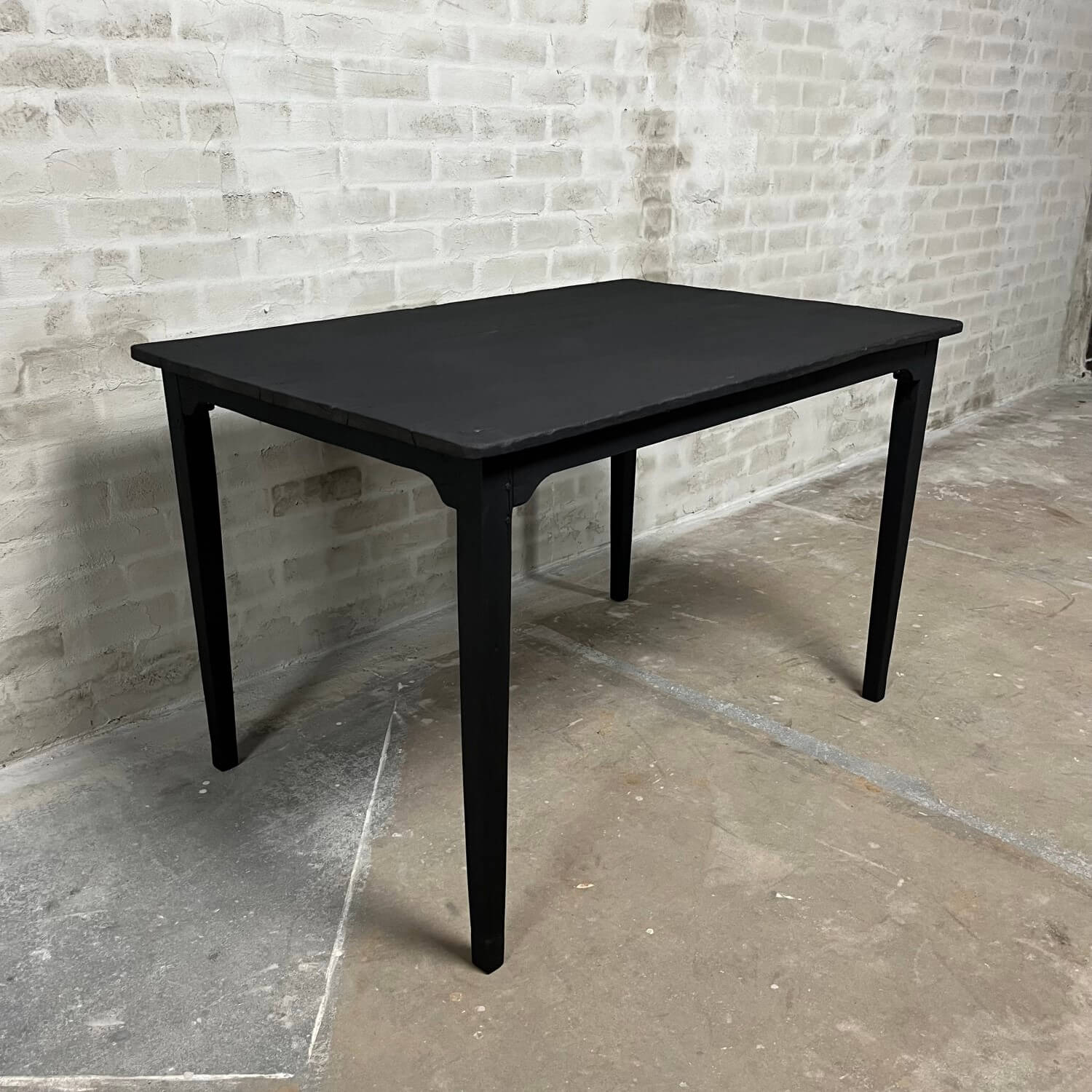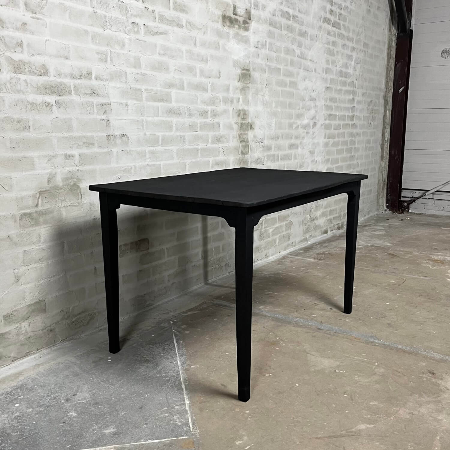 Kleiner schwarzer Esstisch, restauriert und bearbeitet nach der alten japanischen Technik Shou Sugi Ban. Bei dieser Holzbearbeitungstechnik wird das Holz sozusagen zugebrannt, wodurch es sehr robust und pflegeleicht wird (keine Flecken auf der Kleidung).