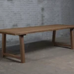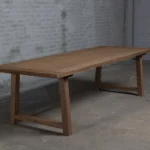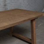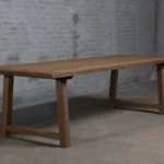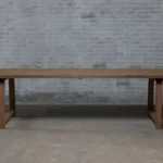 Der Gartentisch T20 aus Holz ist ein Klostertisch für den Außenbereich und wird in der eigenen Werkstatt hergestellt. Die Tischplatte ist aus 4,5 cm dicken massiven Fraké-Holzbrettern gefertigt. Schlitze über die gesamte Länge der Tischplatte sorgen für die Entwässerung.