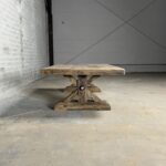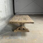 Der Tisch ist aus alter europäischer Eiche gefertigt, die jahrelang als Verkleidung diente. Hier wurde es von Sonne und Regen gefärbt, was ihm eine einzigartige und reiche Patina verleiht. Die 5,5 cm dicke Tischplatte ist aus dünnem altem Eichenholz (von der Außenseite der Balken gesägt), das auf eine Möbelplatte geklebt wurde. Die Außenkanten sind aus massiven Bohlen gefertigt. Der Sockel ist aus massiven alten Balken gefertigt, was ihm außergewöhnliche Robustheit verleiht. Die Tischplatte ist fleckenfrei behandelt.