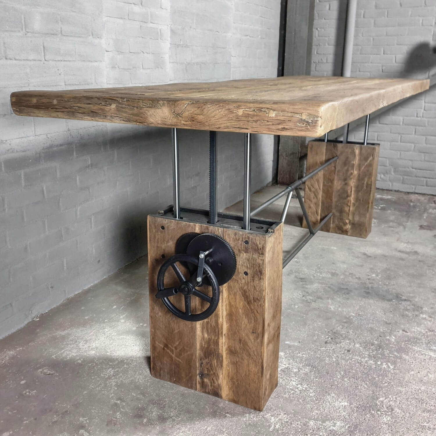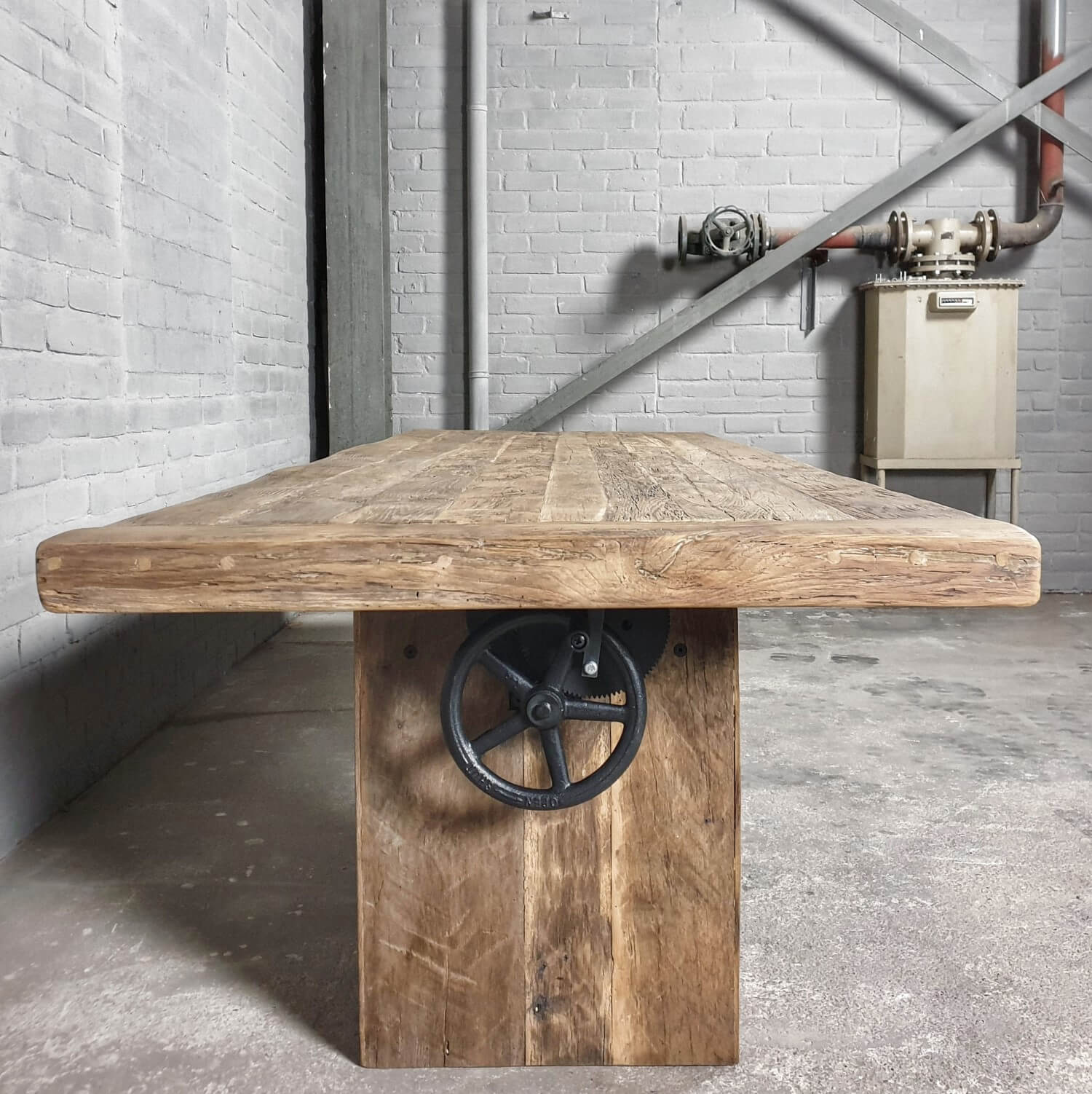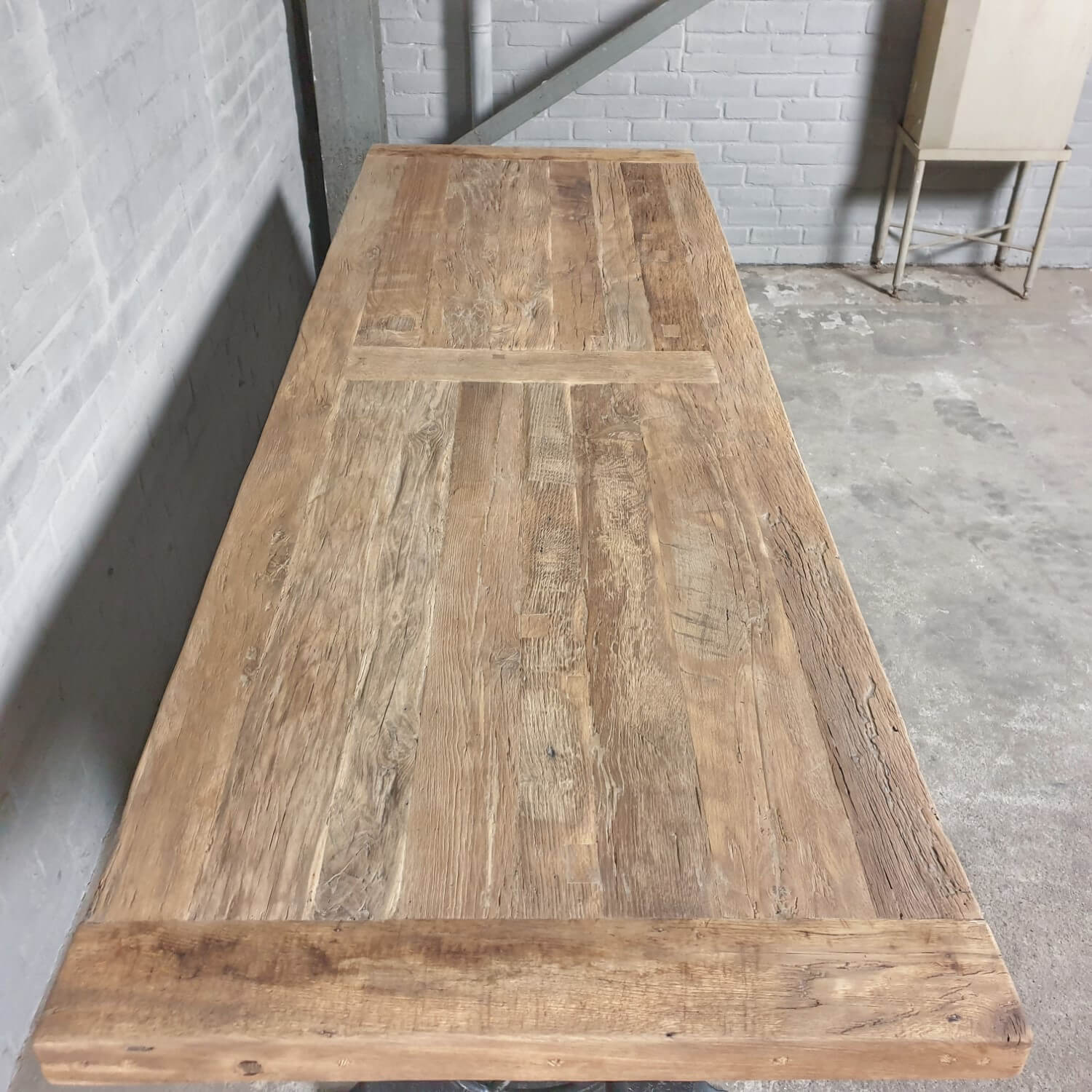 Die Tischplatte von 7cm dick und das Tischgestell sind verarbeitet aus dünnem sonnenverbrannten Altholz Eichen Brettern (gesägt aus die äußere Schicht alten Balken) die auf einer Möbelbauplatte geklebt sind. Die Außenkanten der Tischplatte sind aus massiven Brettern. Die sonnenverbrannten Bretter stammen aus alten Häusern, und haben eine wunderschöne Patina. Von der Sonne getönt!