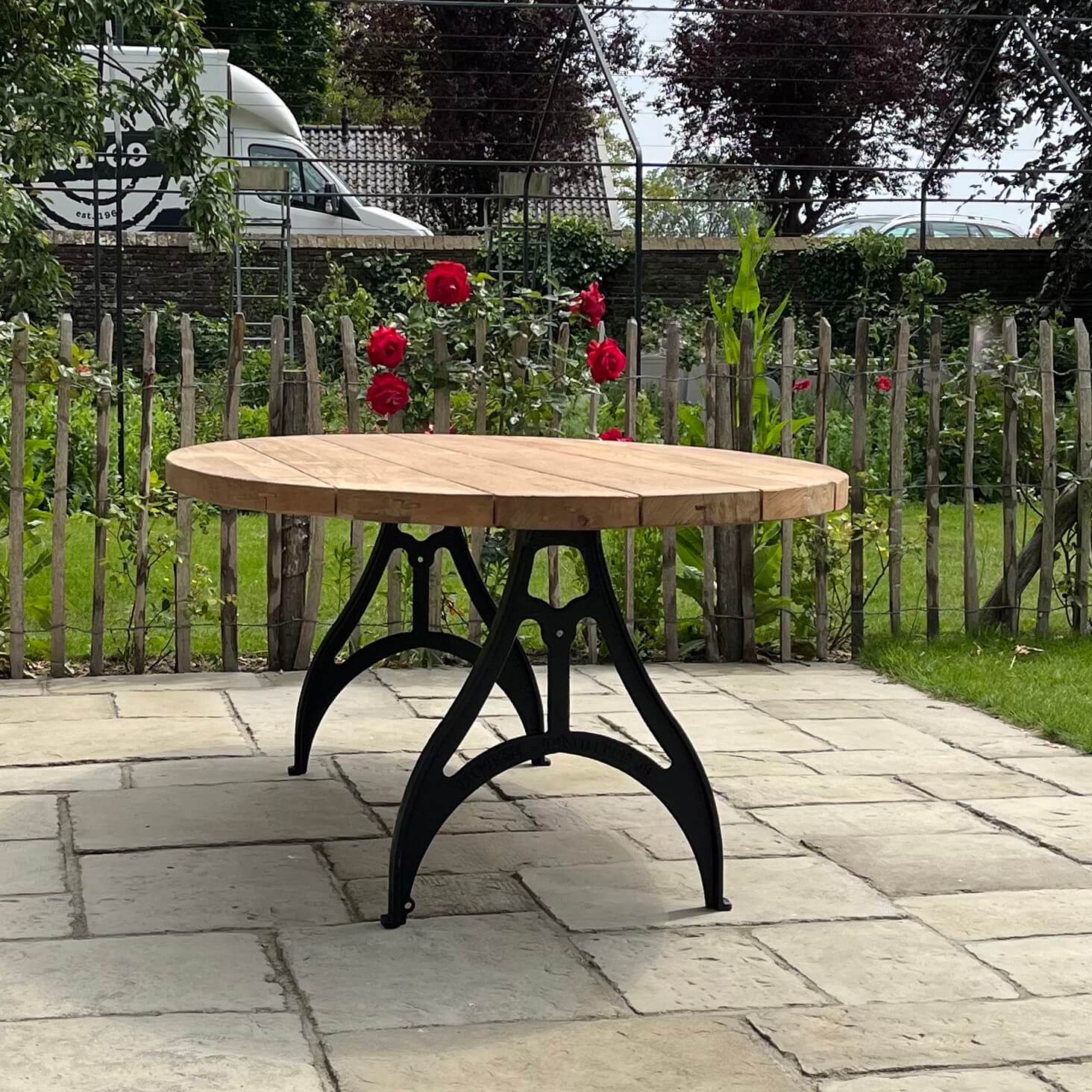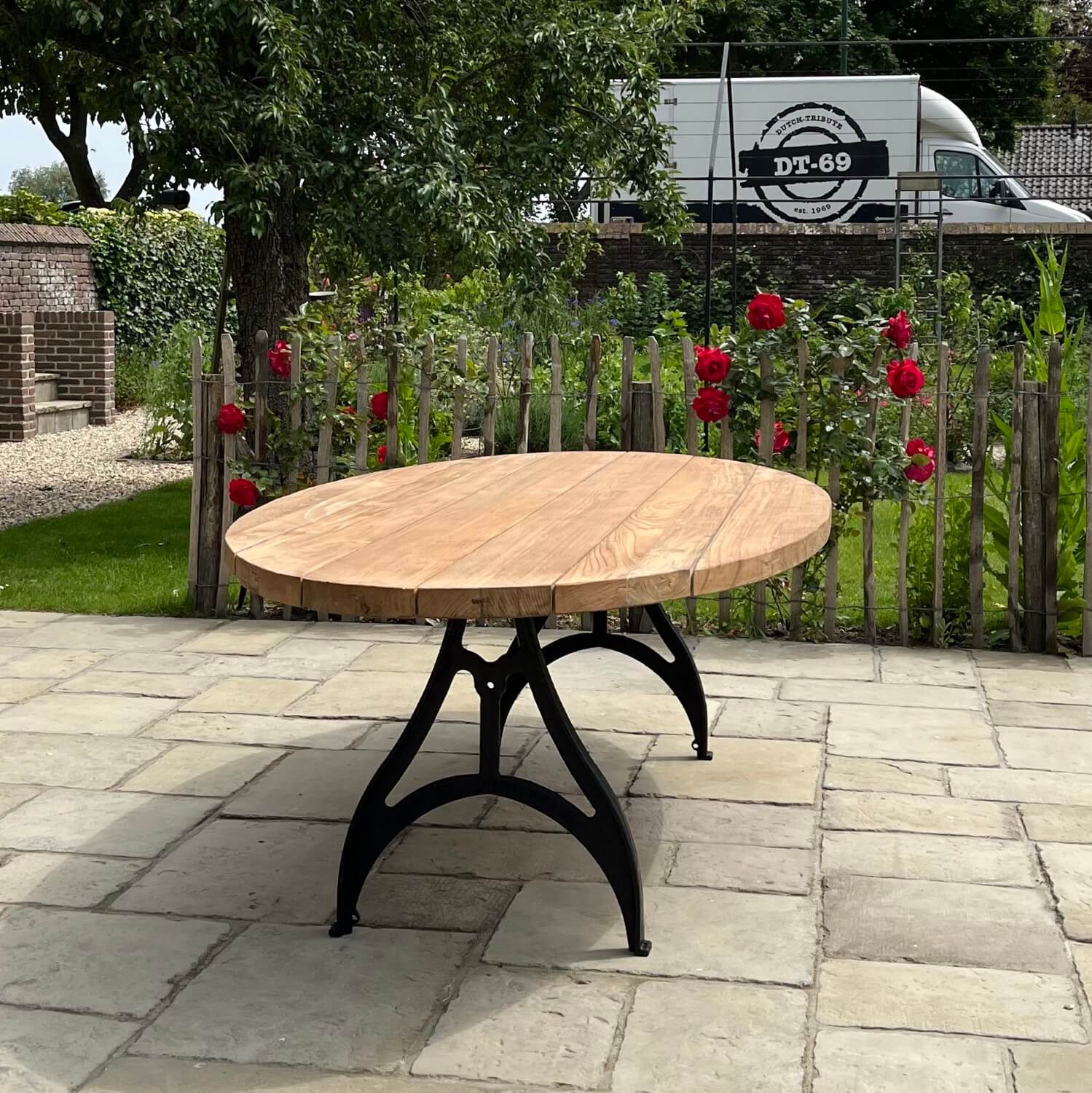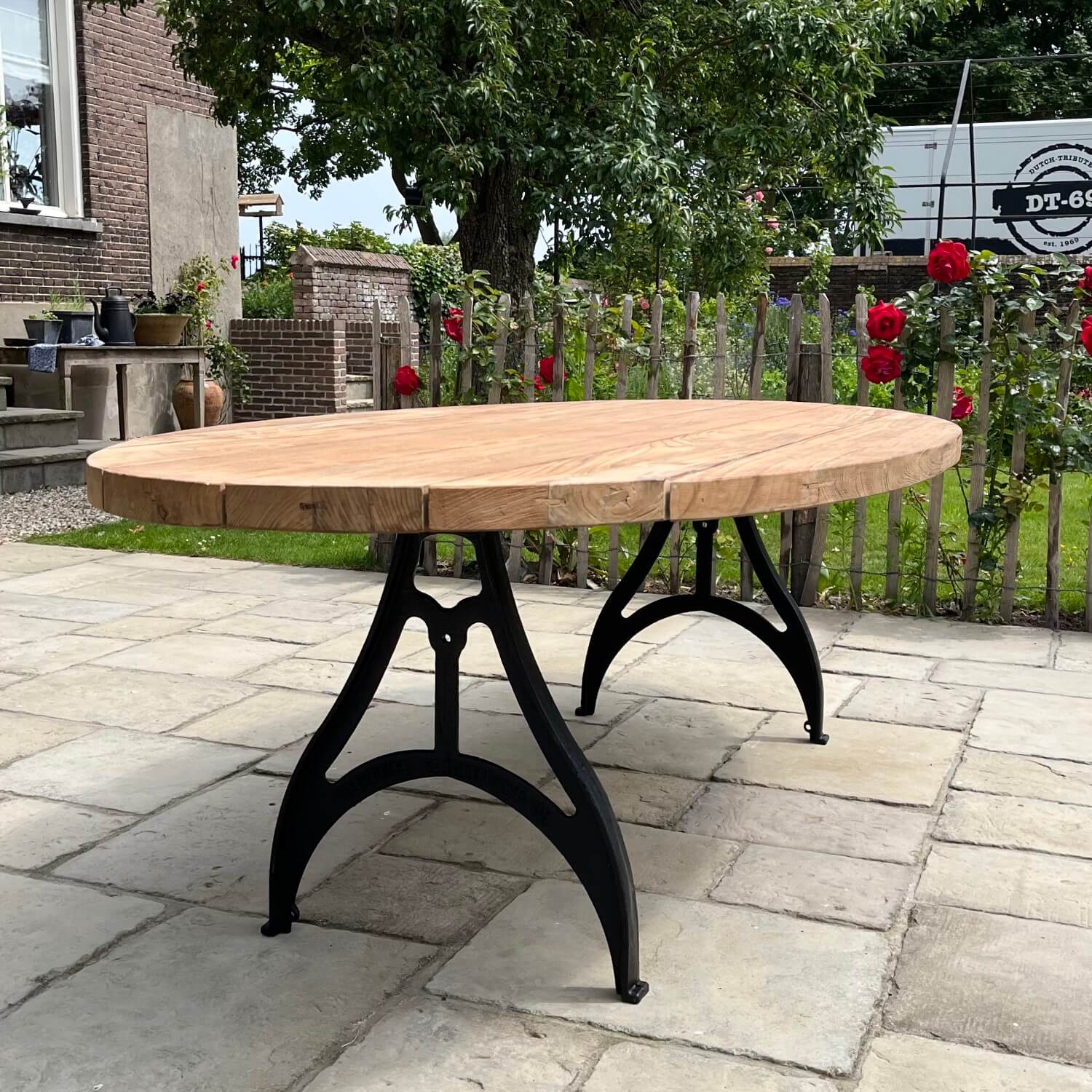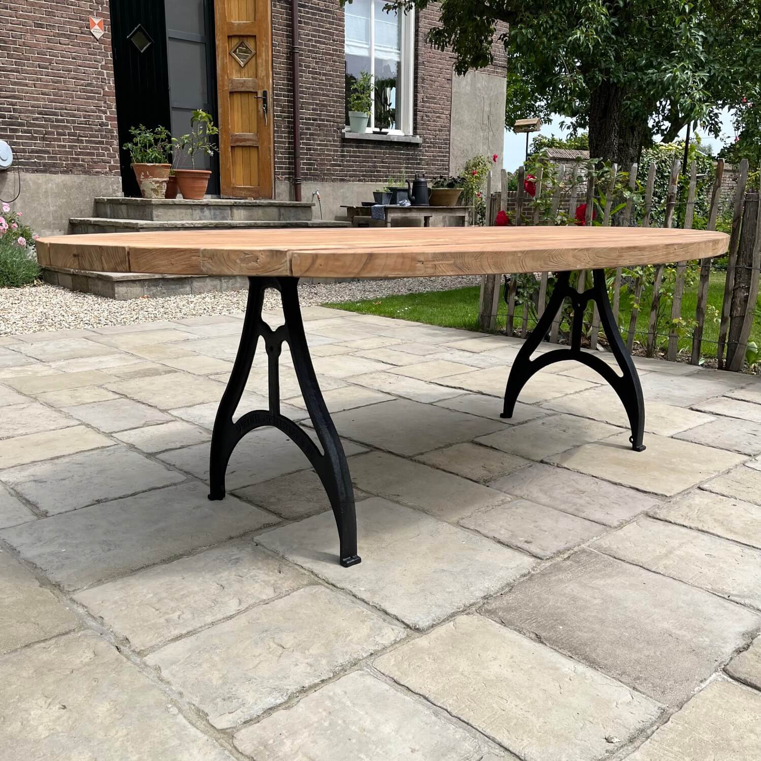 Dieser ovale Gartentisch nach Industrie Design wurde von uns selbst entworfen. Der Tisch hat dünne gusseiserne Beine und eine Tischplatte aus Teakholz, die eine lange Lebensdauer garantiert. Das Holz eignet sich hervorragend für den unbehandelten Außenbereich, da es von Natur aus gegen Holzzerfall geschützt ist. Durch die Verwendung von unbehandeltem Holz erhält es ein schönes, natürliches Aussehen und altert mit den Jahren. Sie können das Teakholz auch mit Teaköl behandeln, um die Farbe des Holzes zu erhalten.
