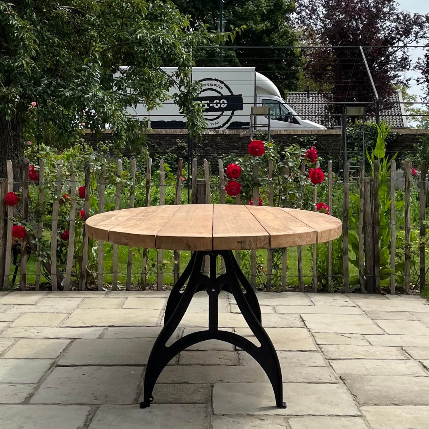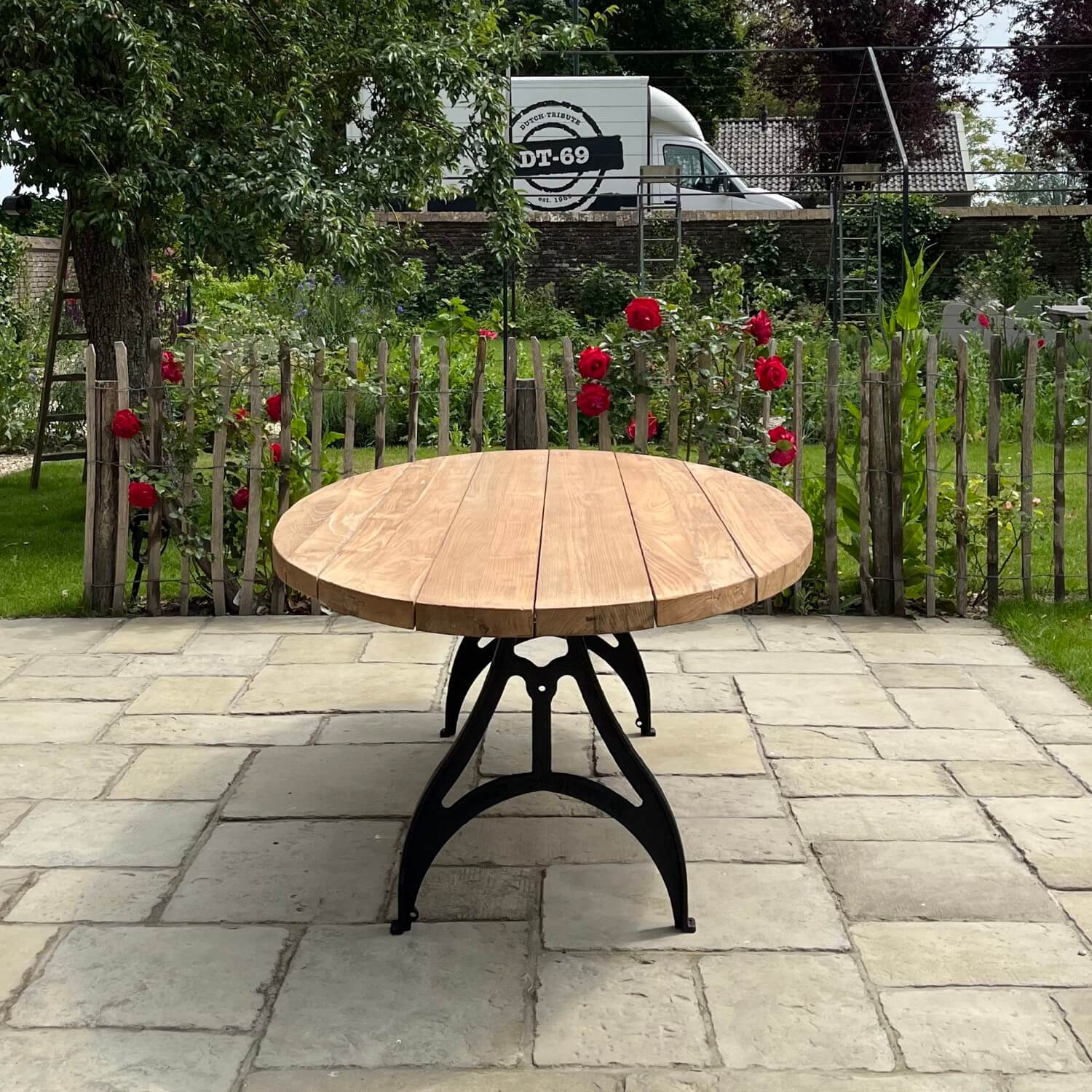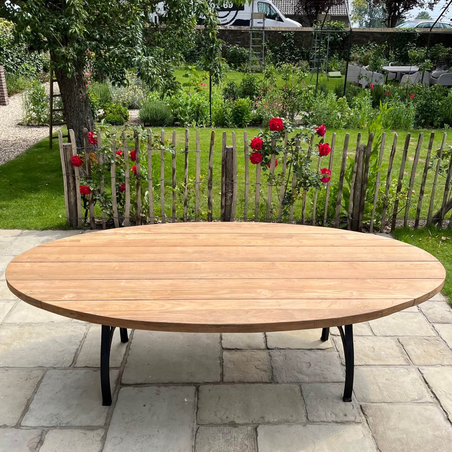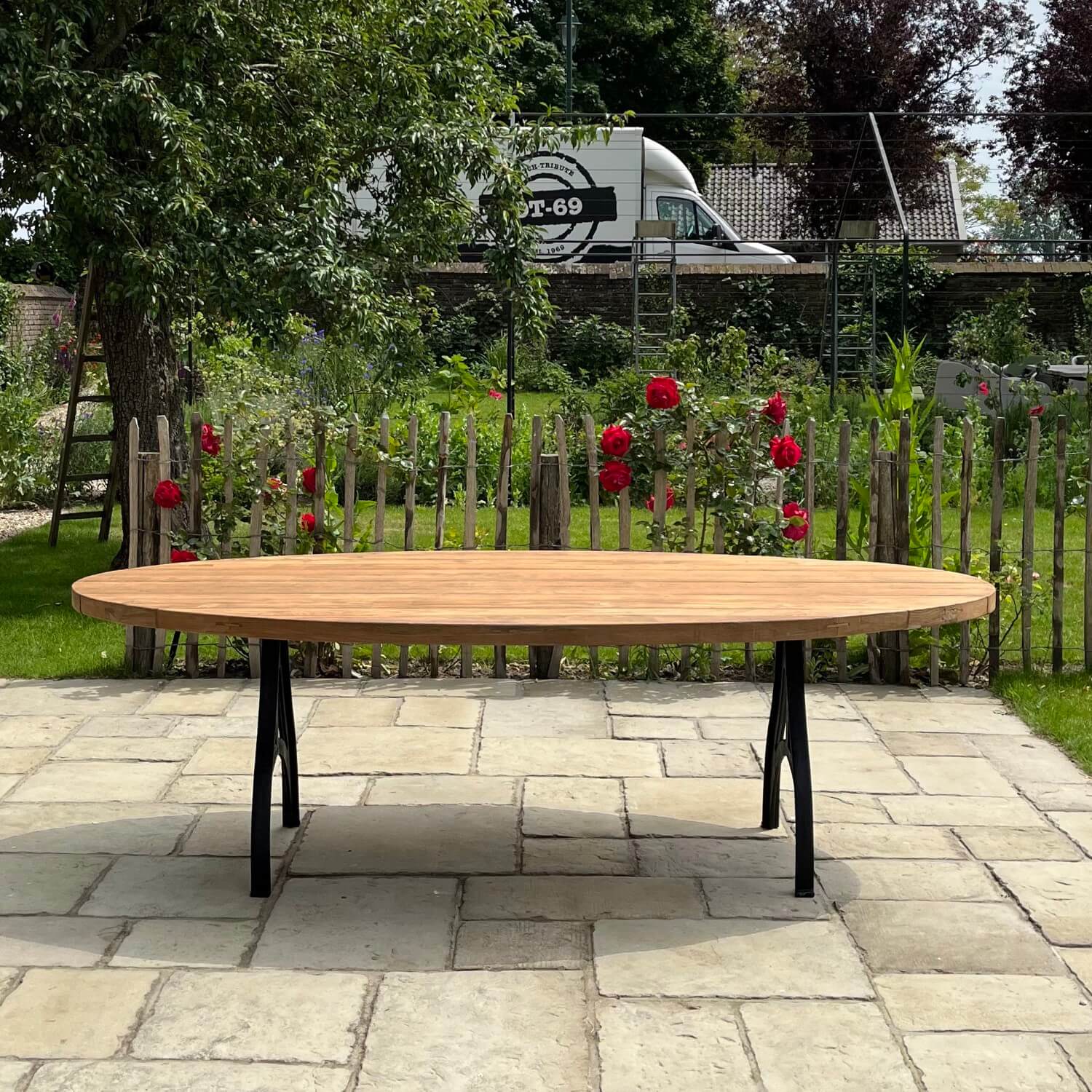 Dieser ovale Gartentisch nach Industrie Design wurde von uns selbst entworfen. Der Tisch hat dünne gusseiserne Beine und eine Tischplatte aus Teakholz, die eine lange Lebensdauer garantiert. Das Holz eignet sich hervorragend für den unbehandelten Außenbereich, da es von Natur aus gegen Holzzerfall geschützt ist. Durch die Verwendung von unbehandeltem Holz erhält es ein schönes, natürliches Aussehen und altert mit den Jahren. Sie können das Teakholz auch mit Teaköl behandeln, um die Farbe des Holzes zu erhalten.