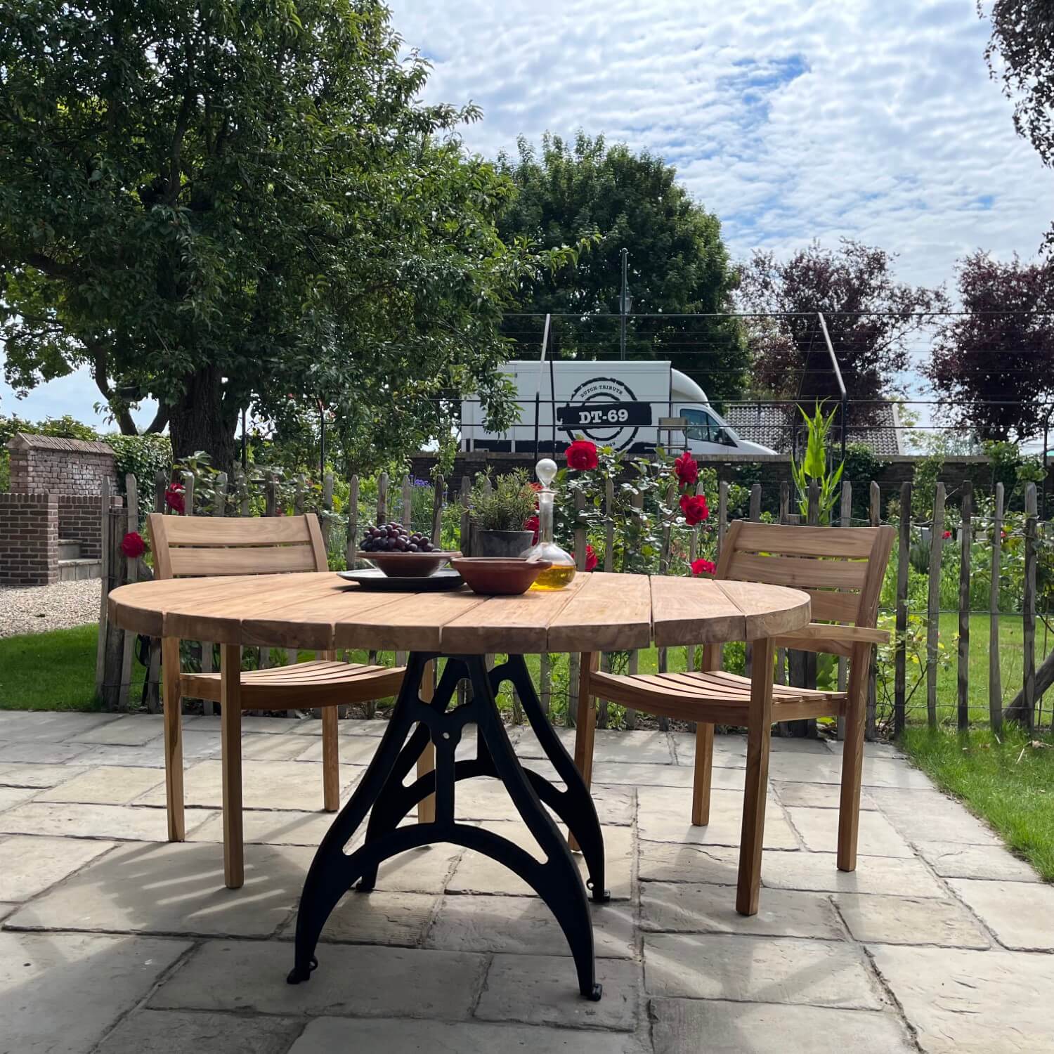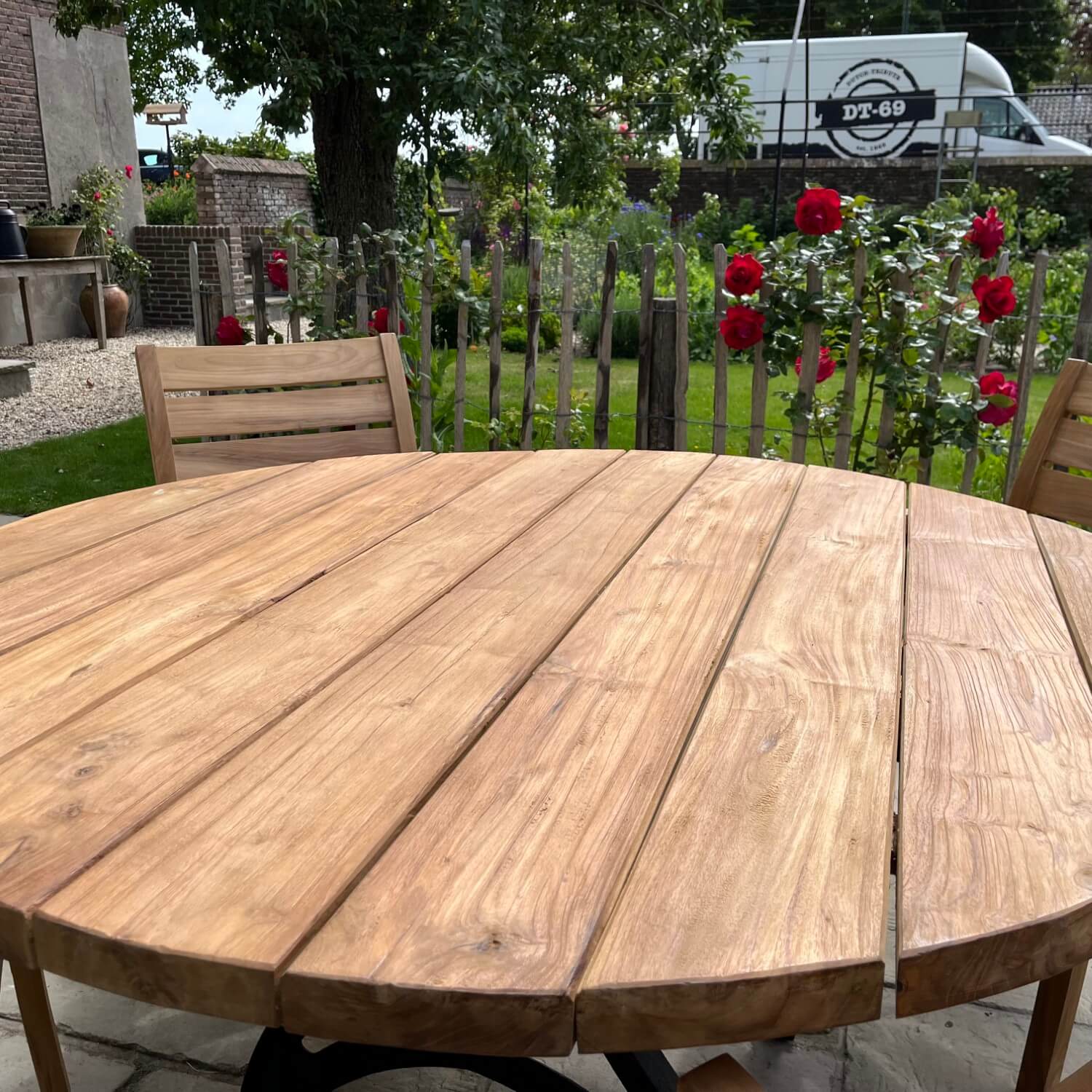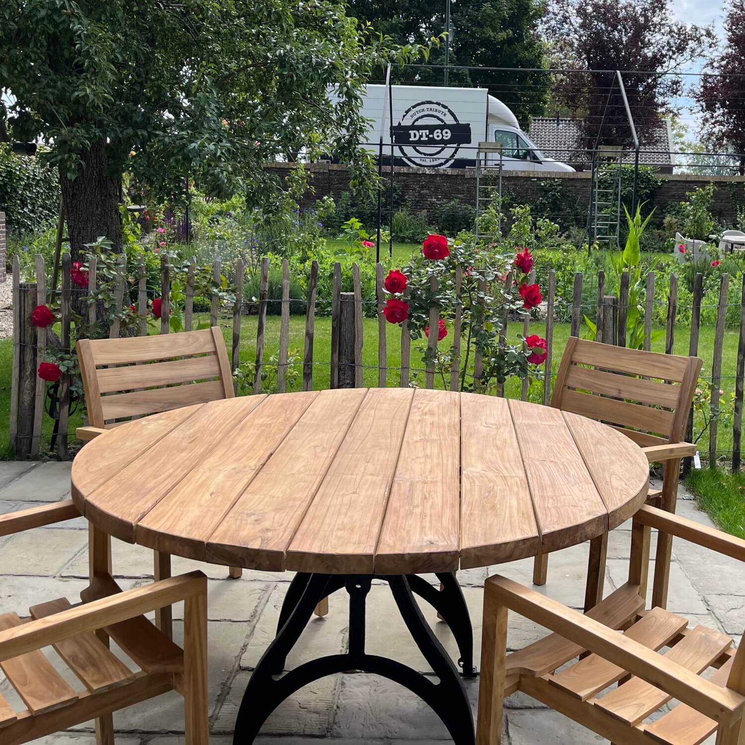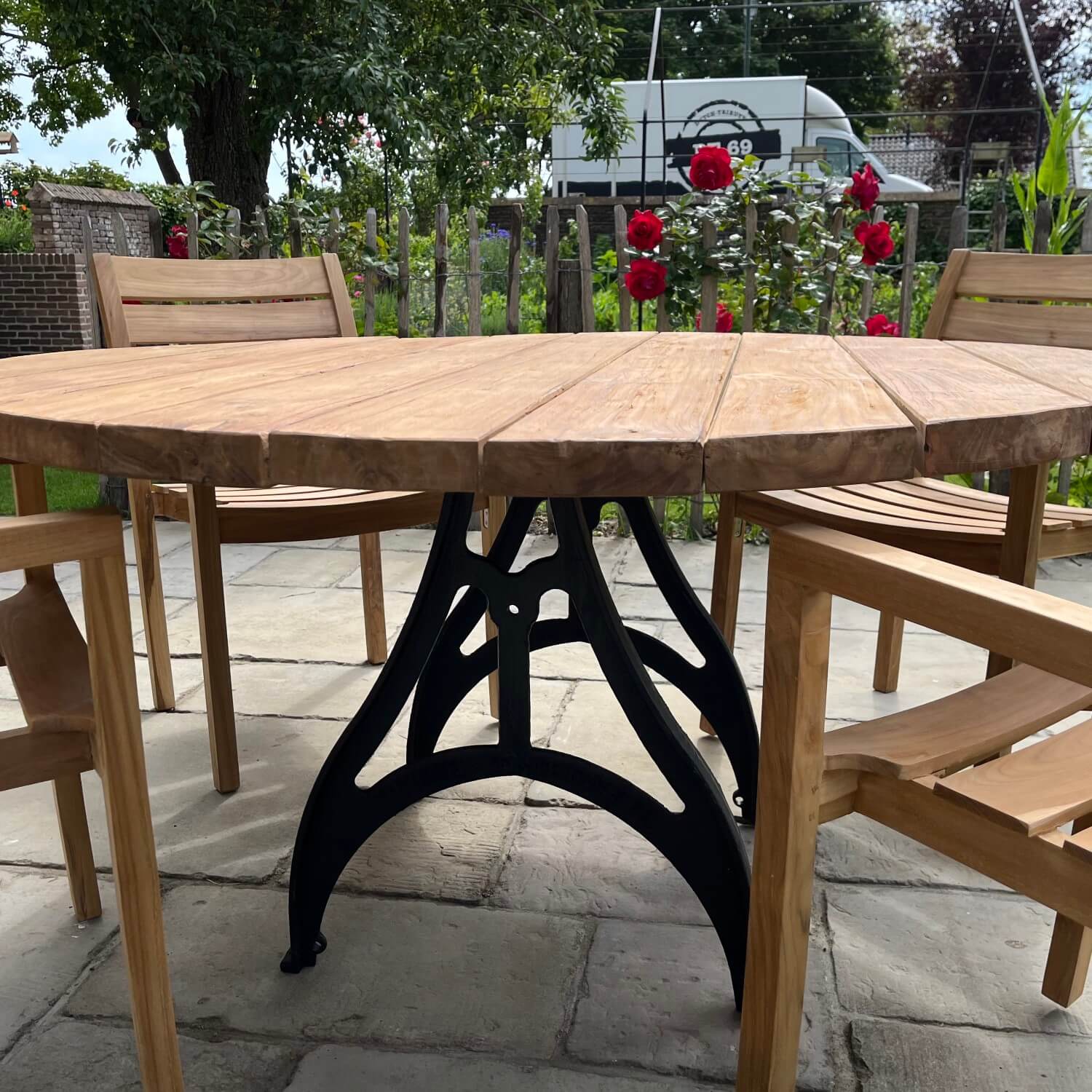 Dieser runder Gartentisch nach Industrie Design wurde von uns selbst entworfen. Der Tisch hat gusseiserne Beine und eine Tischplatte aus Teakholz, die eine lange Lebensdauer garantiert. Das Holz eignet sich hervorragend für den unbehandelten Außenbereich, da es von Natur aus gegen Holzzerfall geschützt ist. Durch die Verwendung von unbehandeltem Holz erhält es ein schönes, natürliches Aussehen und altert mit den Jahren. Sie können das Teakholz auch mit Teaköl behandeln, um die Farbe des Holzes zu erhalten.