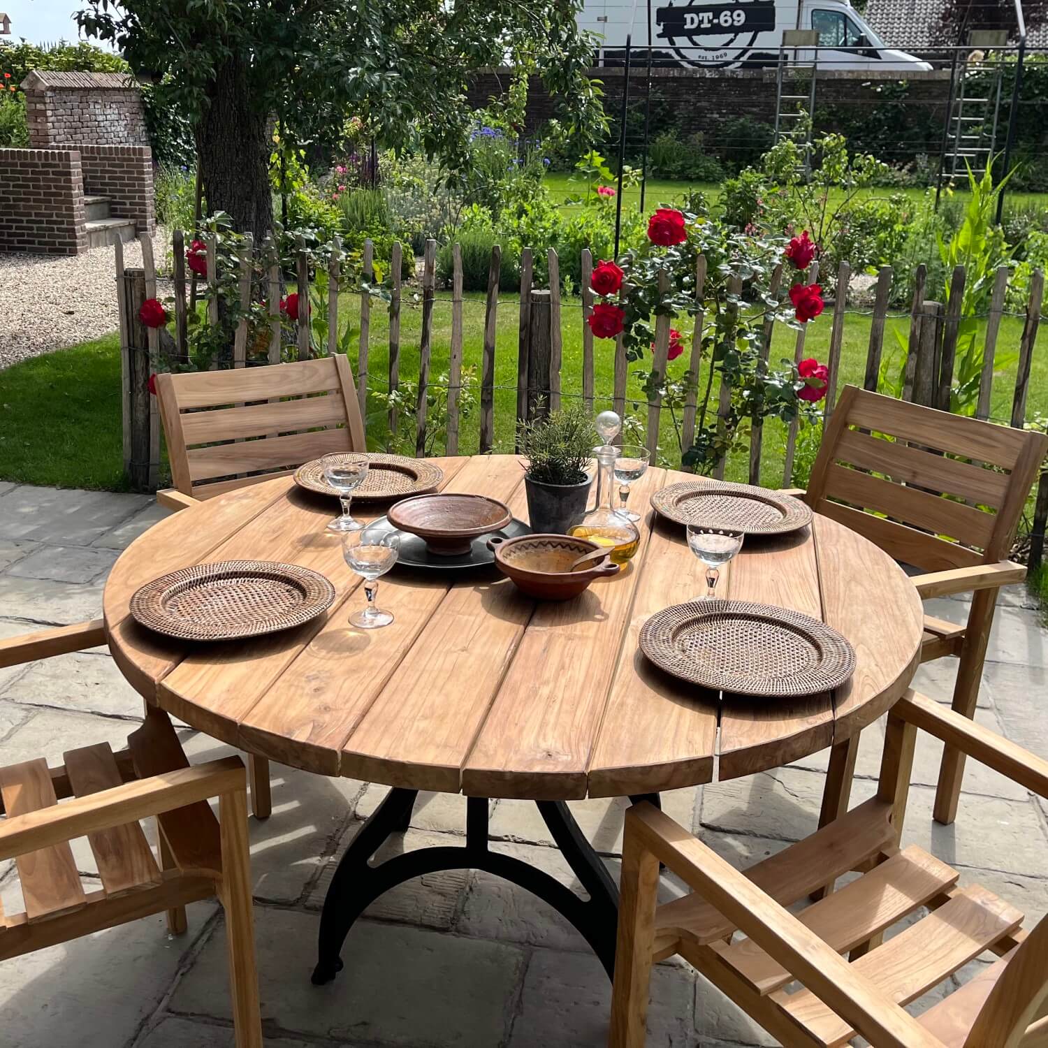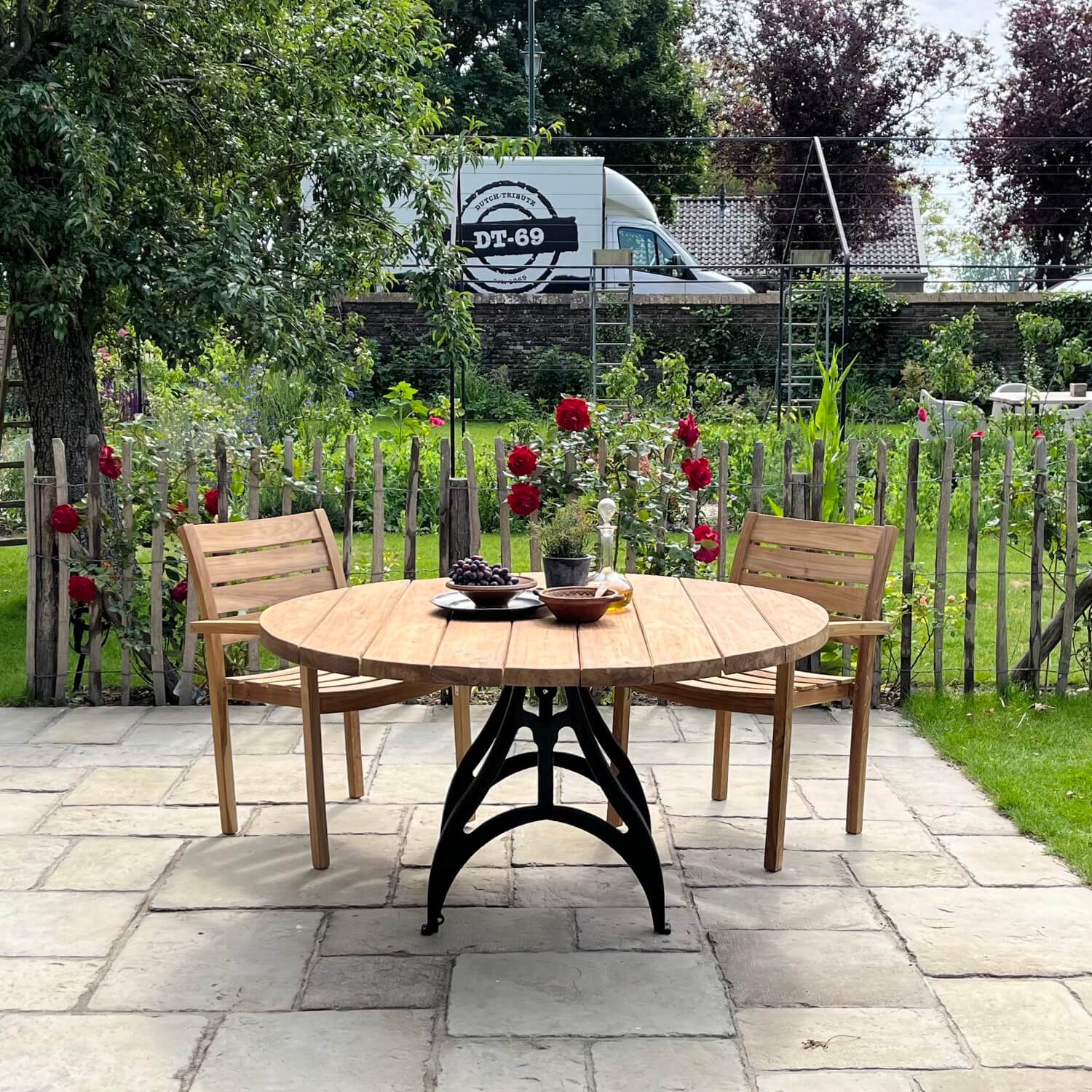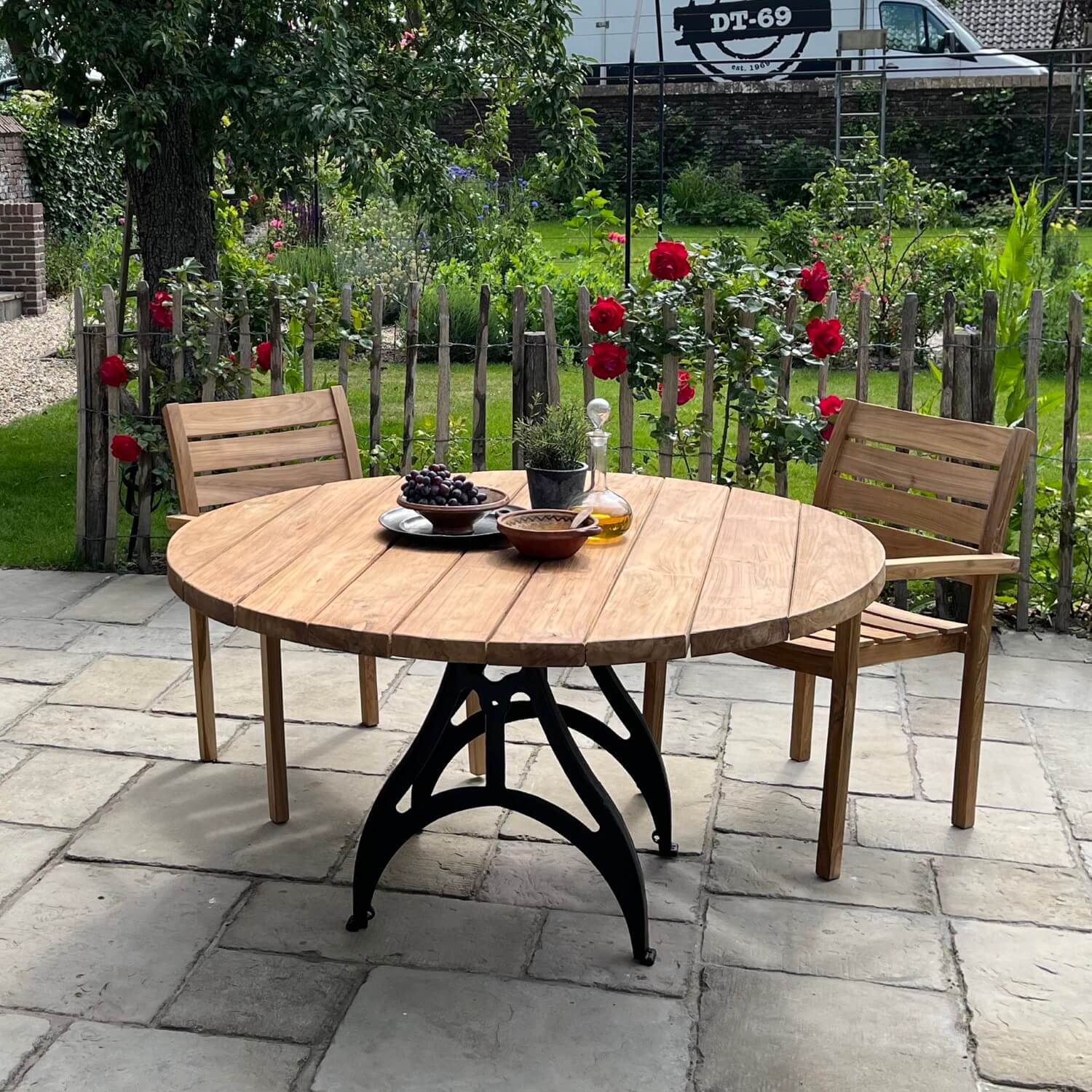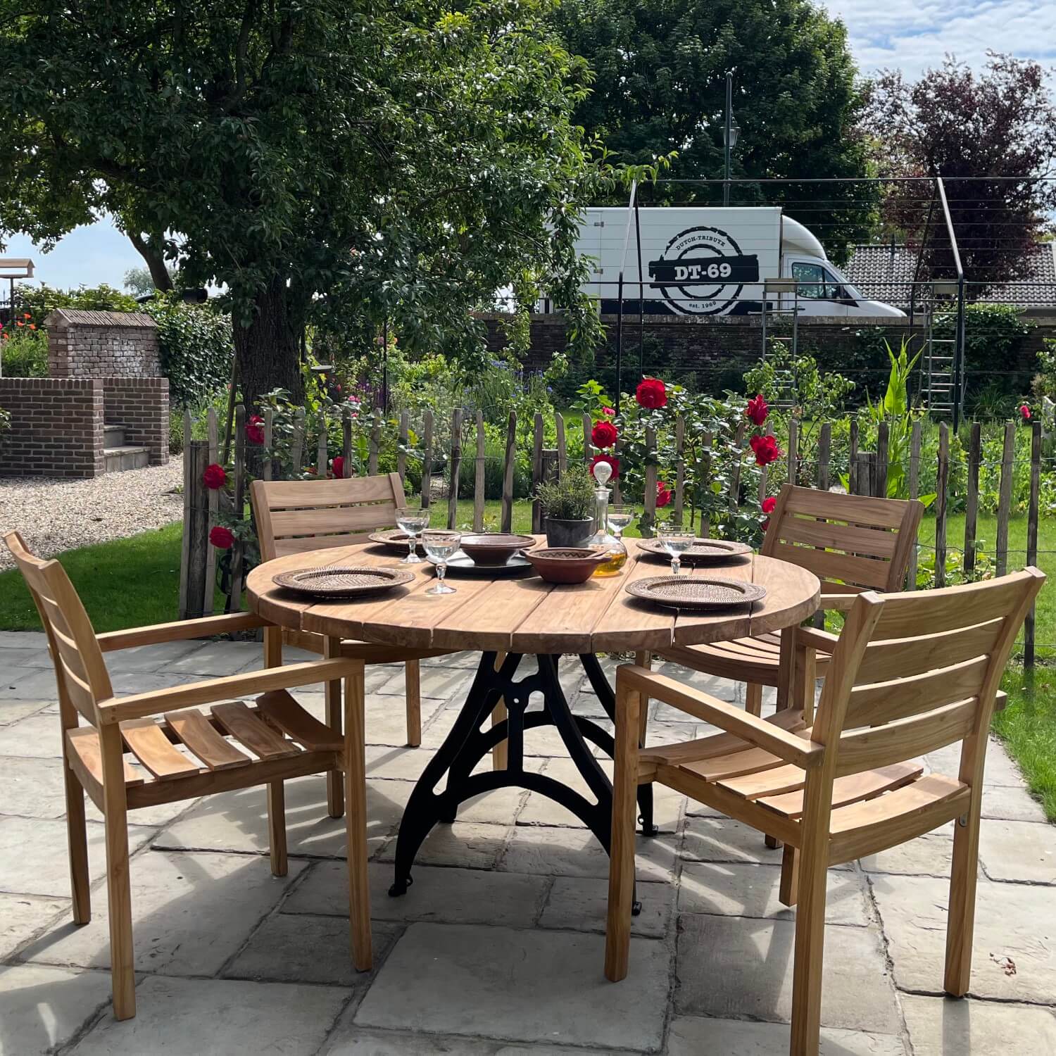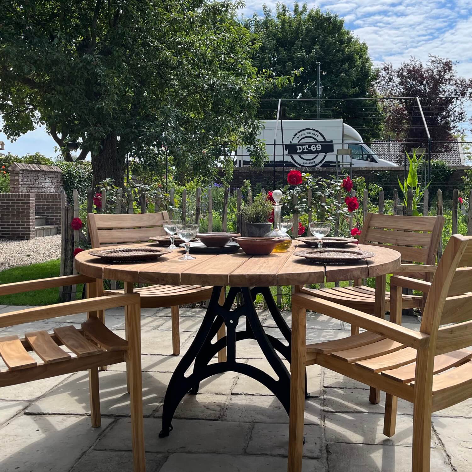 Dieser runder Gartentisch nach Industrie Design wurde von uns selbst entworfen. Der Tisch hat gusseiserne Beine und eine Tischplatte aus Teakholz, die eine lange Lebensdauer garantiert. Das Holz eignet sich hervorragend für den unbehandelten Außenbereich, da es von Natur aus gegen Holzzerfall geschützt ist. Durch die Verwendung von unbehandeltem Holz erhält es ein schönes, natürliches Aussehen und altert mit den Jahren. Sie können das Teakholz auch mit Teaköl behandeln, um die Farbe des Holzes zu erhalten.