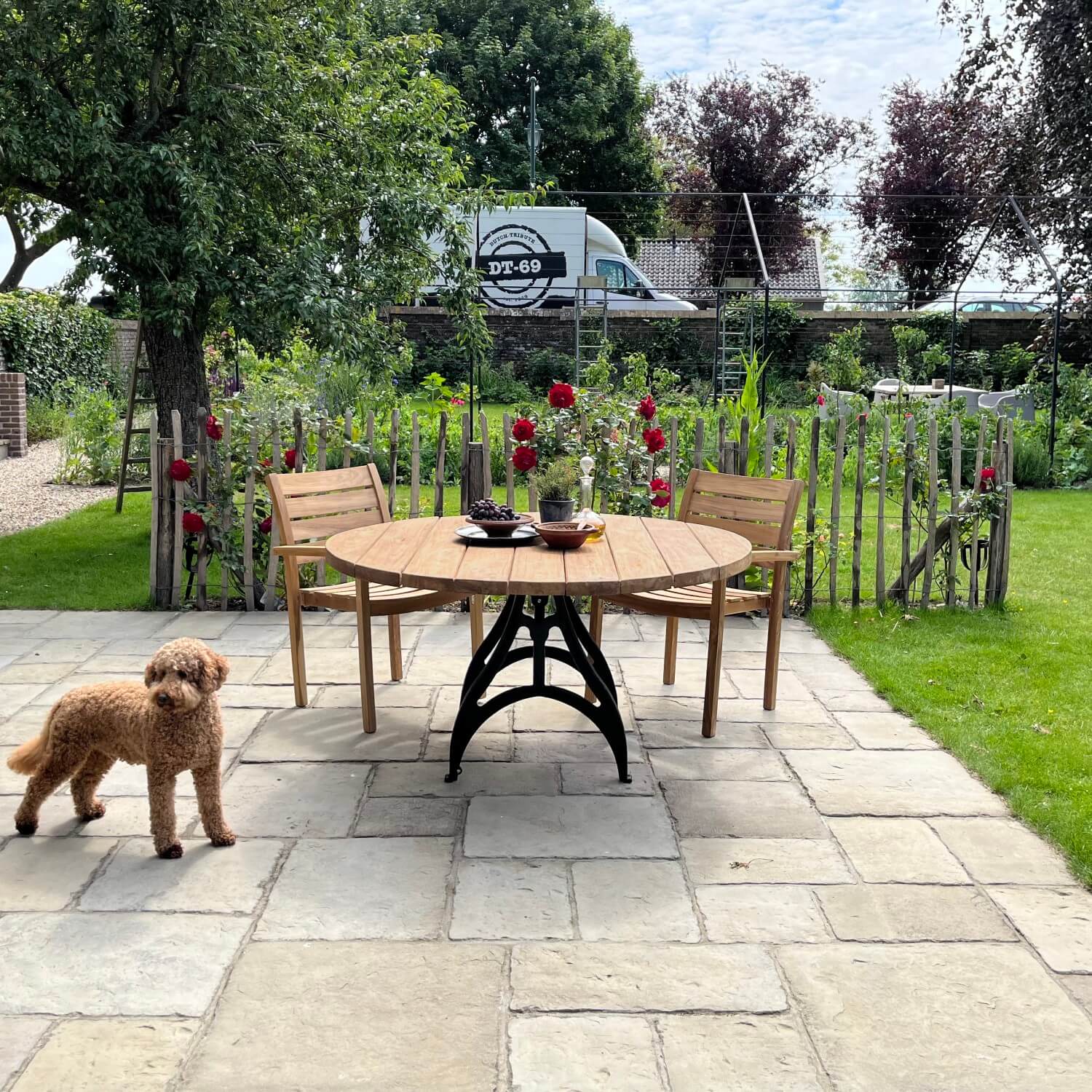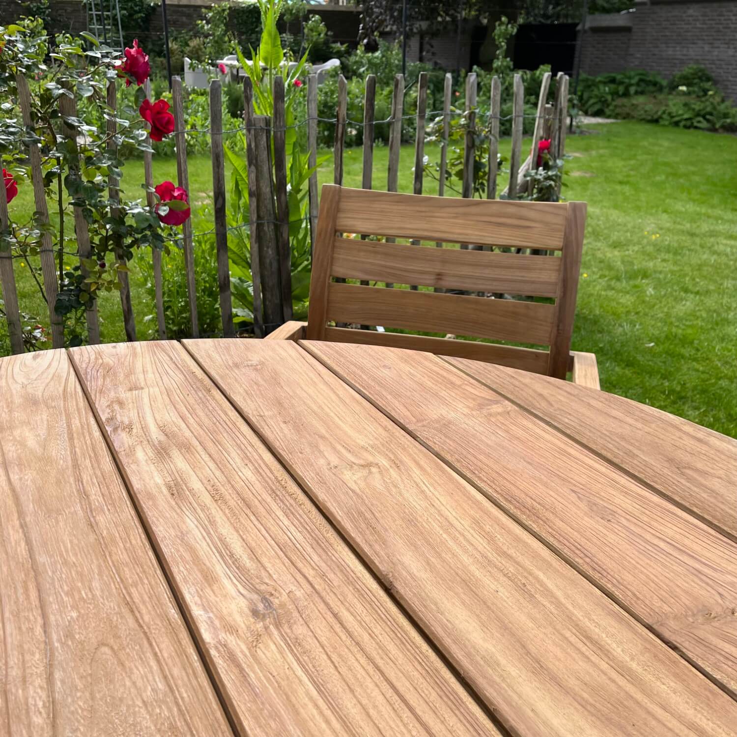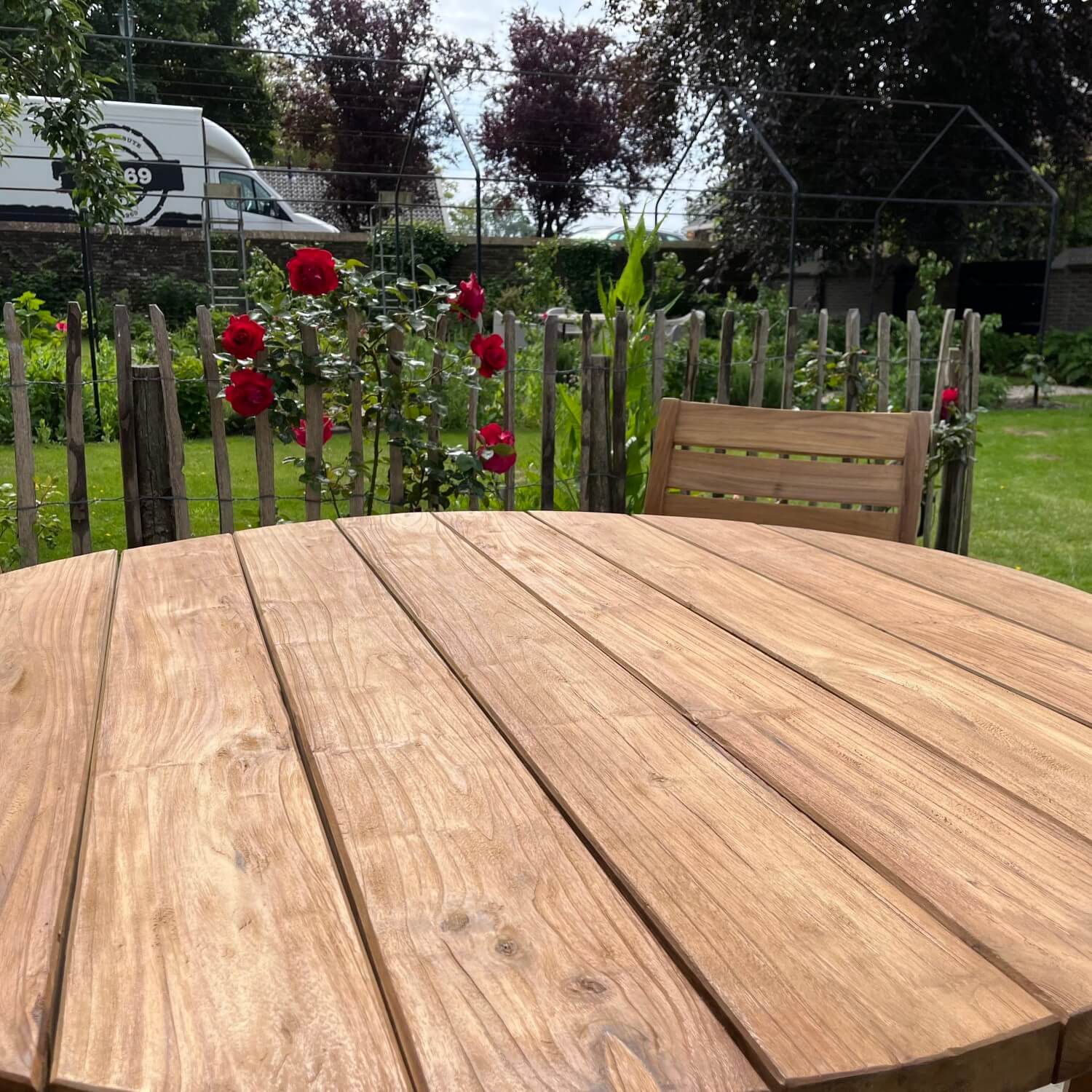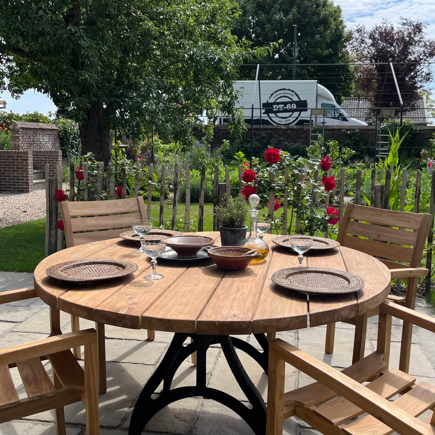 Dieser runder Gartentisch nach Industrie Design wurde von uns selbst entworfen. Der Tisch hat gusseiserne Beine und eine Tischplatte aus Teakholz, die eine lange Lebensdauer garantiert. Das Holz eignet sich hervorragend für den unbehandelten Außenbereich, da es von Natur aus gegen Holzzerfall geschützt ist. Durch die Verwendung von unbehandeltem Holz erhält es ein schönes, natürliches Aussehen und altert mit den Jahren. Sie können das Teakholz auch mit Teaköl behandeln, um die Farbe des Holzes zu erhalten.