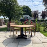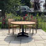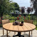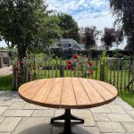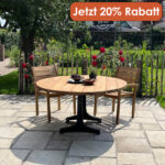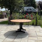 Dieser runder Gartentisch nach Industrie Design wurde von uns selbst entworfen. Der Tisch hat gusseiserne Beine und eine Tischplatte aus Teakholz, die eine lange Lebensdauer garantiert. Das Holz eignet sich hervorragend für den unbehandelten Außenbereich, da es von Natur aus gegen Holzzerfall geschützt ist. Durch die Verwendung von unbehandeltem Holz erhält es ein schönes, natürliches Aussehen und altert mit den Jahren. Sie können das Teakholz auch mit Teaköl behandeln, um die Farbe des Holzes zu erhalten.