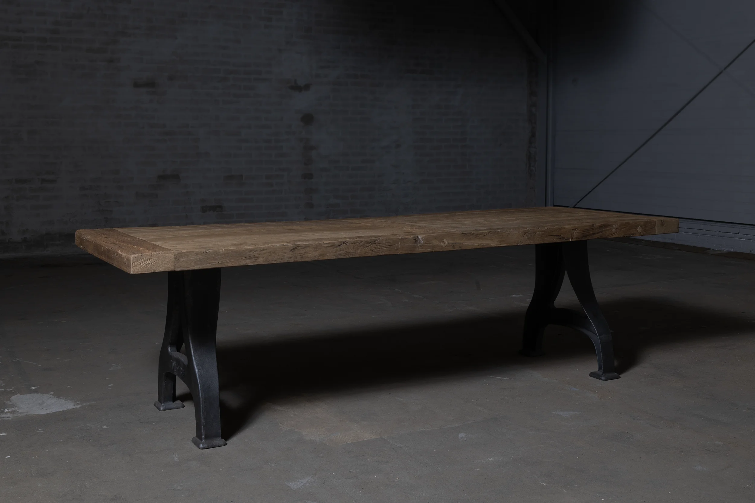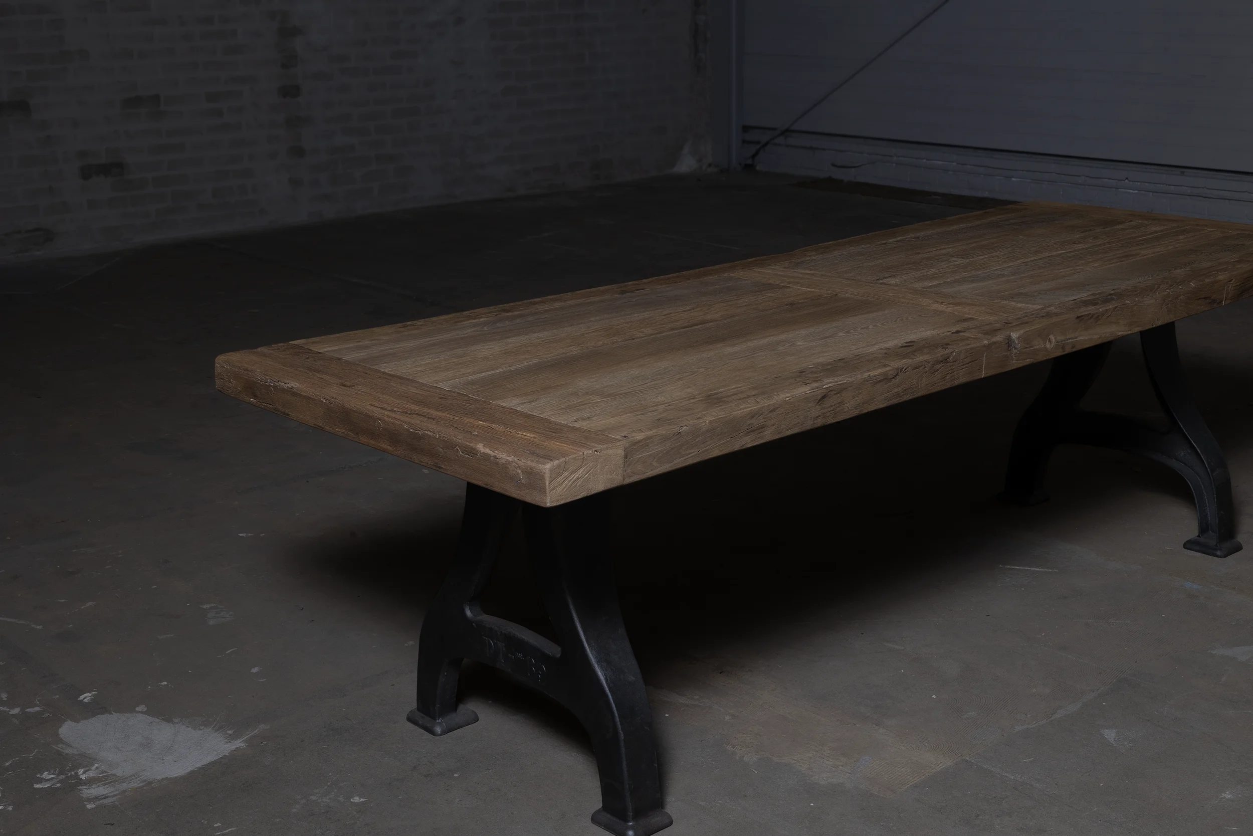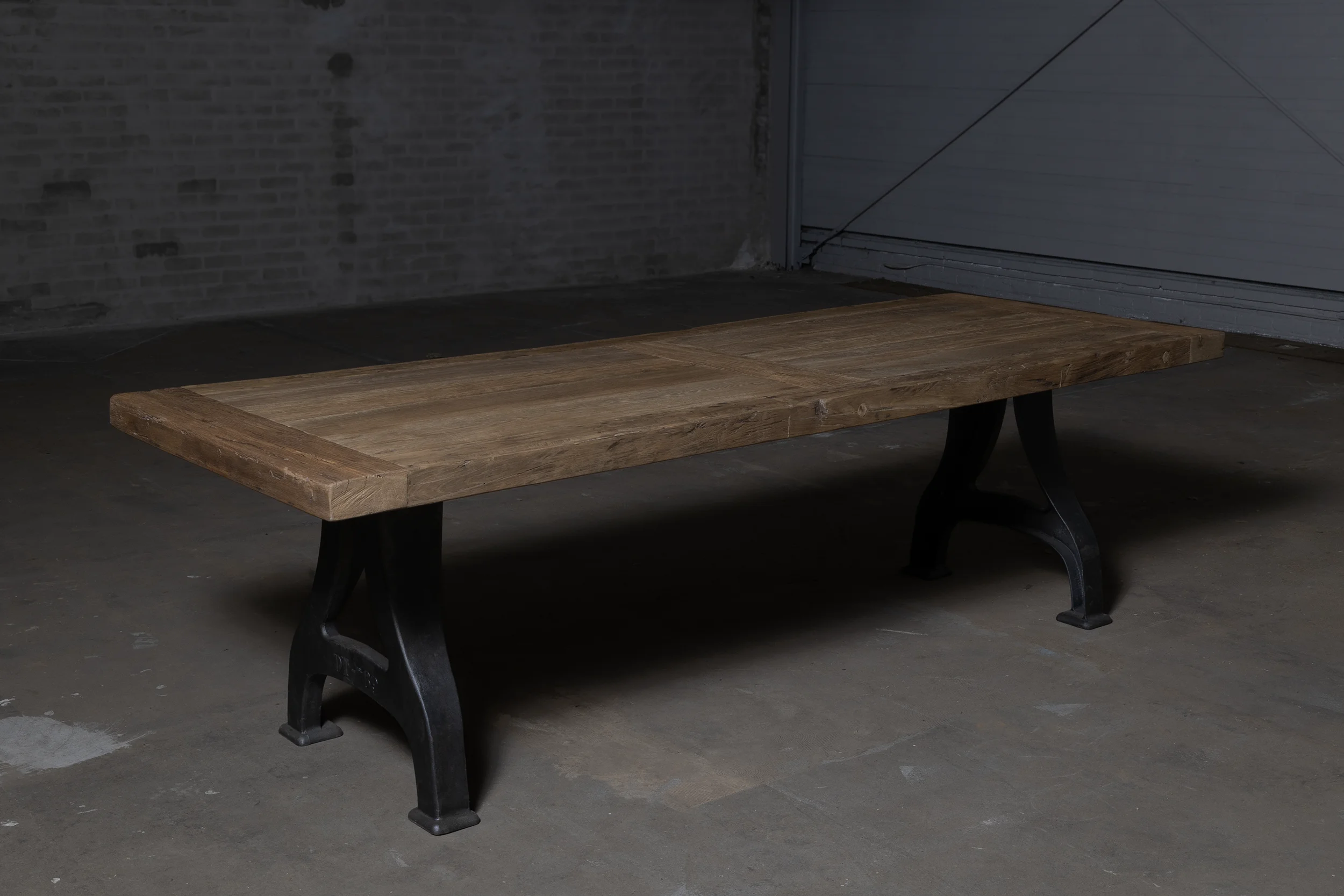Esstisch Industrial style hat ein Gusseisen Tischgestell. Die Tischplatte ist 7cm dick und verarbeitet aus dünnem sonnenverbrannten Altholz Eichen Brettern (gesägt aus die äußere Schicht alten Balken) die auf einer Möbelbauplatte geklebt sind.