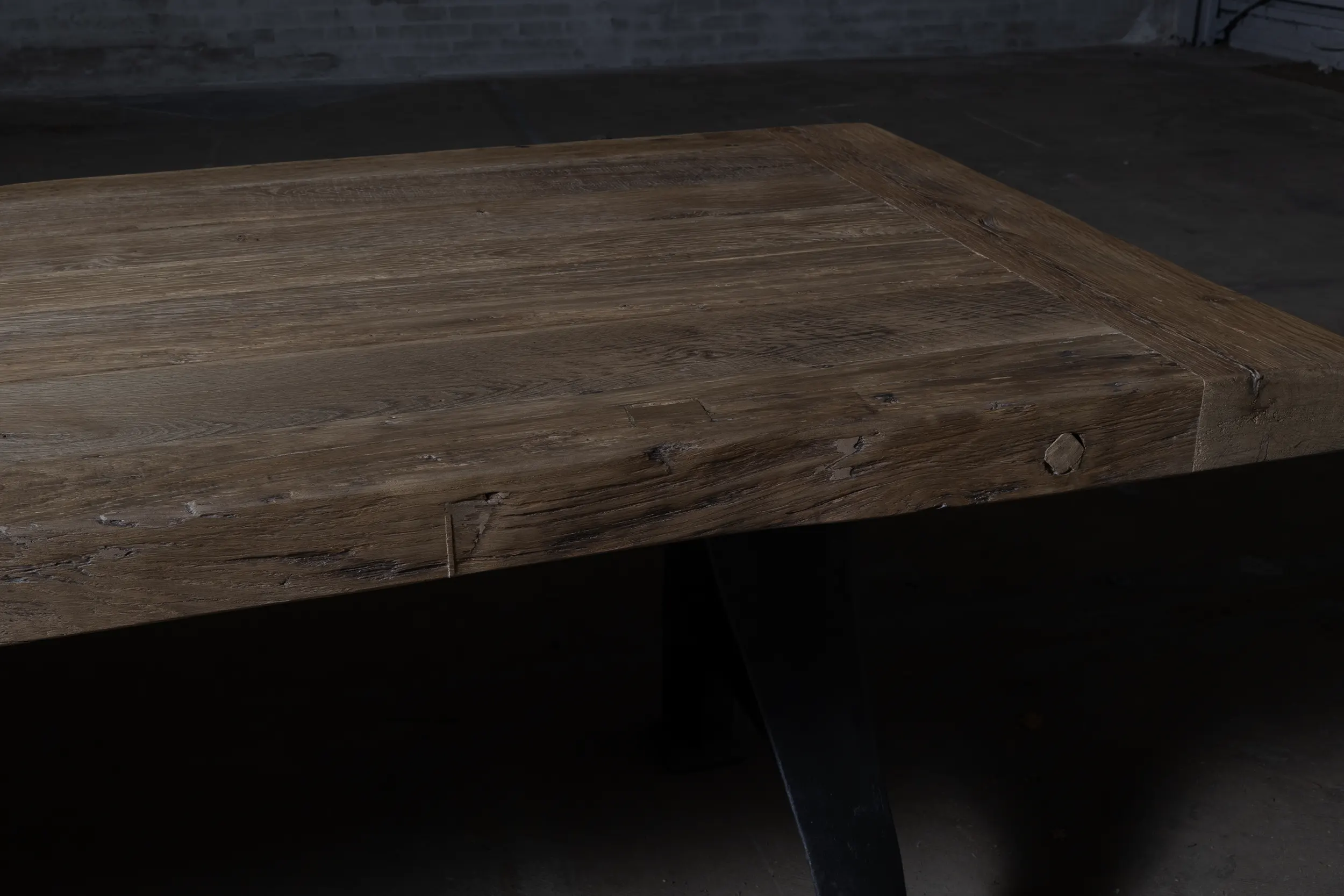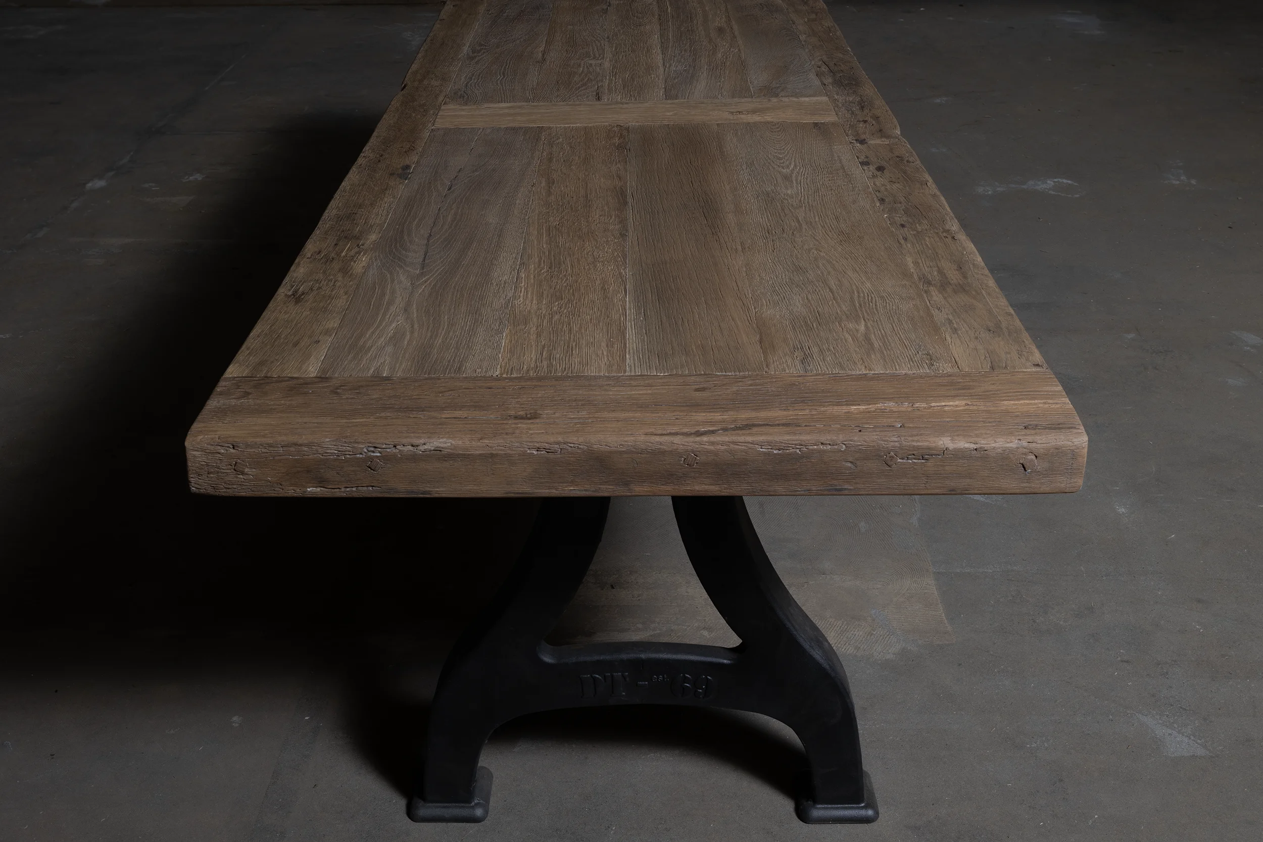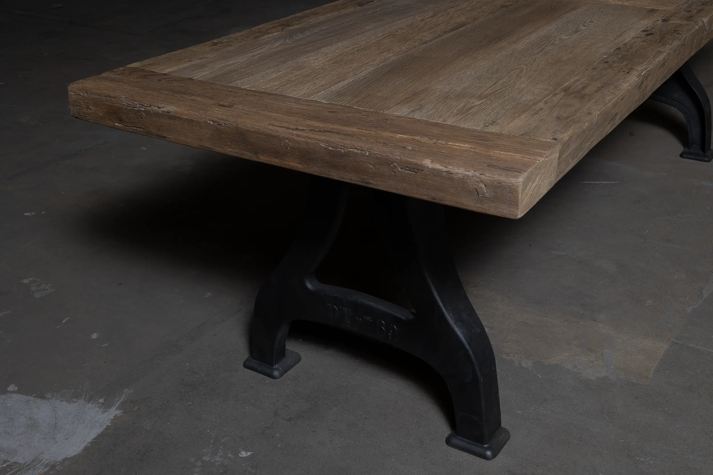 Esstisch Industrial style hat ein Gusseisen Tischgestell. Die Tischplatte ist 7cm dick und verarbeitet aus dünnem sonnenverbrannten Altholz Eichen Brettern (gesägt aus die äußere Schicht alten Balken) die auf einer Möbelbauplatte geklebt sind.