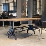 Die Tischplatte ist aus langlebiger alter Eiche aus Mitteleuropa gefertigt. Dieses Holz dient seit vielen Jahren als Verkleidung von Bauernställen in Zentraleuropa. Dort haben Regen und Sonne ihm eine schöne Patina verliehen.