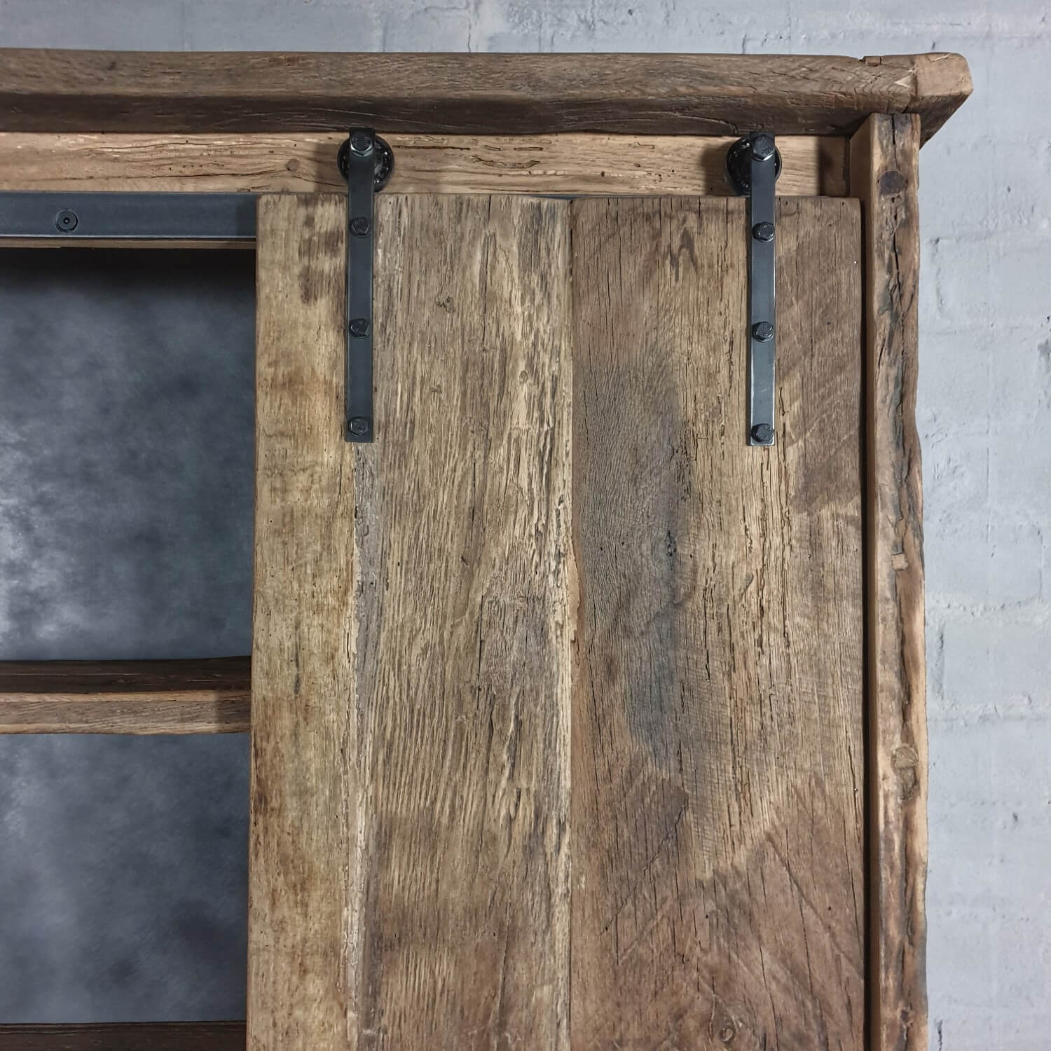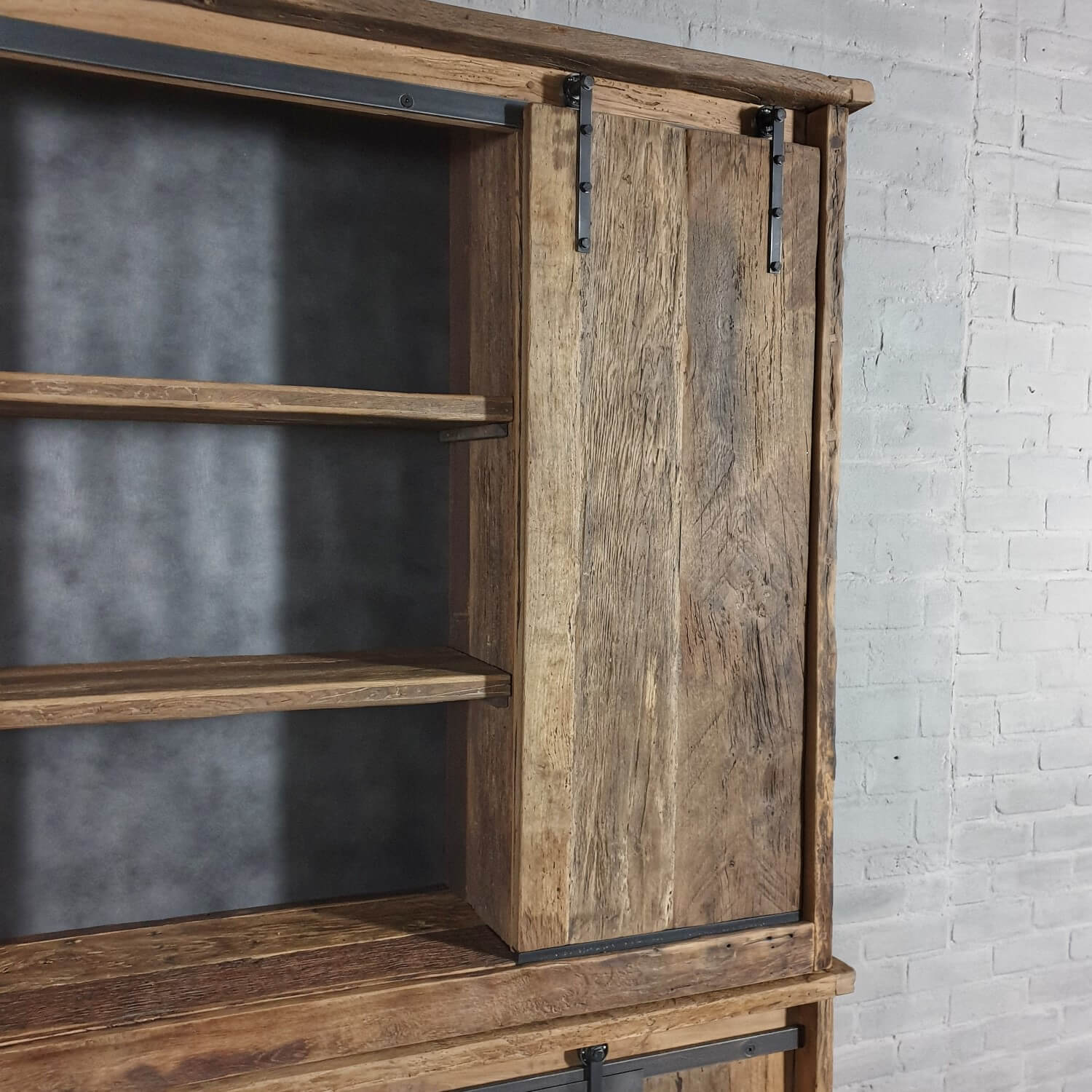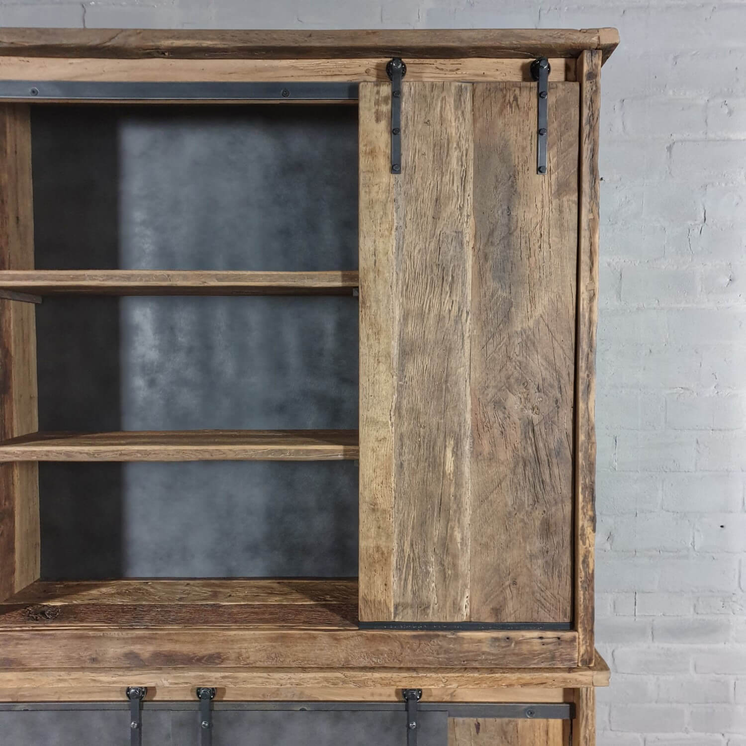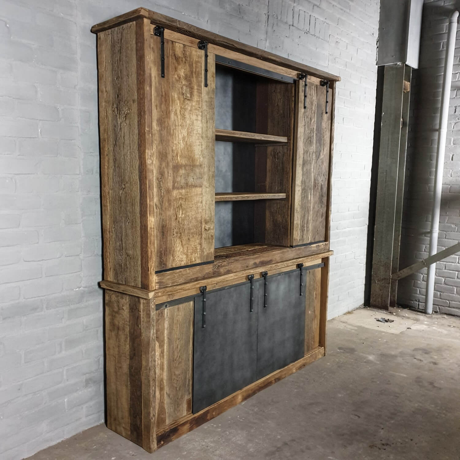 Dieser Industrieschrank wird in unserer eigenen Werkstatt aus sonnenverbranntem Altholz Eiche in Kombination mit Stahlschiebetüren hergestellt.