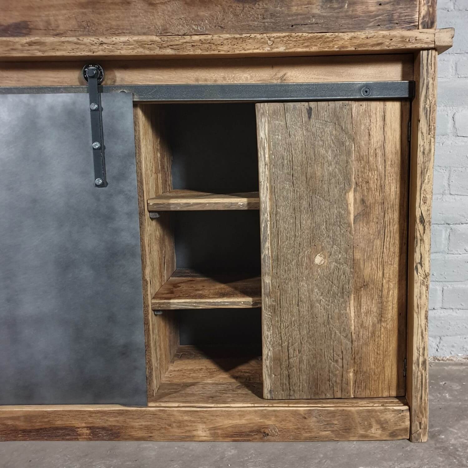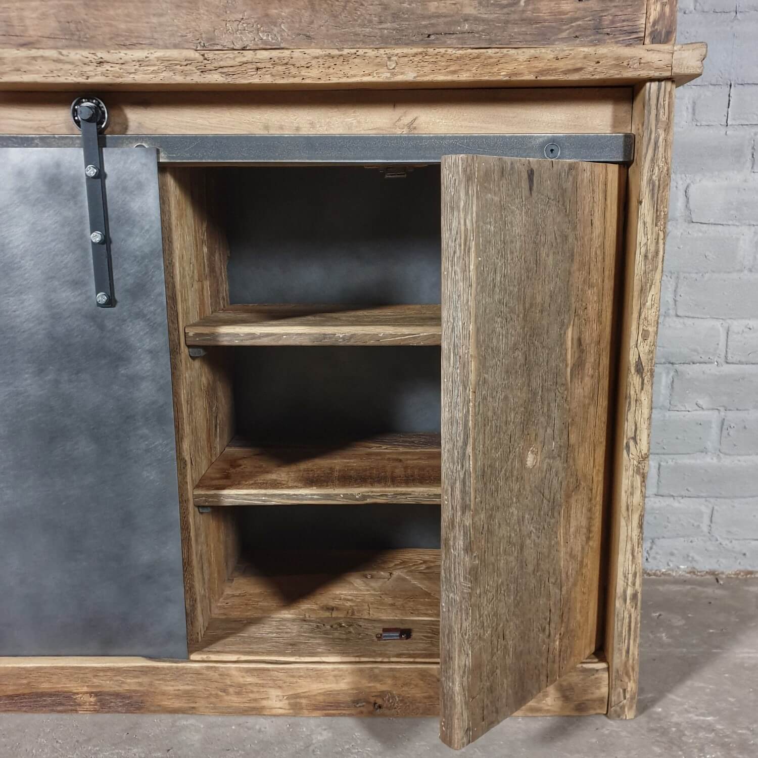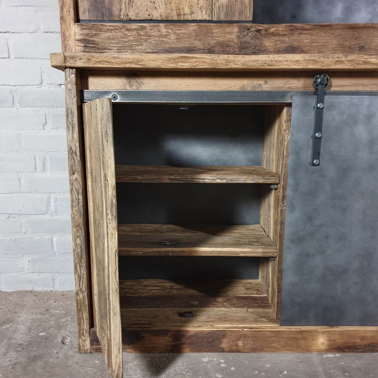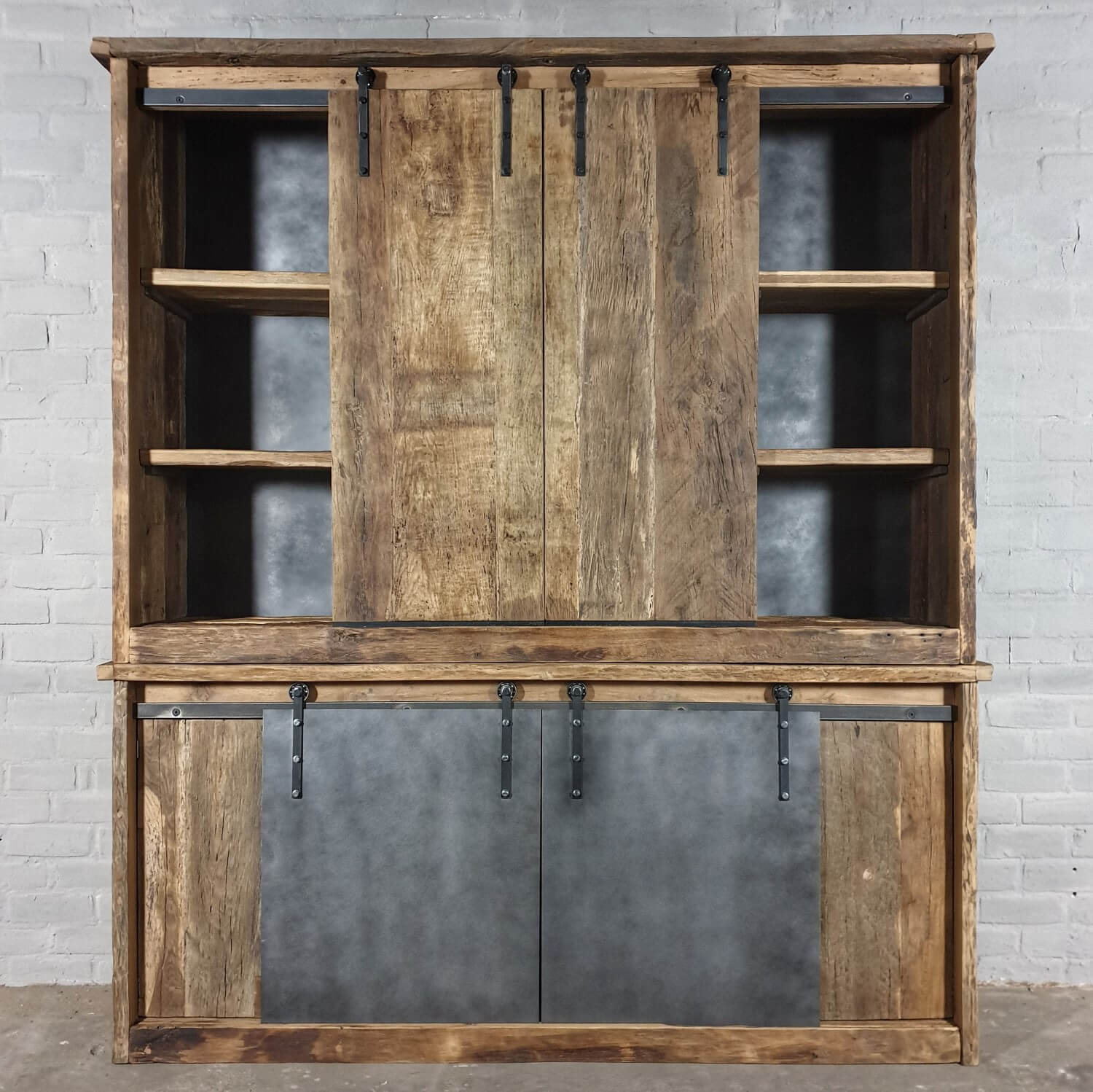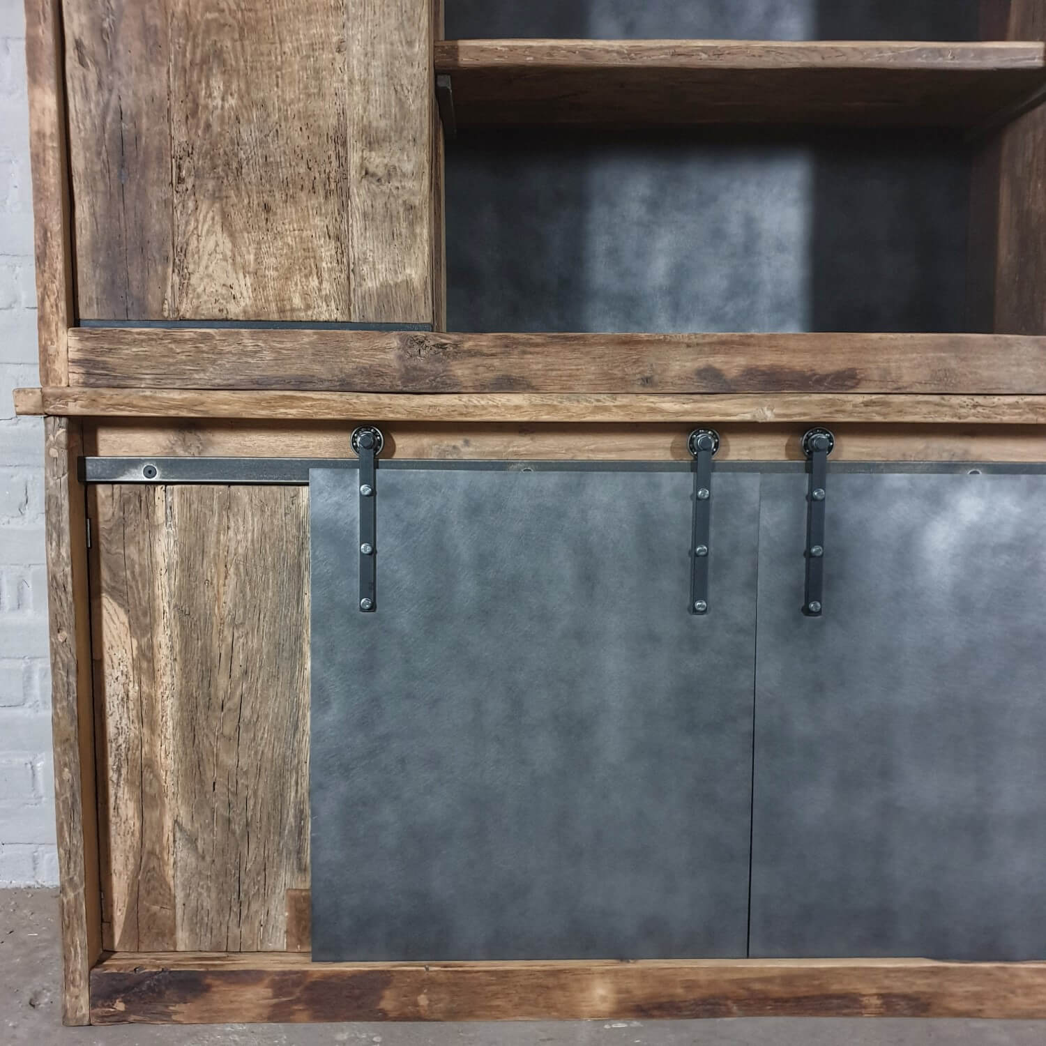 Dieser Industrieschrank wird in unserer eigenen Werkstatt aus sonnenverbranntem Altholz Eiche in Kombination mit Stahlschiebetüren hergestellt.