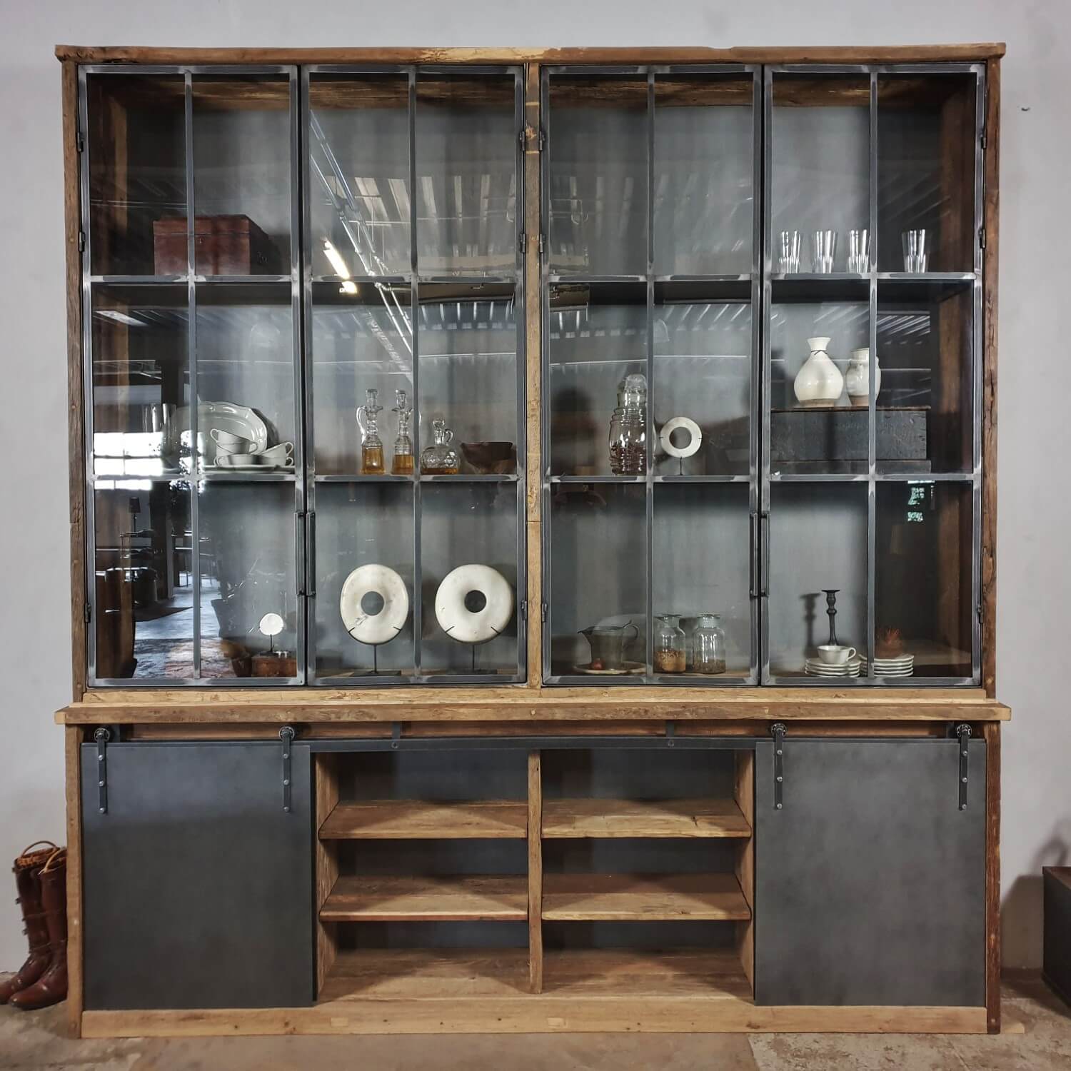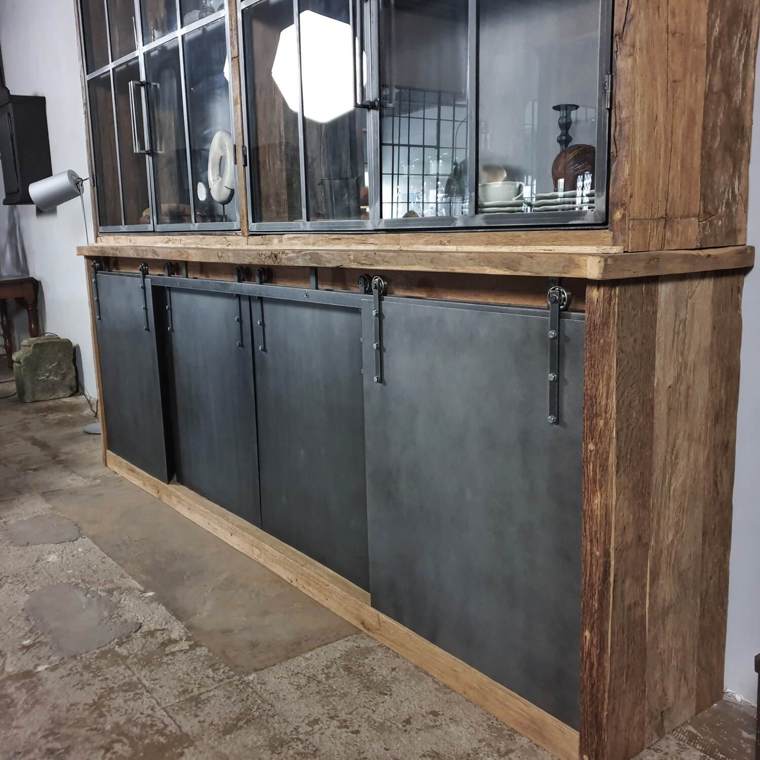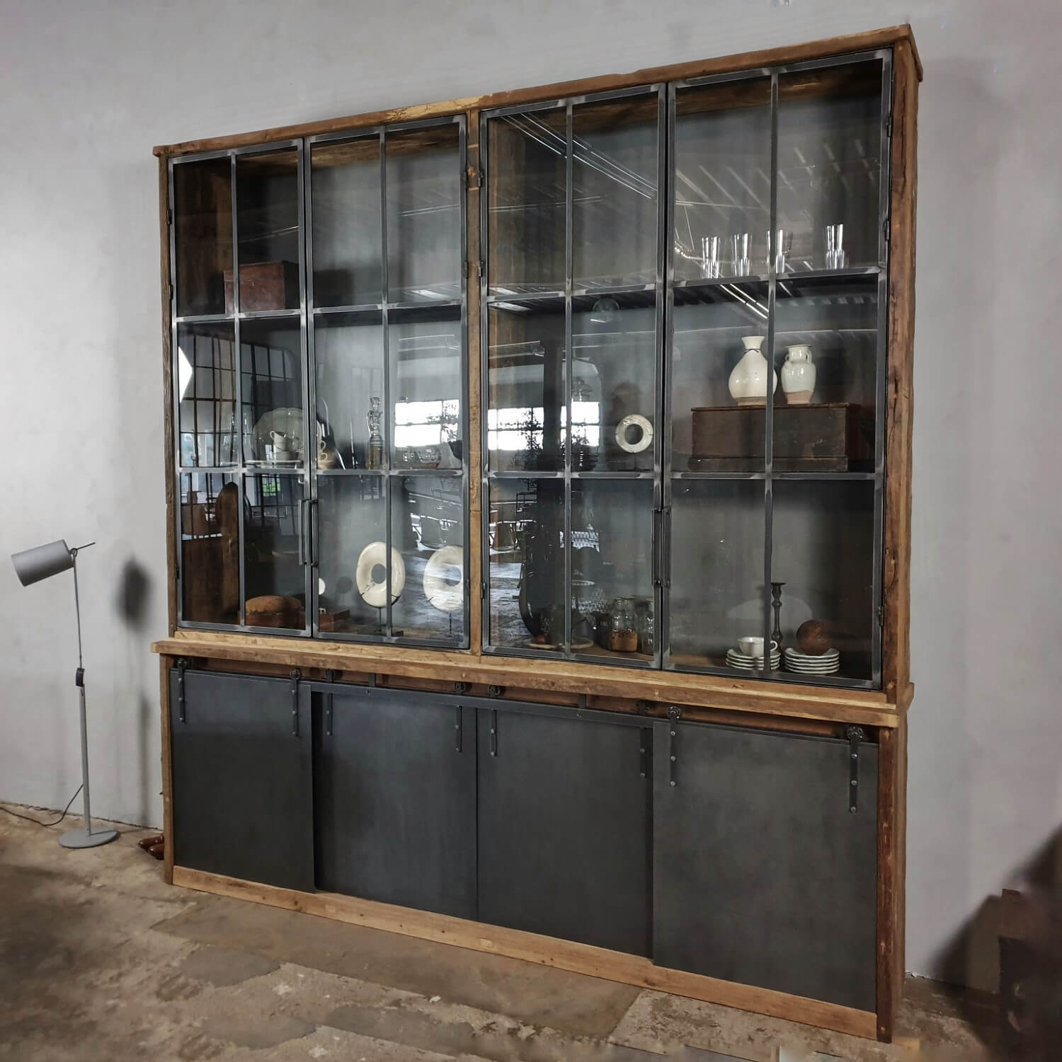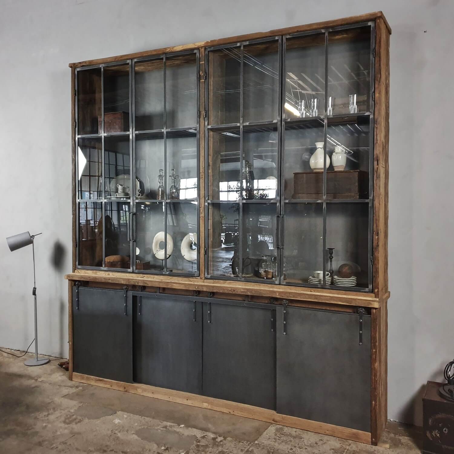 Dieser extra große Industriedesign wandschrank ist aus altem Eichenholz in Kombination mit Stahlrolltüren und Stahlglastüren gefertigt. Wir liefern Handwerkskunst von höchster Qualität, so dass wir den gesamten Schrank für Sie nach Maß anfertigen können. Ein kleinerer Schrank, andere Türen oder mehr Einlegeböden? Fast alles ist möglich.