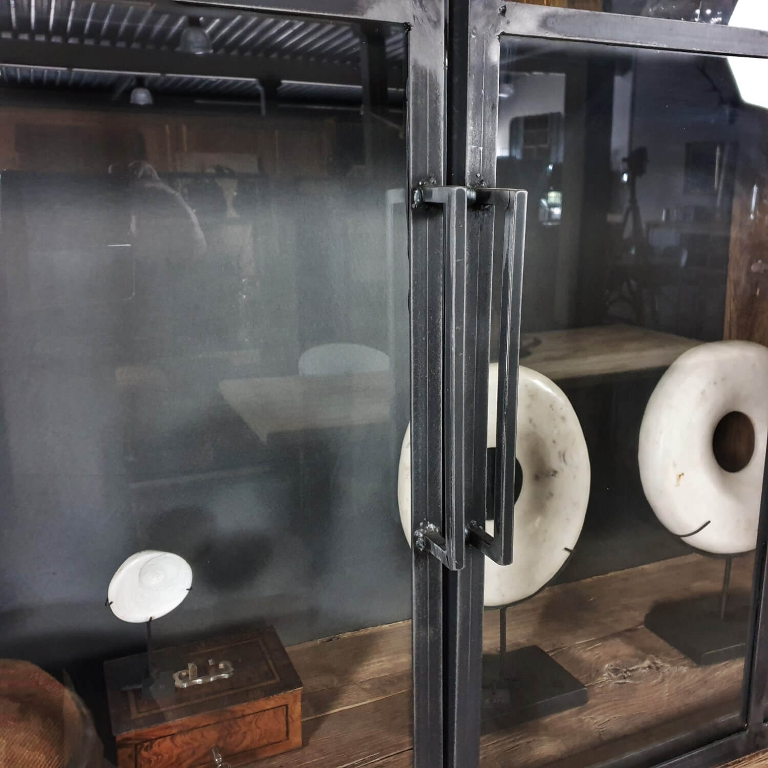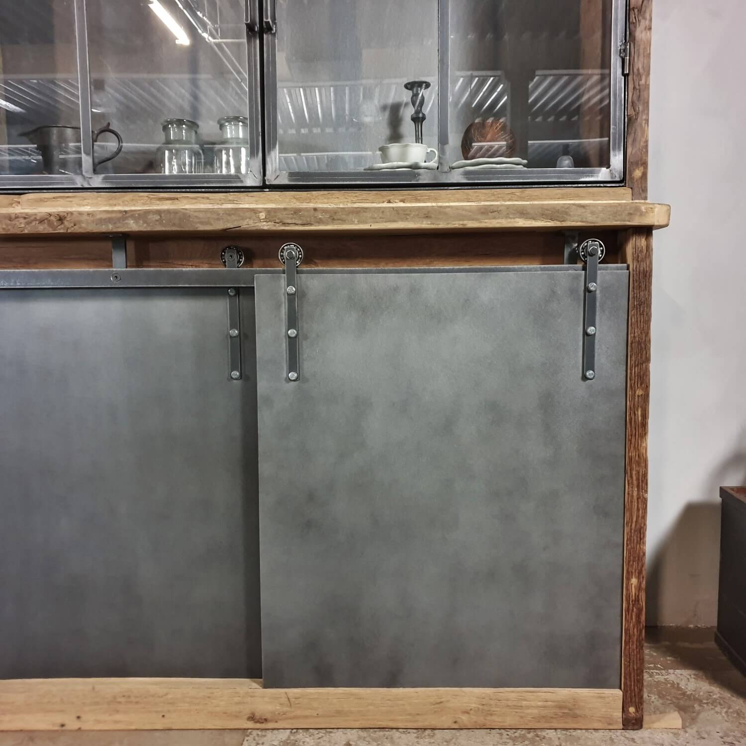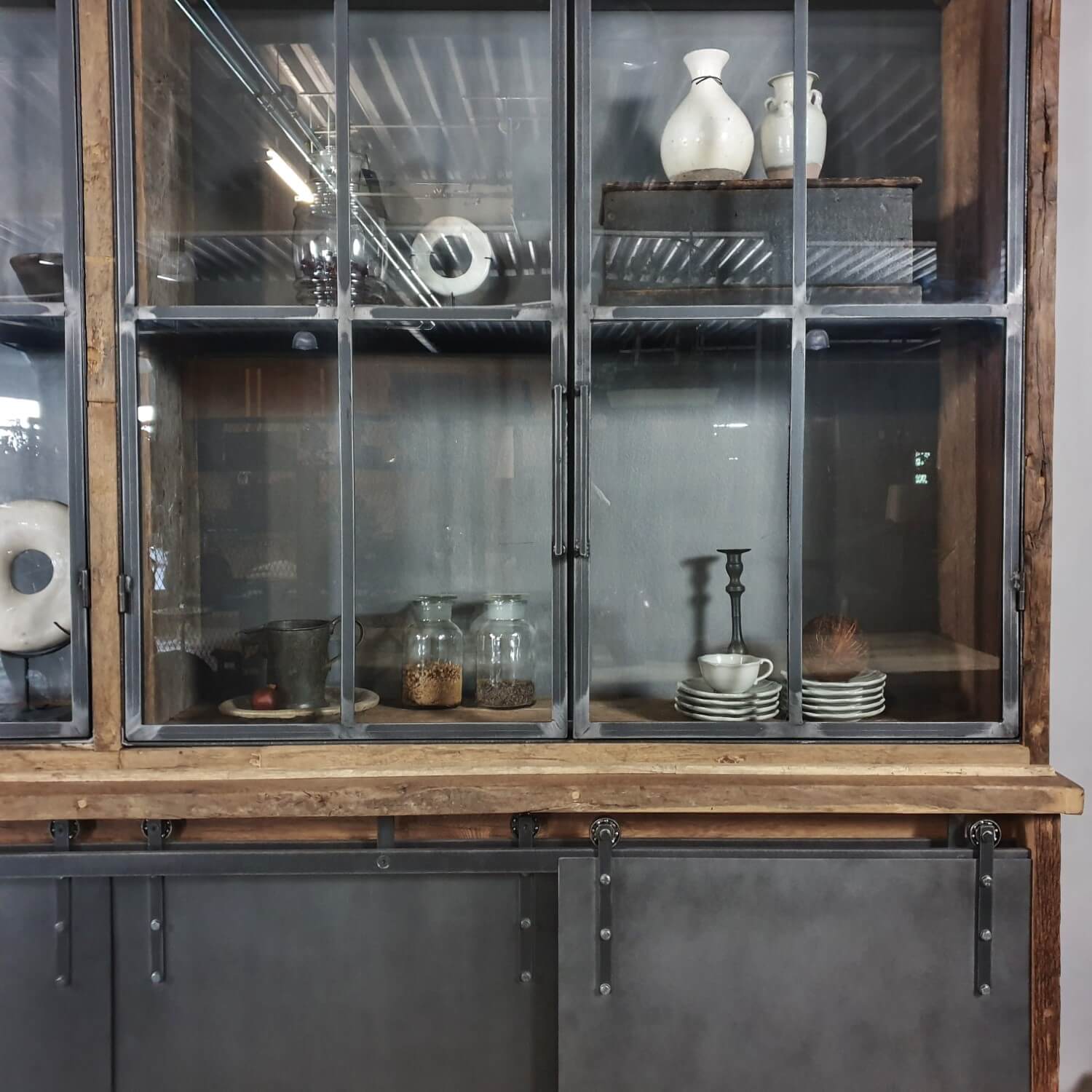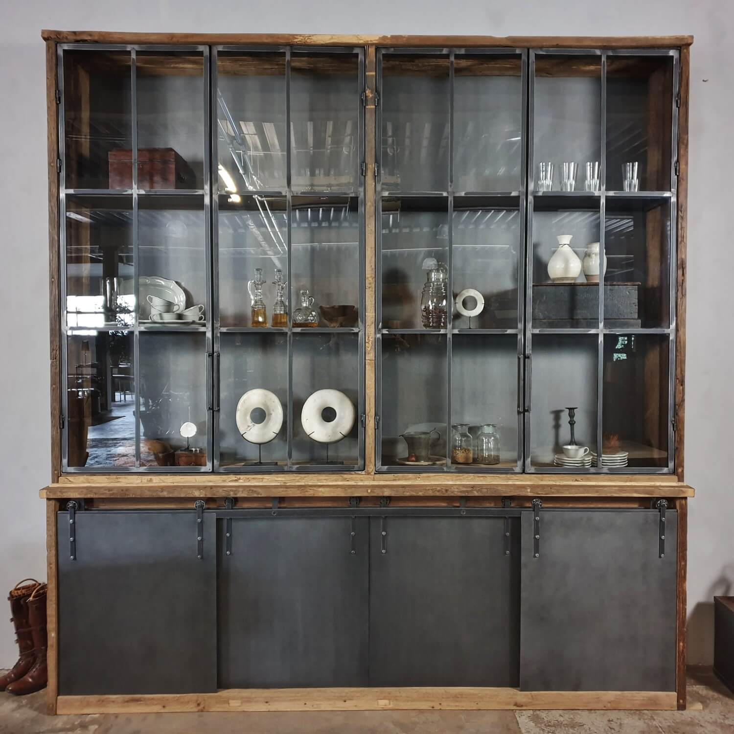 Dieser extra große Industriedesign wandschrank ist aus altem Eichenholz in Kombination mit Stahlrolltüren und Stahlglastüren gefertigt. Wir liefern Handwerkskunst von höchster Qualität, so dass wir den gesamten Schrank für Sie nach Maß anfertigen können. Ein kleinerer Schrank, andere Türen oder mehr Einlegeböden? Fast alles ist möglich.