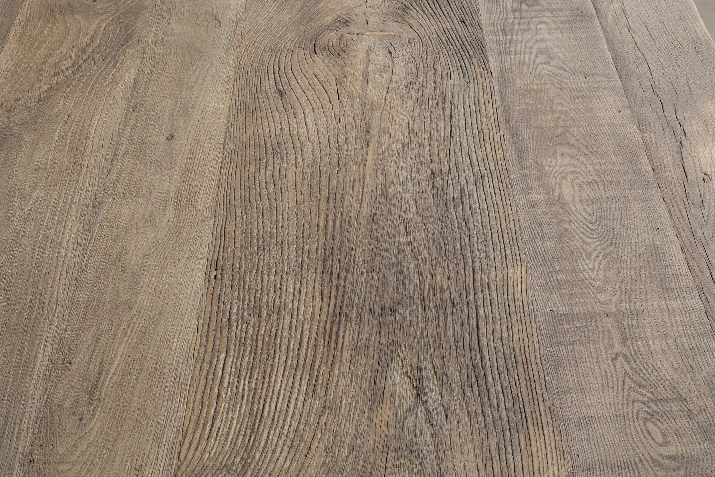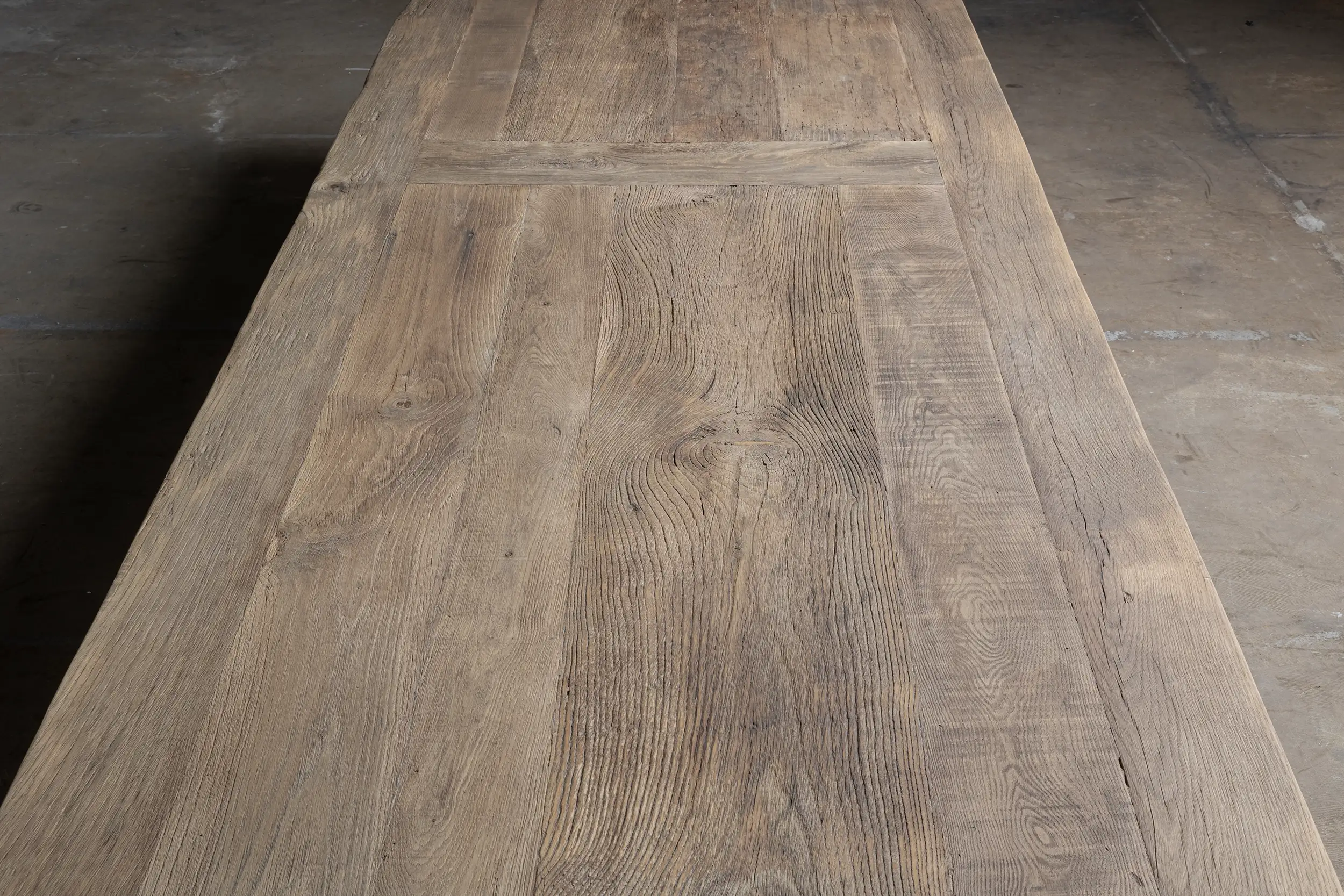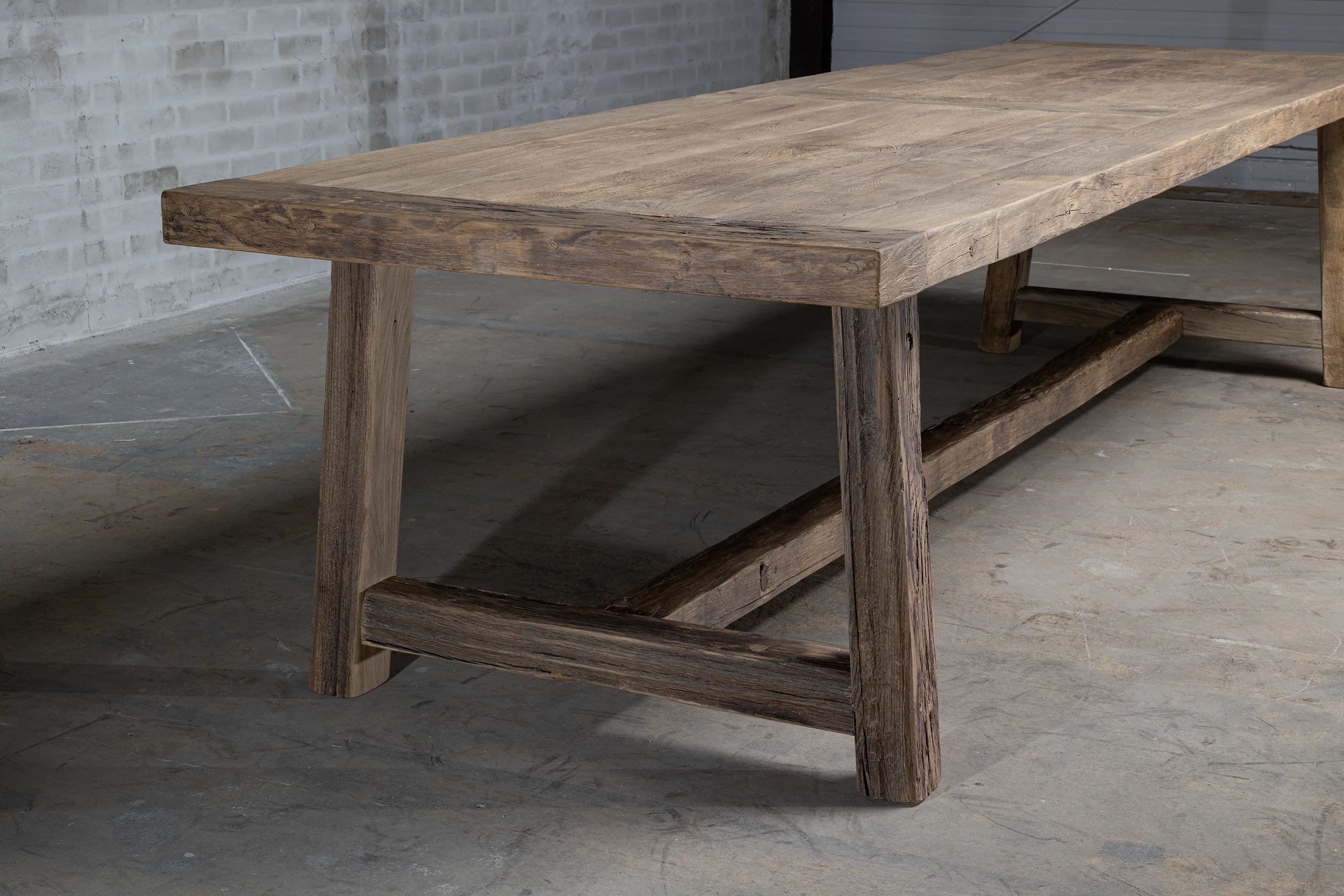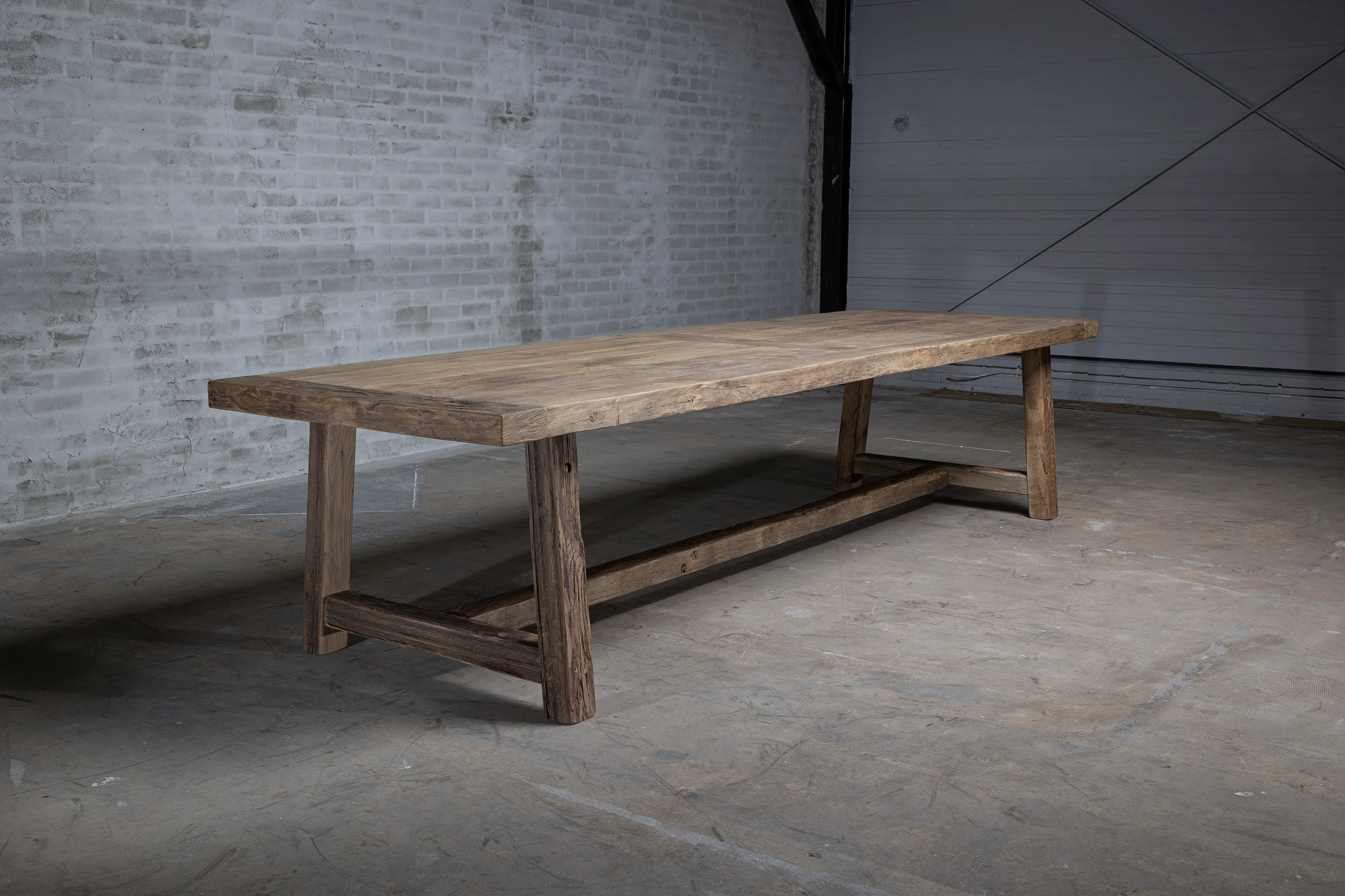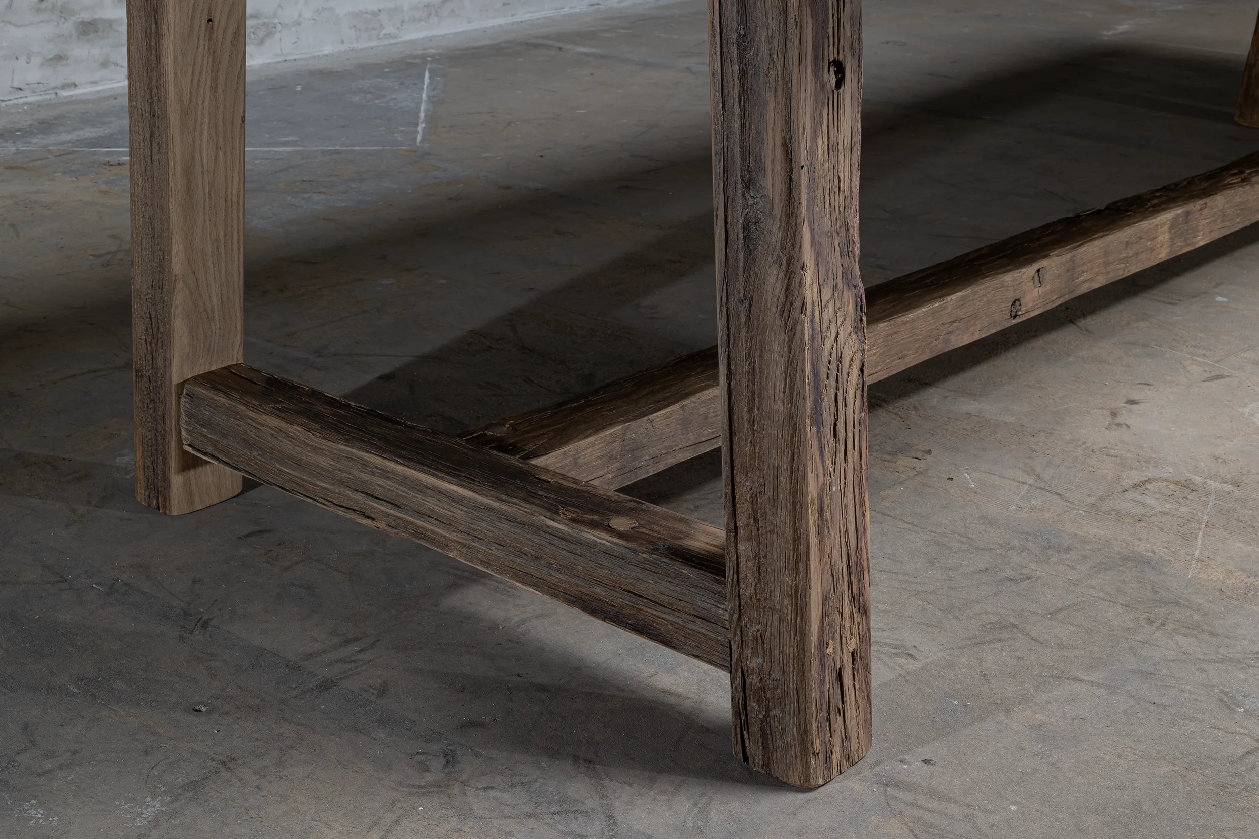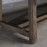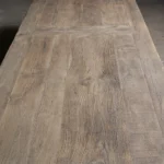 Die Außenkante der Tischplatte besteht aus 7 cm dicken Massivholzbalken. Die Innenseite besteht aus Holzbrettern, die auf einer Möbelplatte befestigt sind. Da das Eichenholz jahrzehntelang als Verkleidung in der Sonne gelegen hat, hat es eine schöne Patina bekommen. Tischplatte und Tischbein aus Holz sind fleckenfest behandelt.