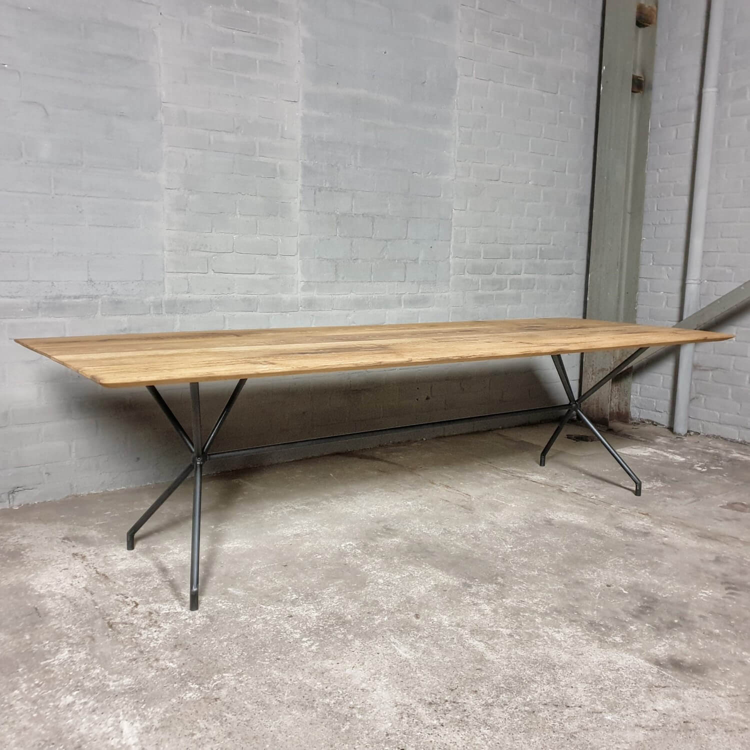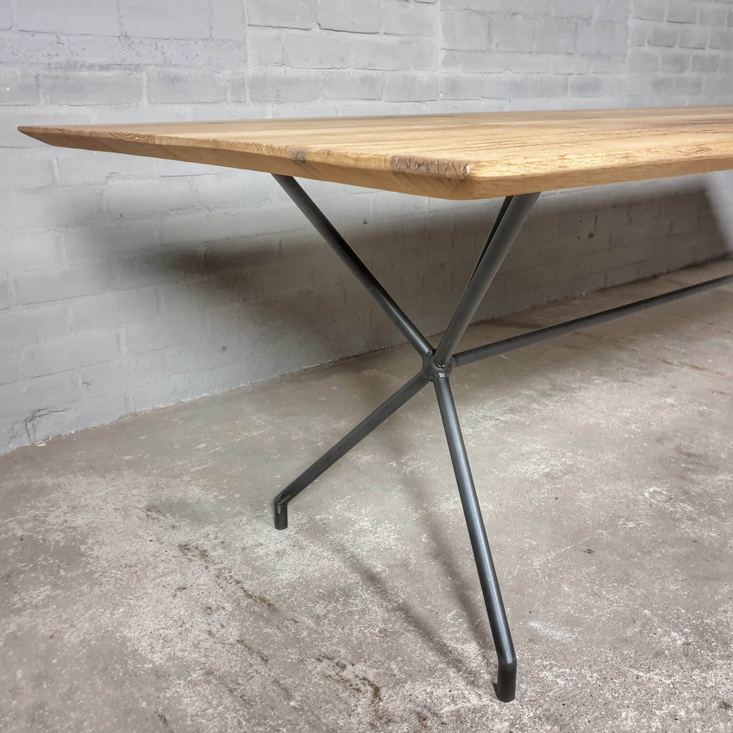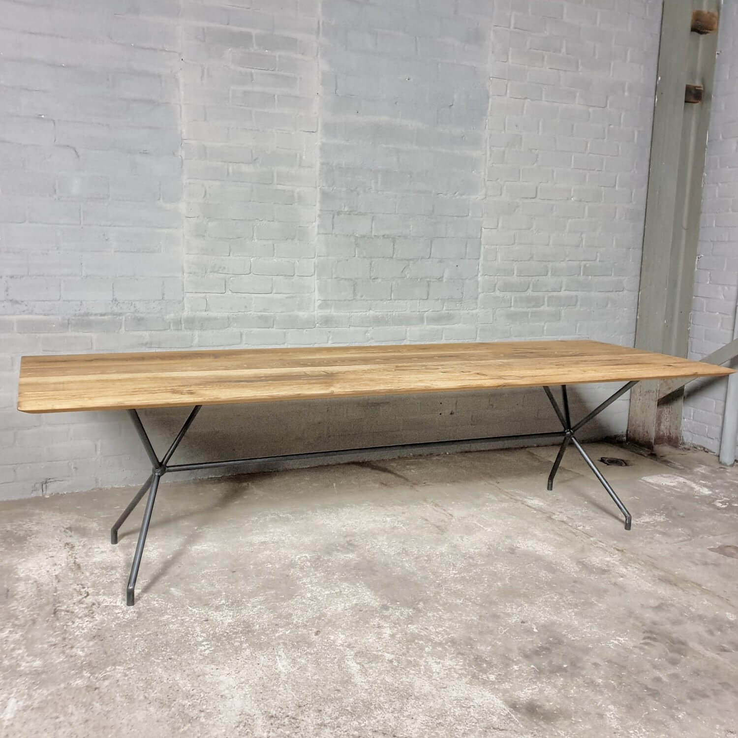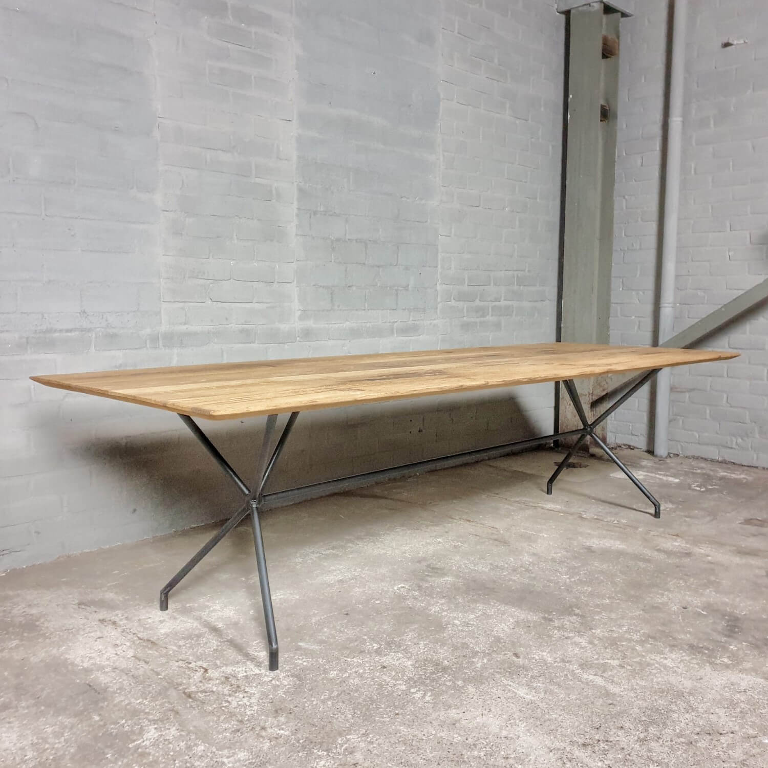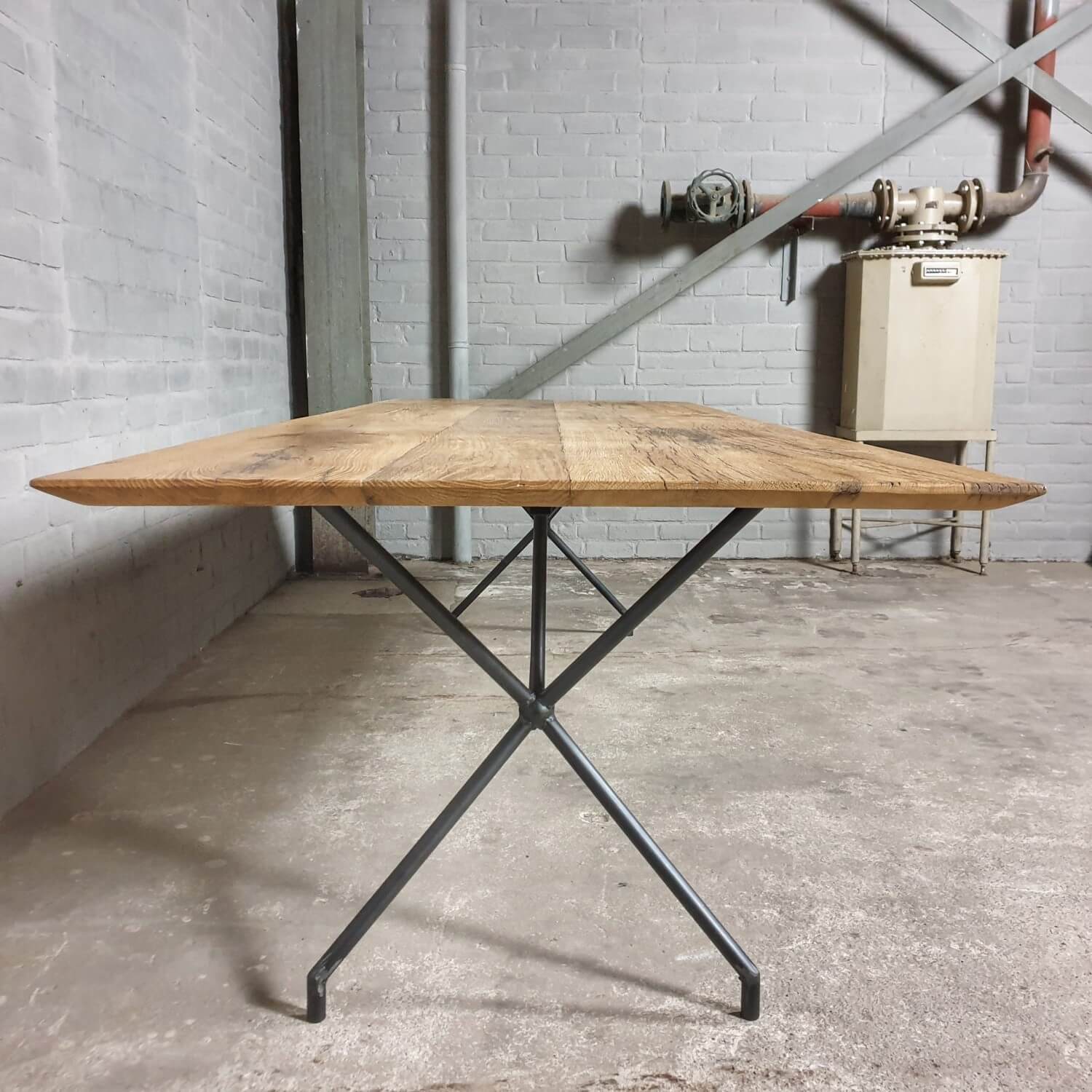 Dieser stilvolle Esstisch hat eine elegante Stahlbasis die ihm ein modernes Aussehen verleiht. Die Tischplatte mit facettierter Kante besteht aus massiver, sonnenverbrannter Eiche. Dieser Tisch ist vorrätig und direkt lieferbar: mit der Platte die zu sehen ist auf dem letzten Bild der Reihe.