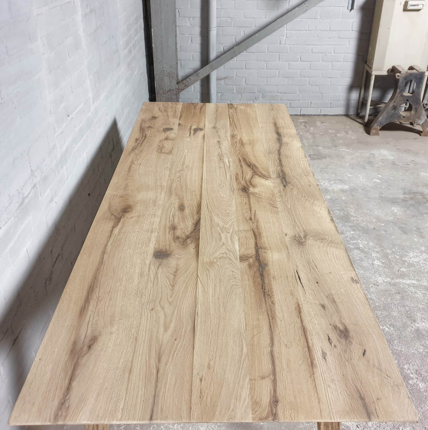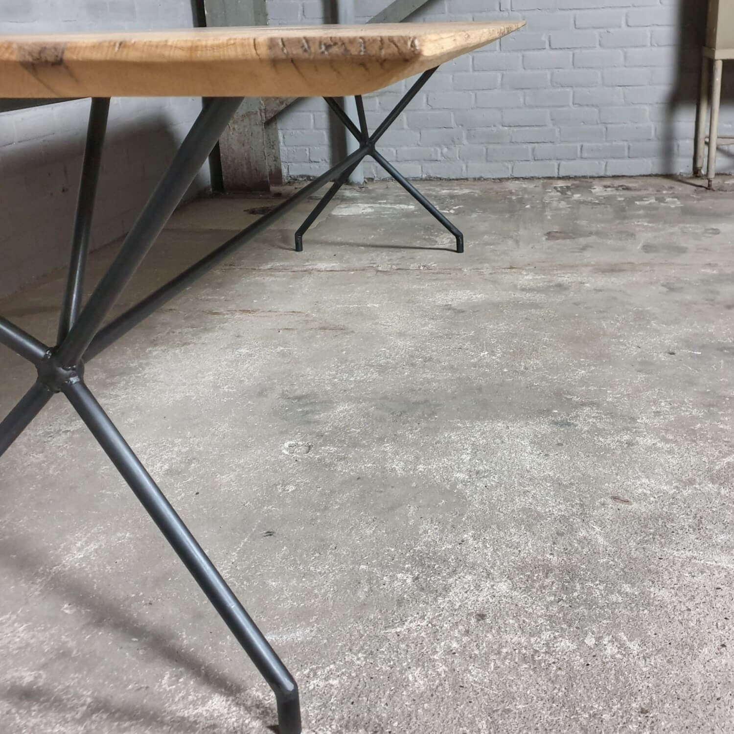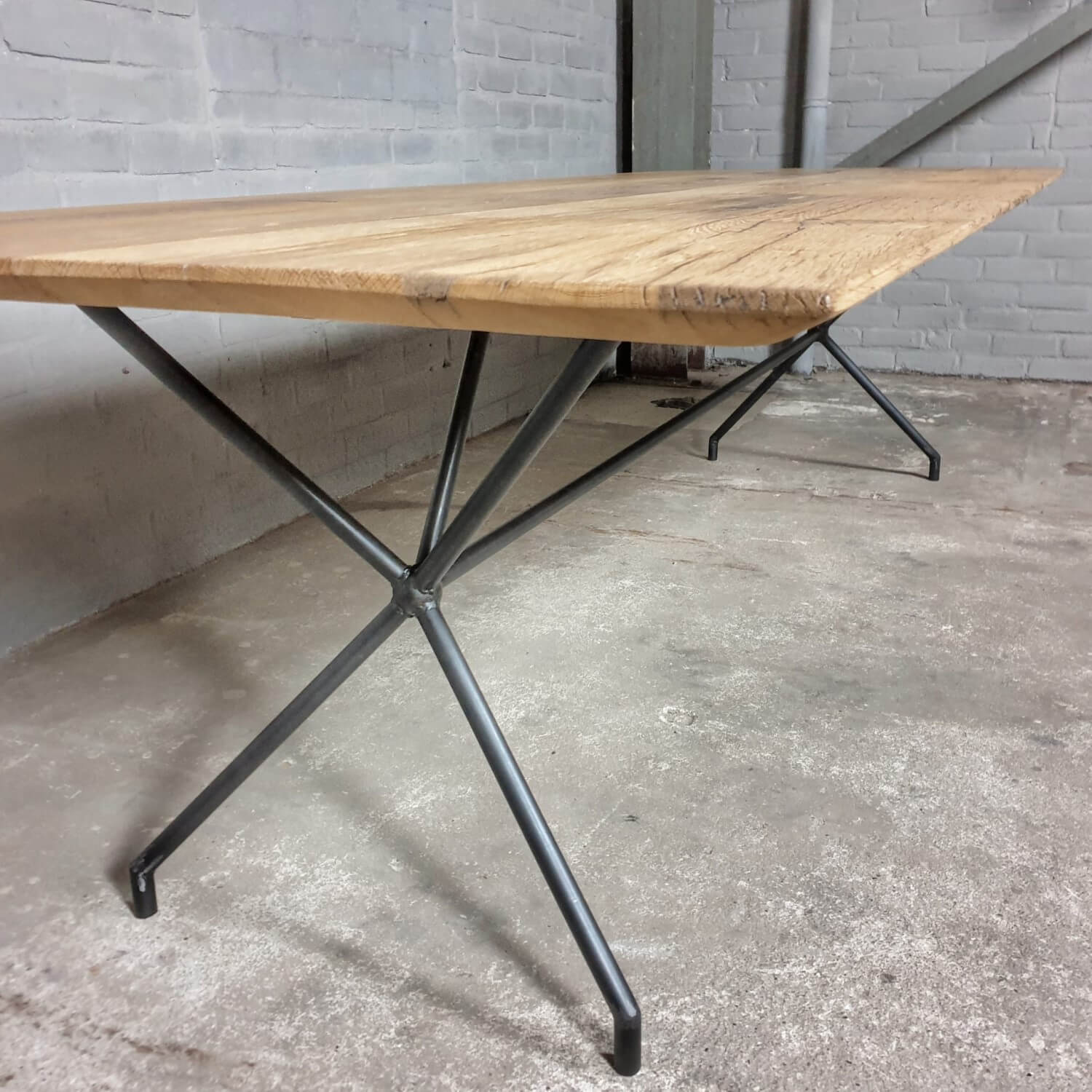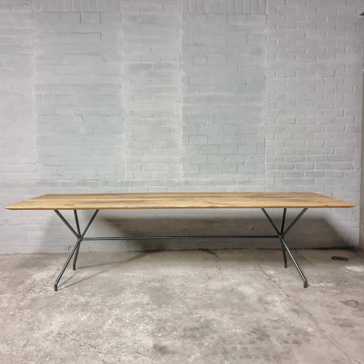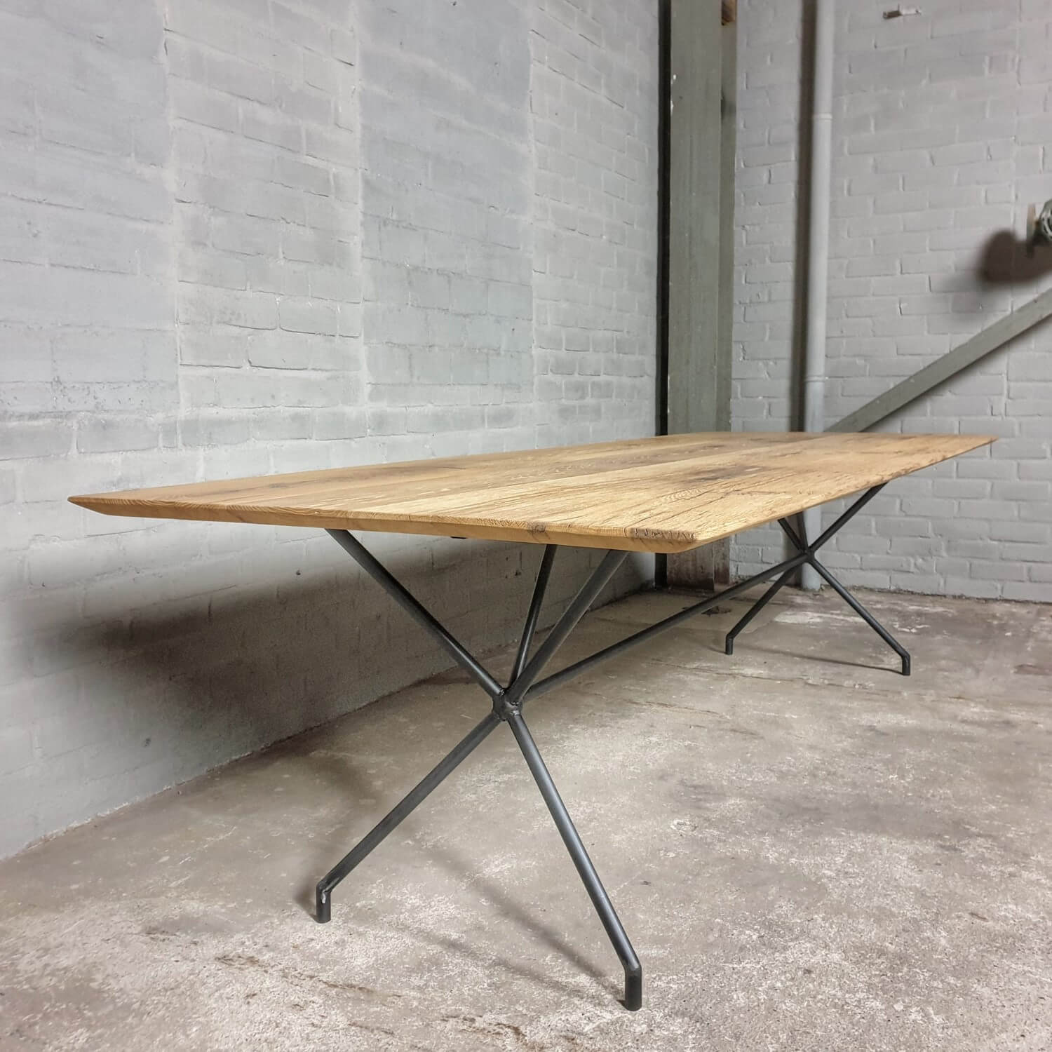 Dieser stilvolle Esstisch hat eine elegante Stahlbasis die ihm ein modernes Aussehen verleiht. Die Tischplatte mit facettierter Kante besteht aus massiver, sonnenverbrannter Eiche. Dieser Tisch ist vorrätig und direkt lieferbar: mit der Platte die zu sehen ist auf dem letzten Bild der Reihe.
