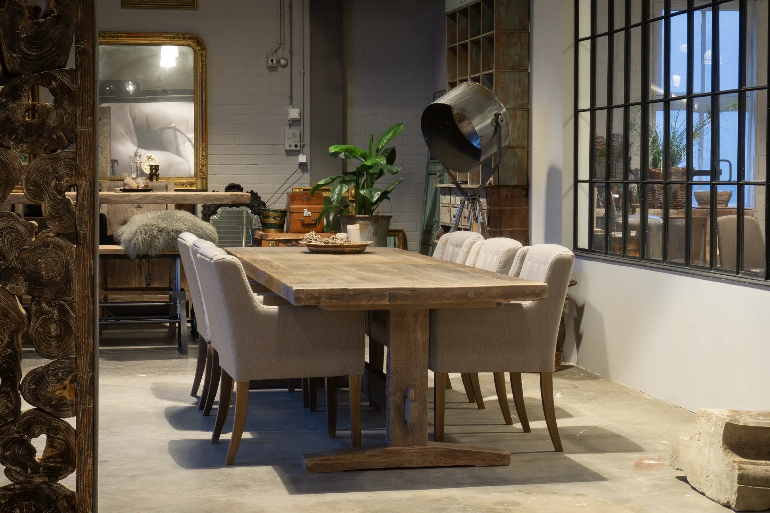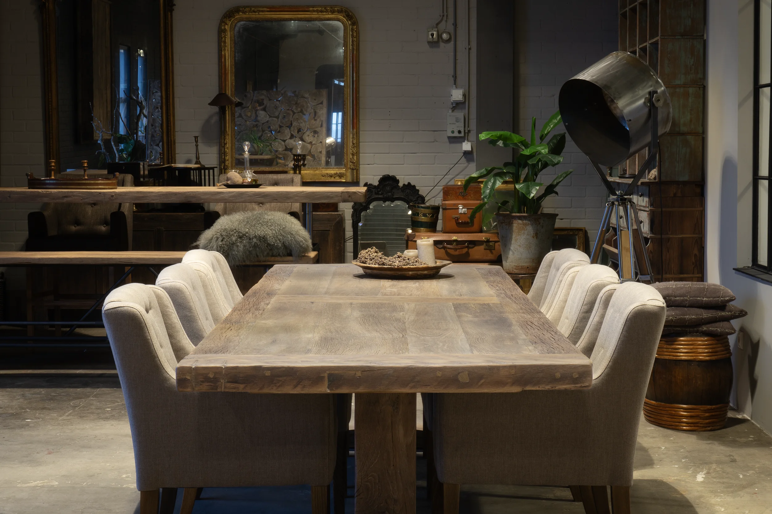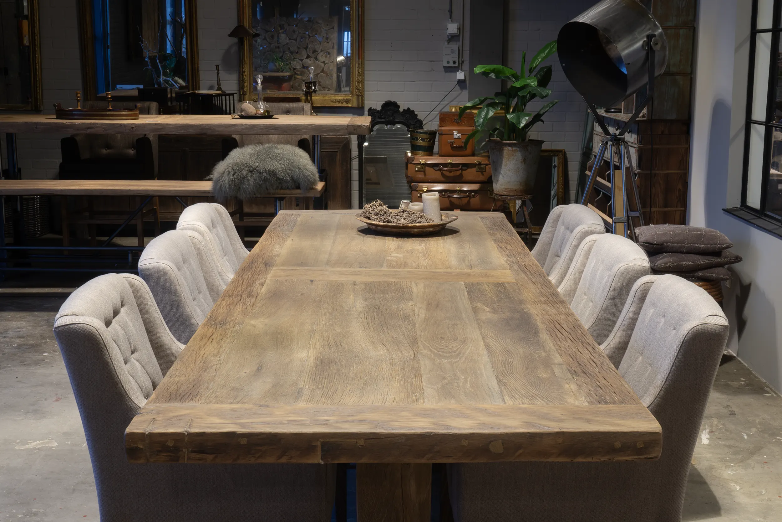 Die Tischplatte ist 7cm dick und wird verarbeitet aus dünnem sonnenverbrannten Altholz Eichen Brettern (gesägt aus die äußere Schicht alten Balken) die auf einer Möbelbauplatte geklebt sind. Die Außenkanten der Tischplatte sind aus massiven Brettern. Die sonnenverbrannten Bretter stammen aus alten Häusern, und haben eine wunderschöne Patina von der Sonne getönt!