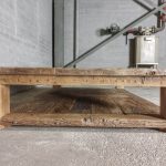 Die Tischplatte wird verarbeitet aus dünnem sonnenverbrannten Altholz Eichen Brettern (gesägt aus die äußere Schicht alten Balken) die auf einer Möbelbauplatte geklebt sind. Die Außenkanten der Tischplatte sind aus massiven Brettern. Die sonnenverbrannten Bretter stammen aus alten Häusern, und haben eine wunderschöne Patina. Von der Sonne getönt!
