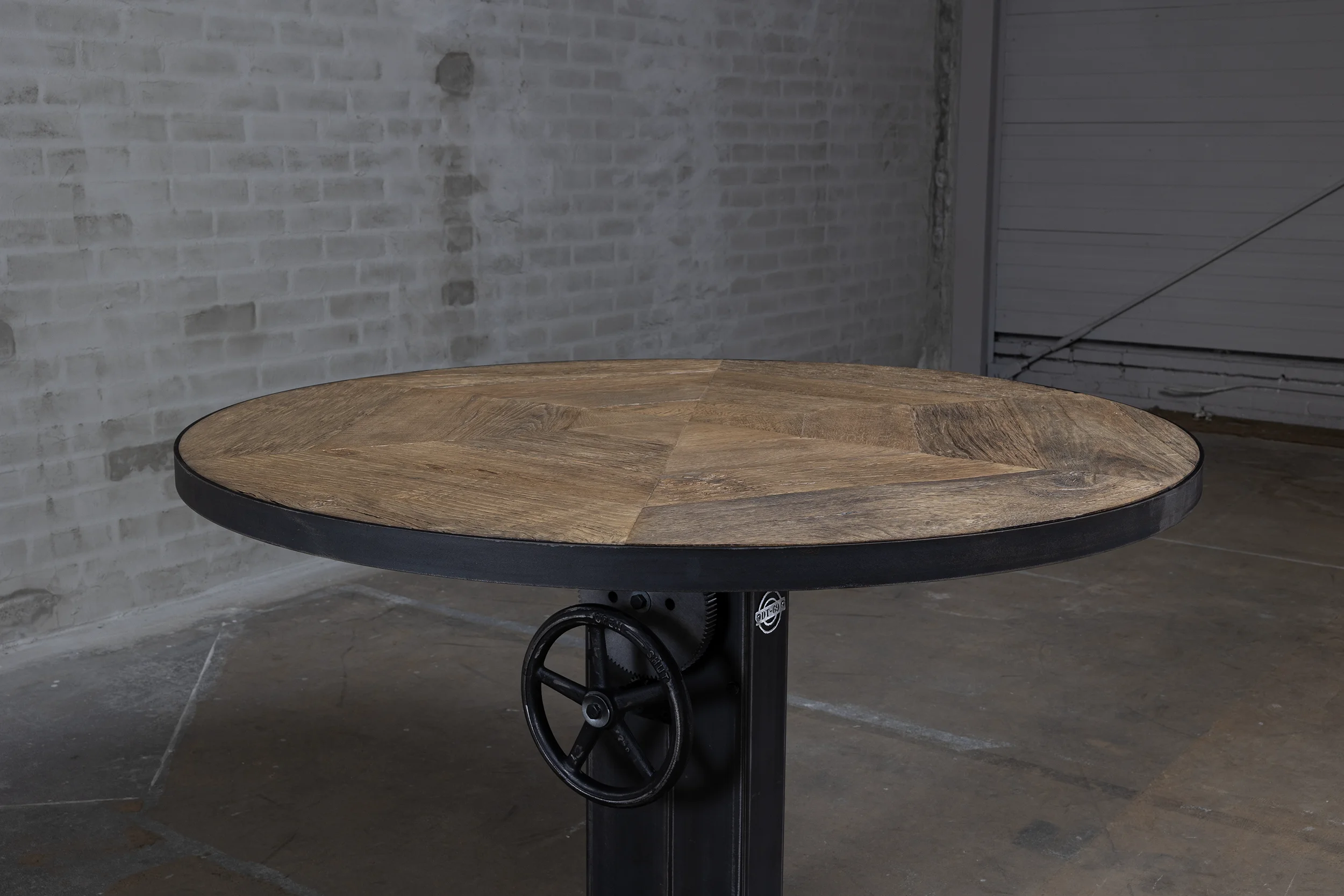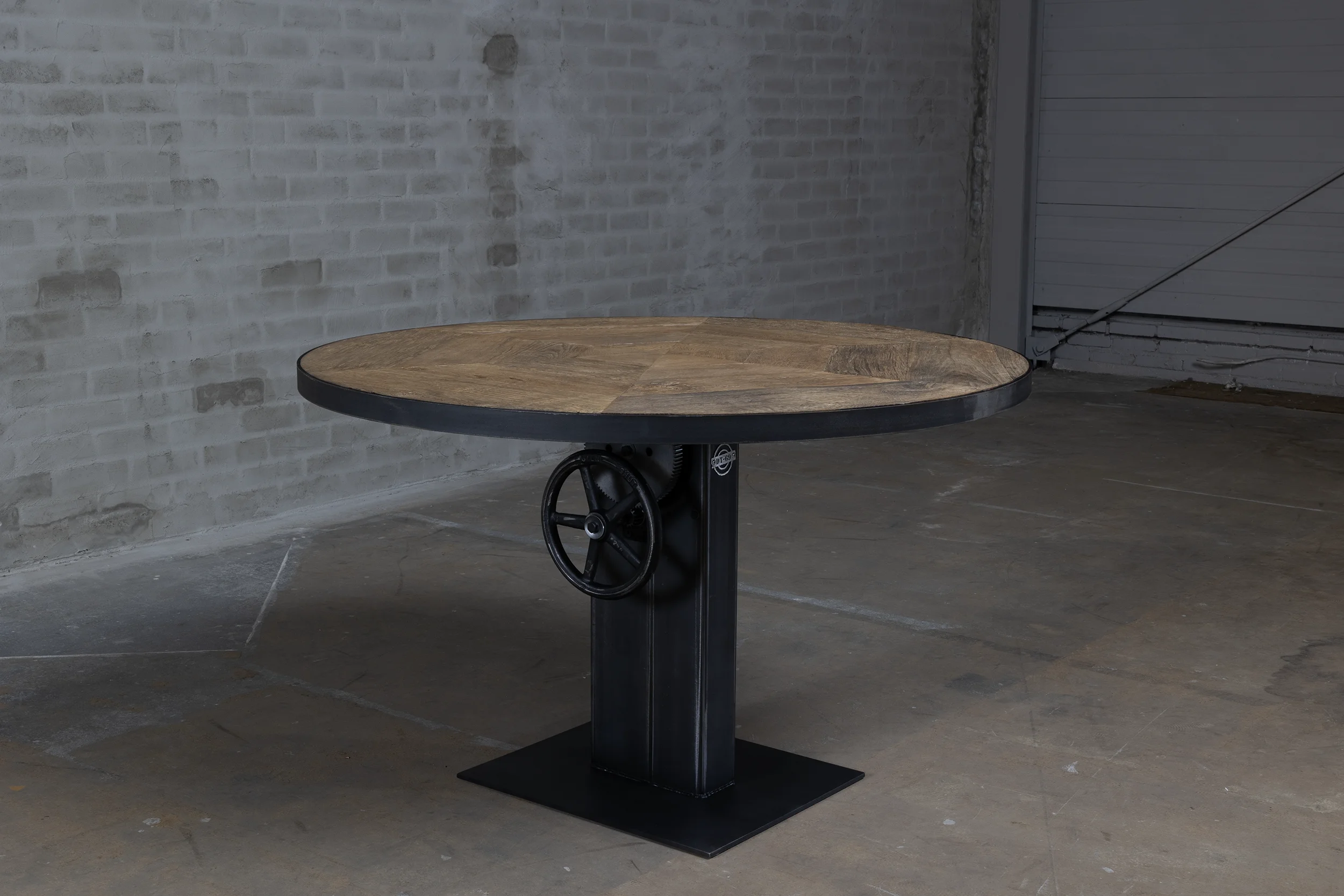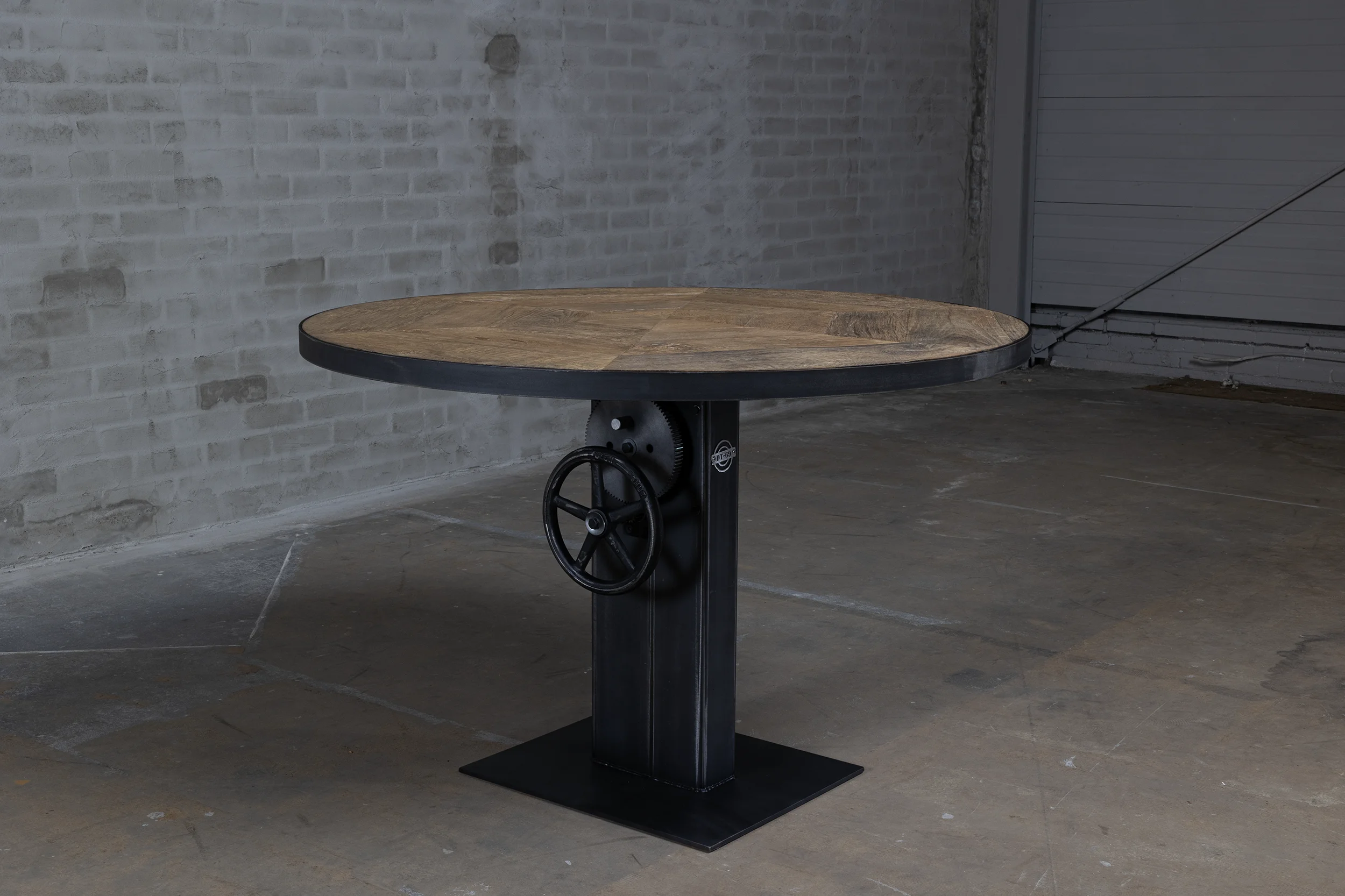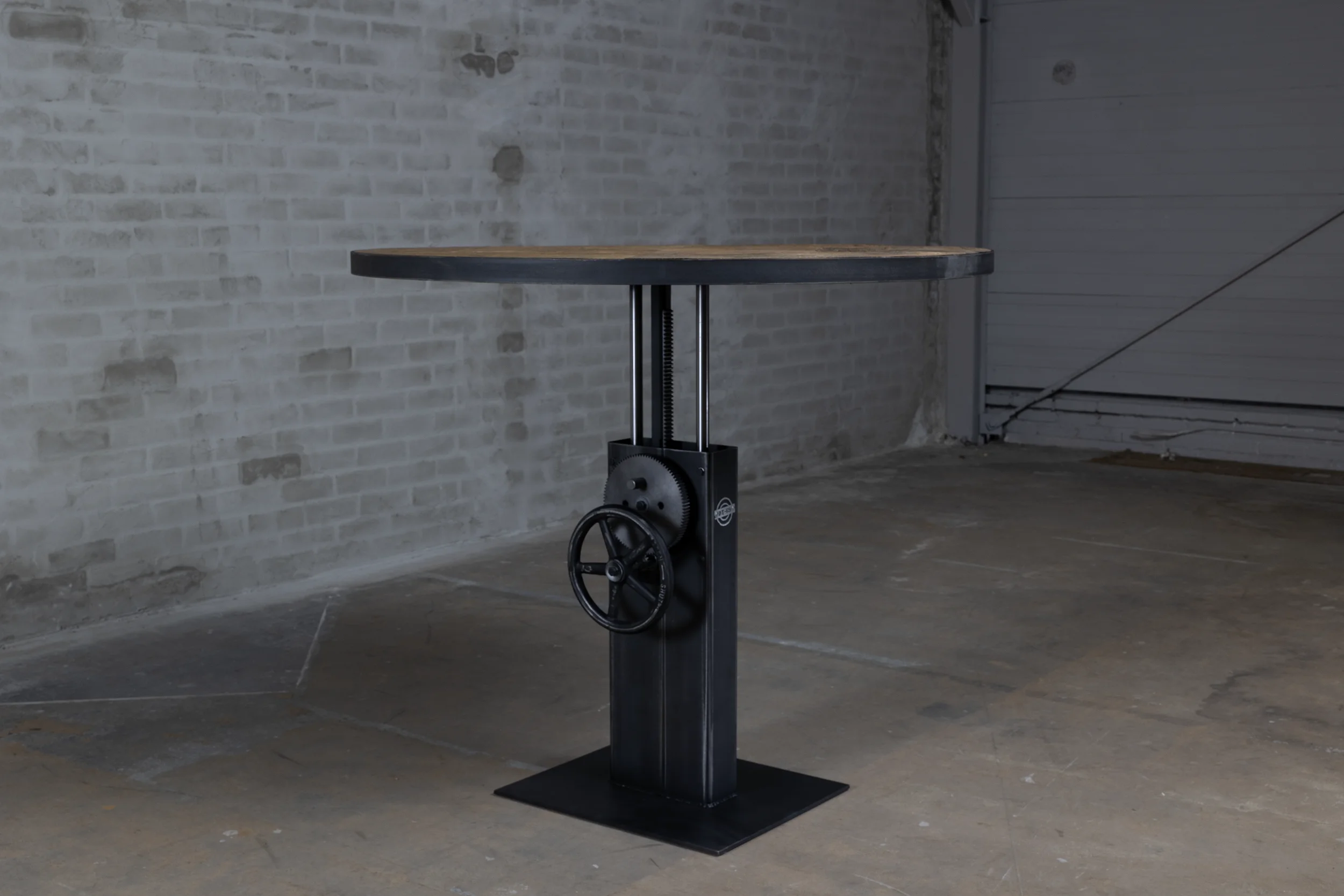 Dieser industrial Bistrotisch verfügt über ein höhenverstellbares Stahlgestell, das in unserer eigenen Werkstatt nach Maß gefertigt wird. Der Tisch ist von 76cm bis ca. 114cm höhenverstellbar, so dass er sowohl als kleiner Esstisch (niedrig) als auch als Stehtisch (hoch) verwendet werden kann.