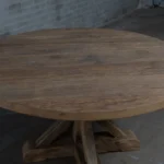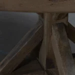 Die ca. 5,5cm dicke Tischplatte ist aus massiver alter Eiche gefertigt. Da die Eiche jahrzehntelang in der Sonne als Verkleidung verfärbt wurde, hat sie eine schöne Patina bekommen.