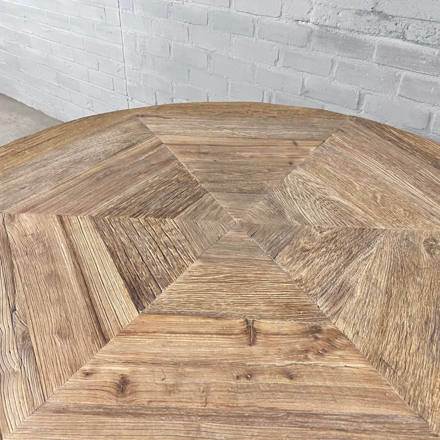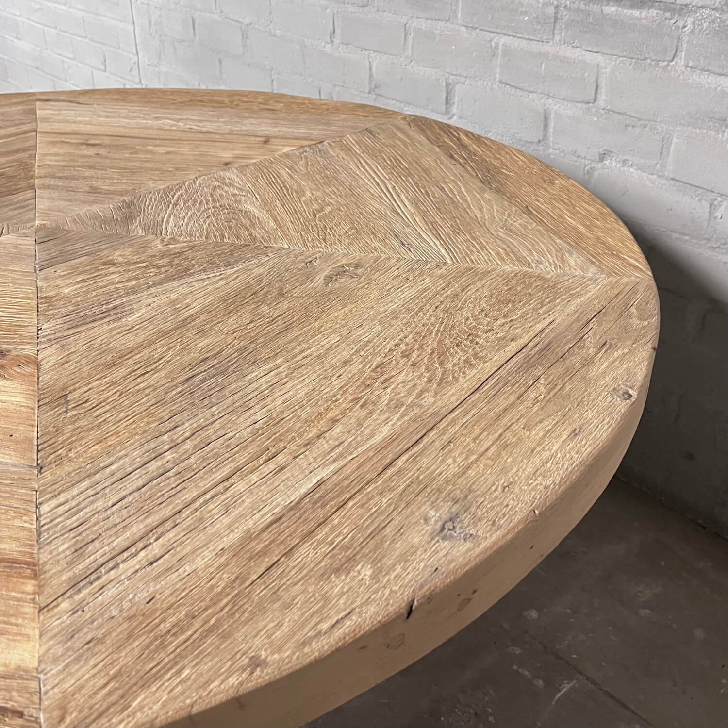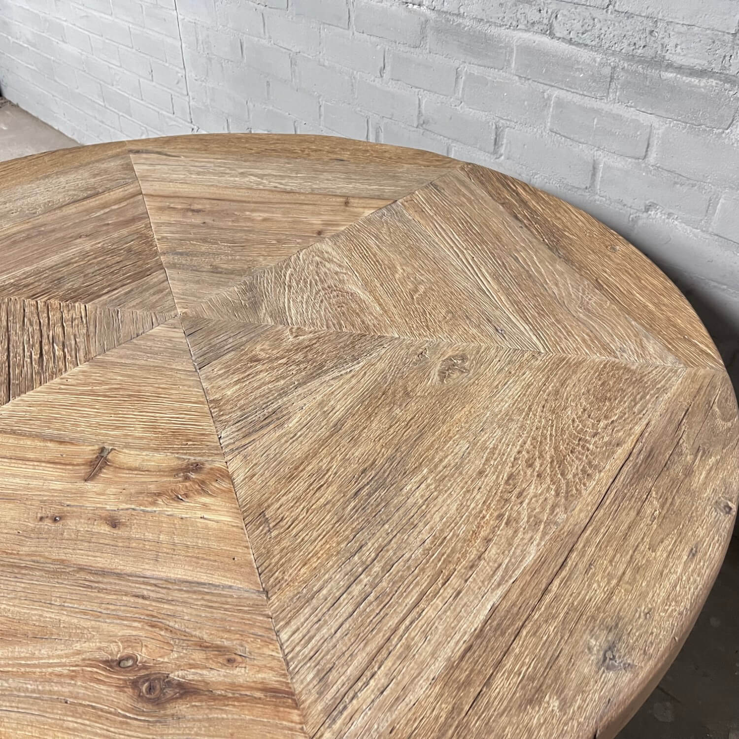 Die Tischplatte ist 5,5cm dick und verarbeitet aus dünnem sonnenverbrannten Alter Eicheholz (gesägt aus die äußere Schicht alten Balken) die auf einer Möbelbauplatte geklebt sind. Die Außenkanten der Tischplatte sind aus massiven Brettern. Die sonnenverbrannten Bretter stammen aus alten Häusern, und haben eine wunderschöne Patina von der Sonne getönt! Der Tisch wird mit der Tischplatte geliefert, die auf den letzten 5 Fotos in der Galerie zu sehen ist.