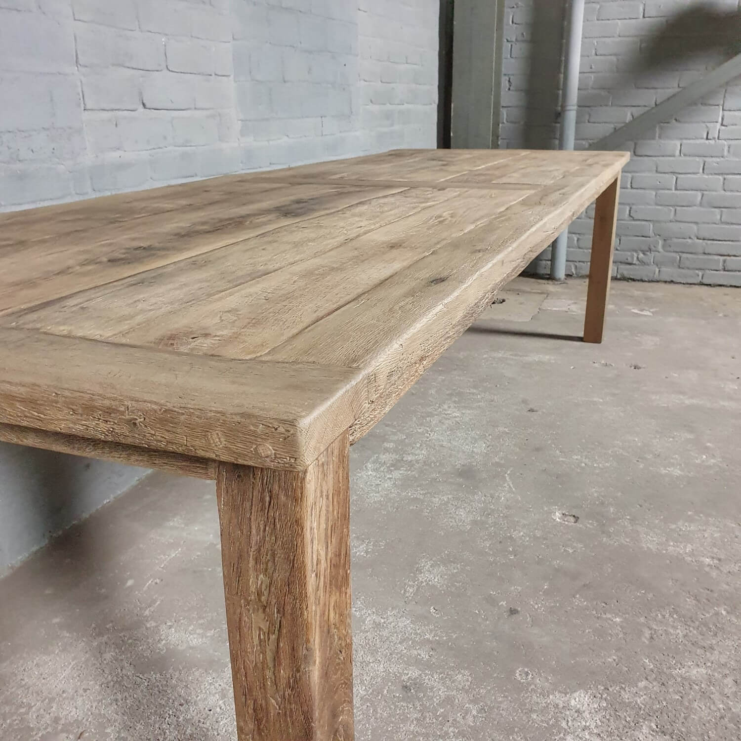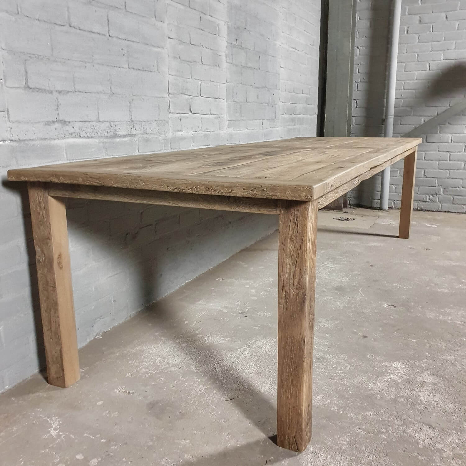 Dieser rustikaler Tisch ‘Luc’ wird hergestellt nach altem Modell eines alten französischer Tisch. Die Tischplatte ist verarbeitet aus dünnem sonnenverbrannten Altholz Eicheholz (gesägt aus die äußere Schicht alten Balken) die auf einer Möbelbauplatte geklebt sind. Die Außenkanten der Tischplatte sind aus massiven Brettern.