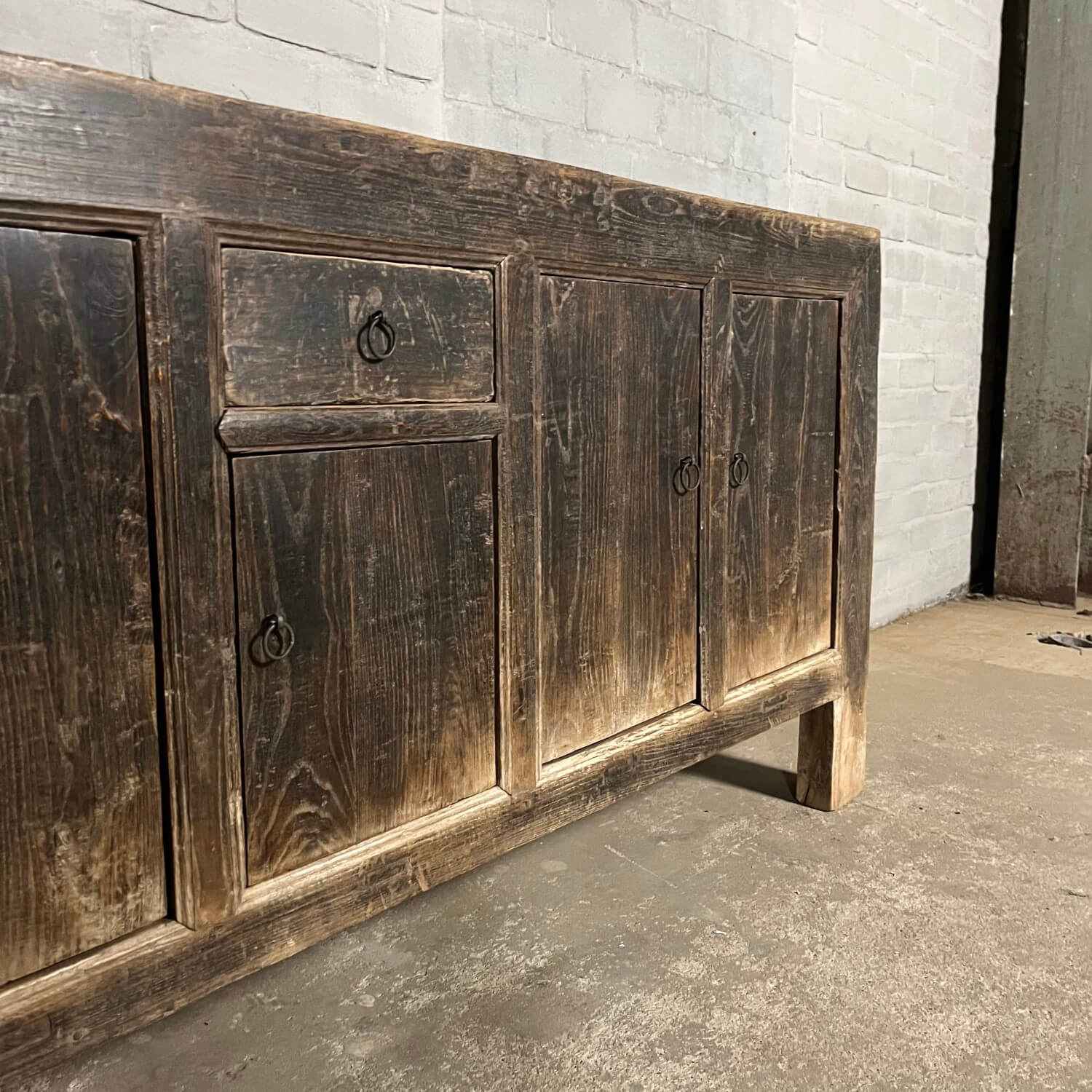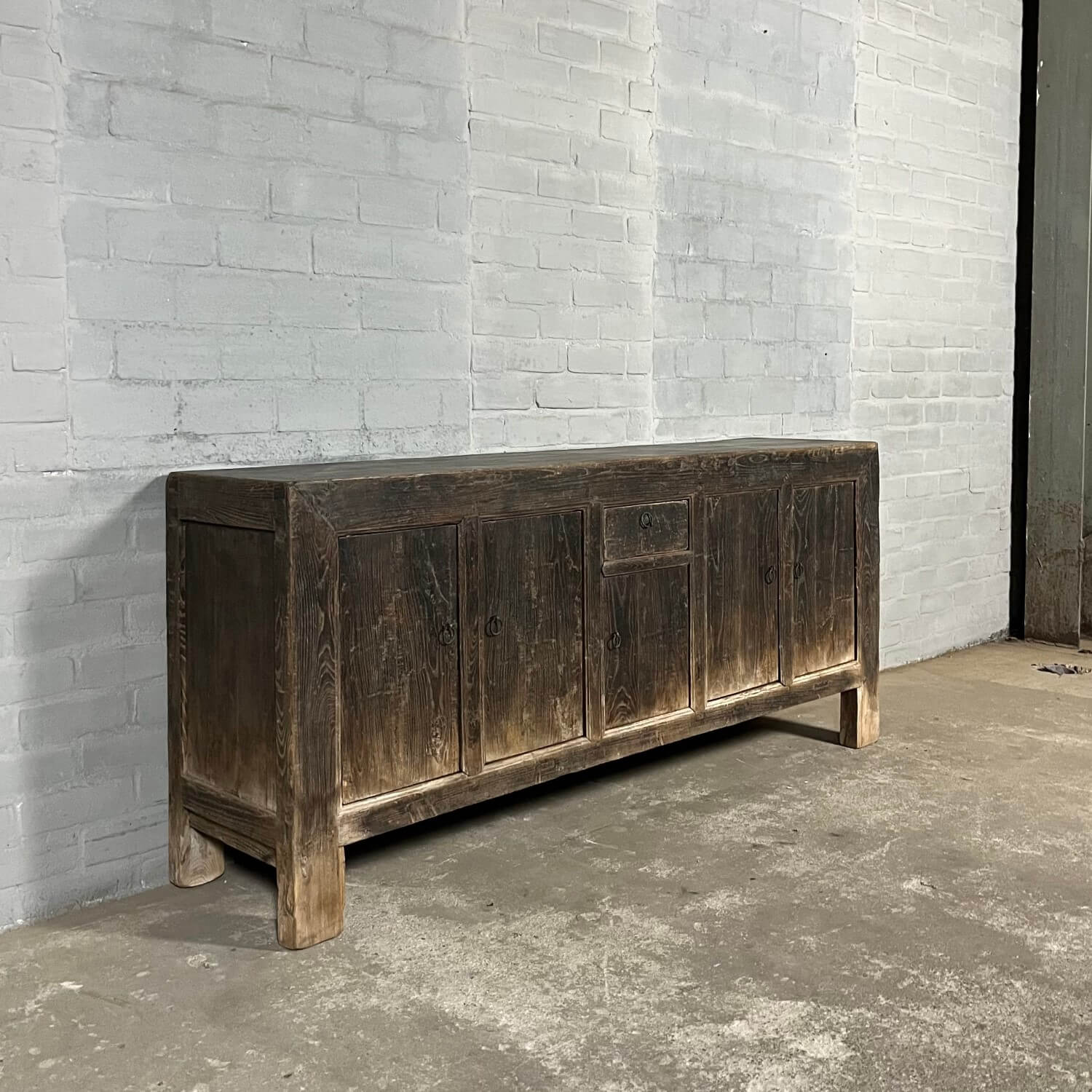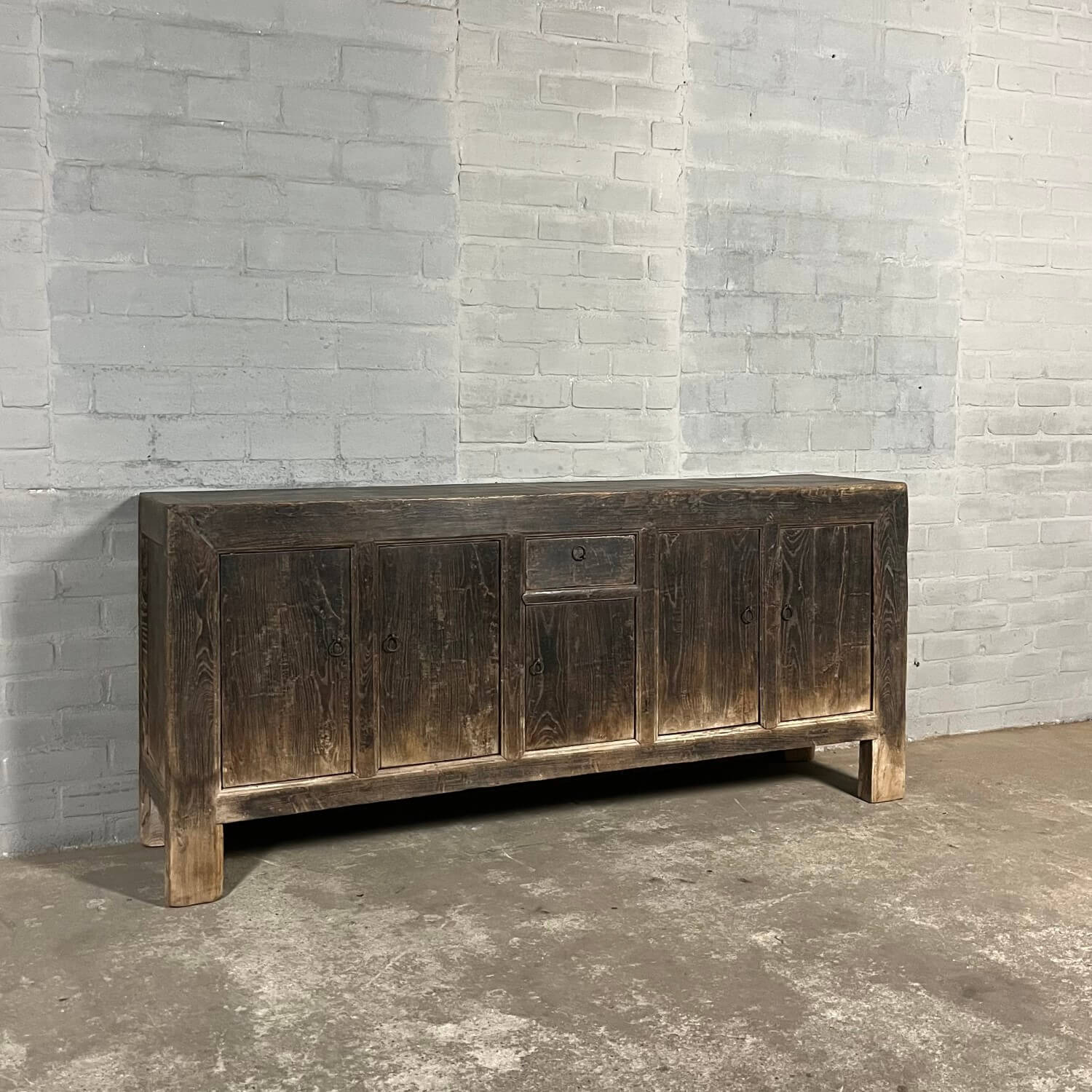 Rustikales chinesisches Sideboard mit 5 Türen. Das Sideboard ist aus altem Ulmenholz gefertigt, das mit einer schwarzen Patina überzogen wurde. Diese Patina ist im Laufe der Zeit verwittert, was den Möbeln ihr rustikales Aussehen verleiht.