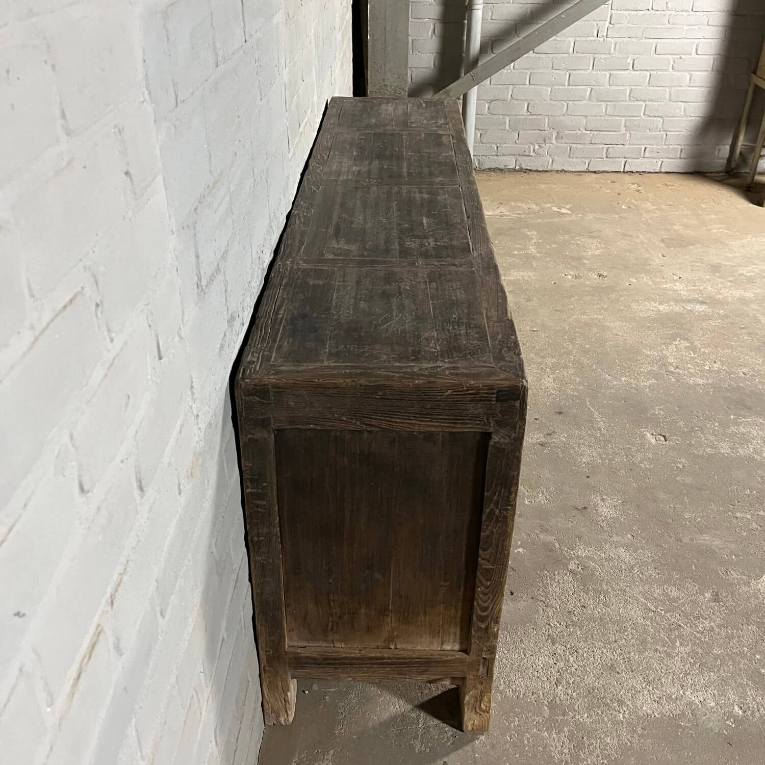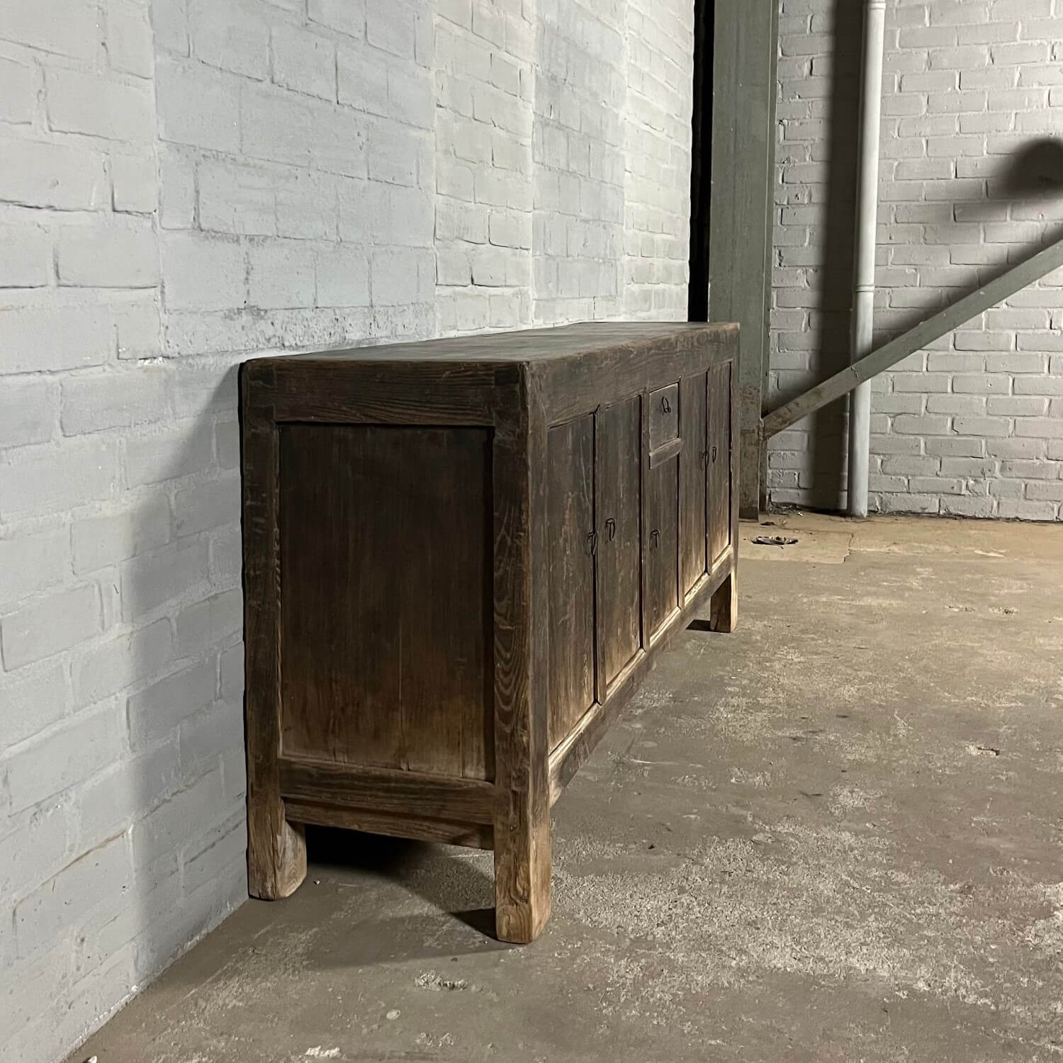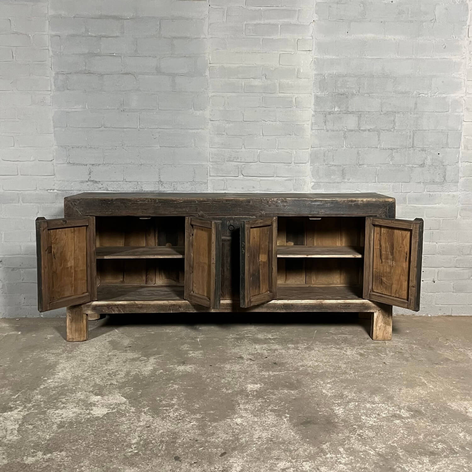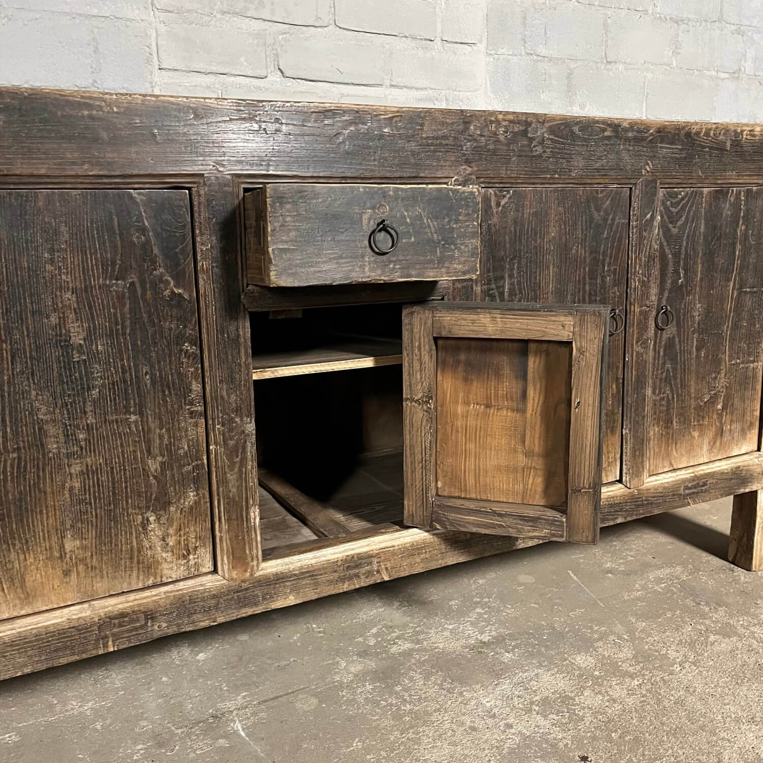 Rustikales chinesisches Sideboard mit 5 Türen. Das Sideboard ist aus altem Ulmenholz gefertigt, das mit einer schwarzen Patina überzogen wurde. Diese Patina ist im Laufe der Zeit verwittert, was den Möbeln ihr rustikales Aussehen verleiht.