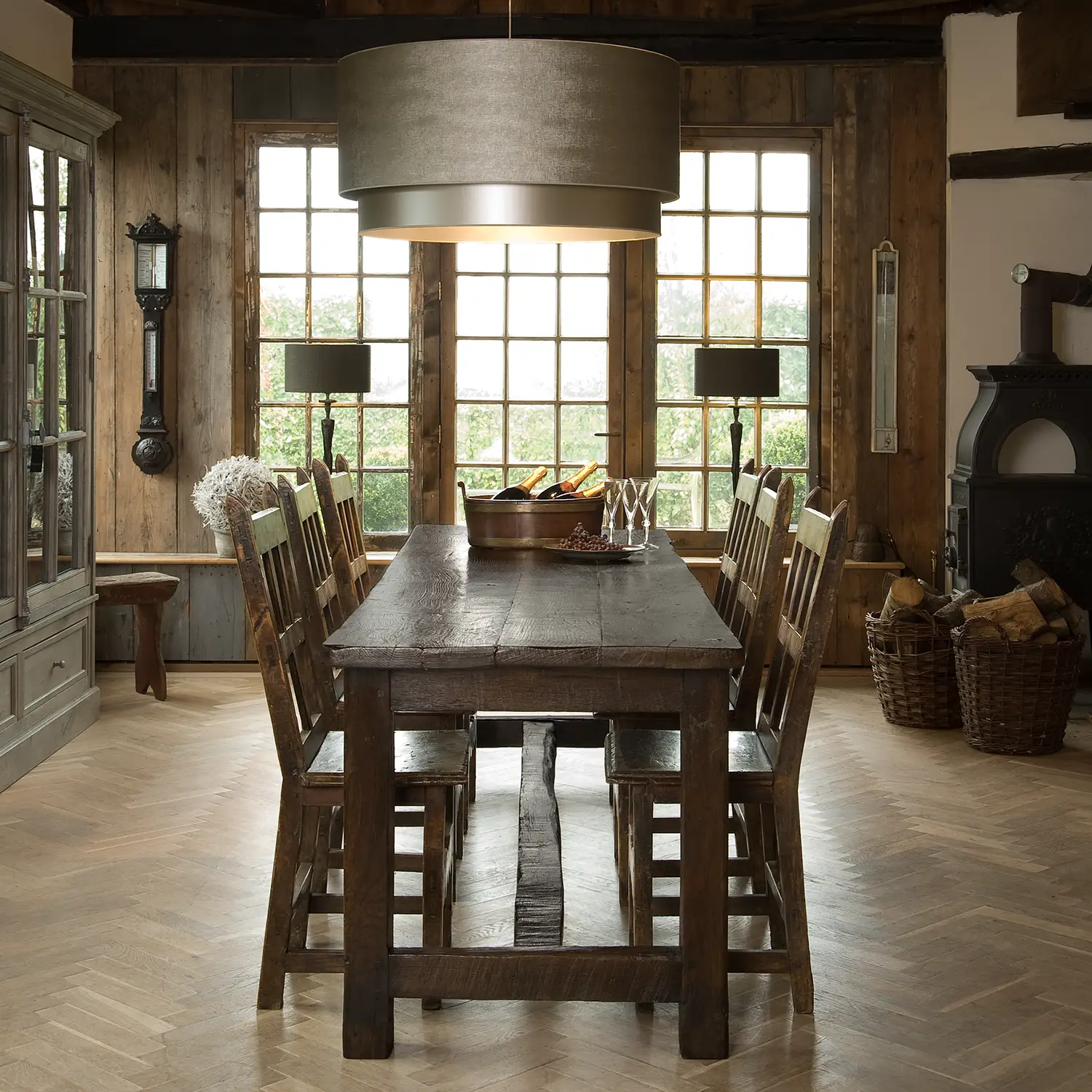 Der ländliche Esstisch Konstanz ist aus massivem altem Eichenholz nach dem Originalmodell eines Klostertisches gefertigt. Der Tisch wird in unserer eigenen Werkstatt handgefertigt. Dadurch kommen die außergewöhnliche Maserung und Patina der alten Eiche besonders schön zur Geltung.