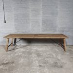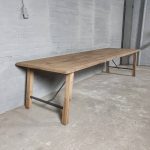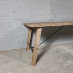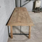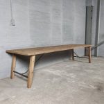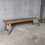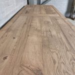 Die 4m dicke Tischplatte ist verarbeitet aus dünnem sonnenverbrannten Altholz Eichen Brettern (gesägt aus die äußere Schicht alten Balken) die auf einer Möbelbauplatte geklebt sind. Die Außenkanten der Tischplatte sind aus massiven Brettern.