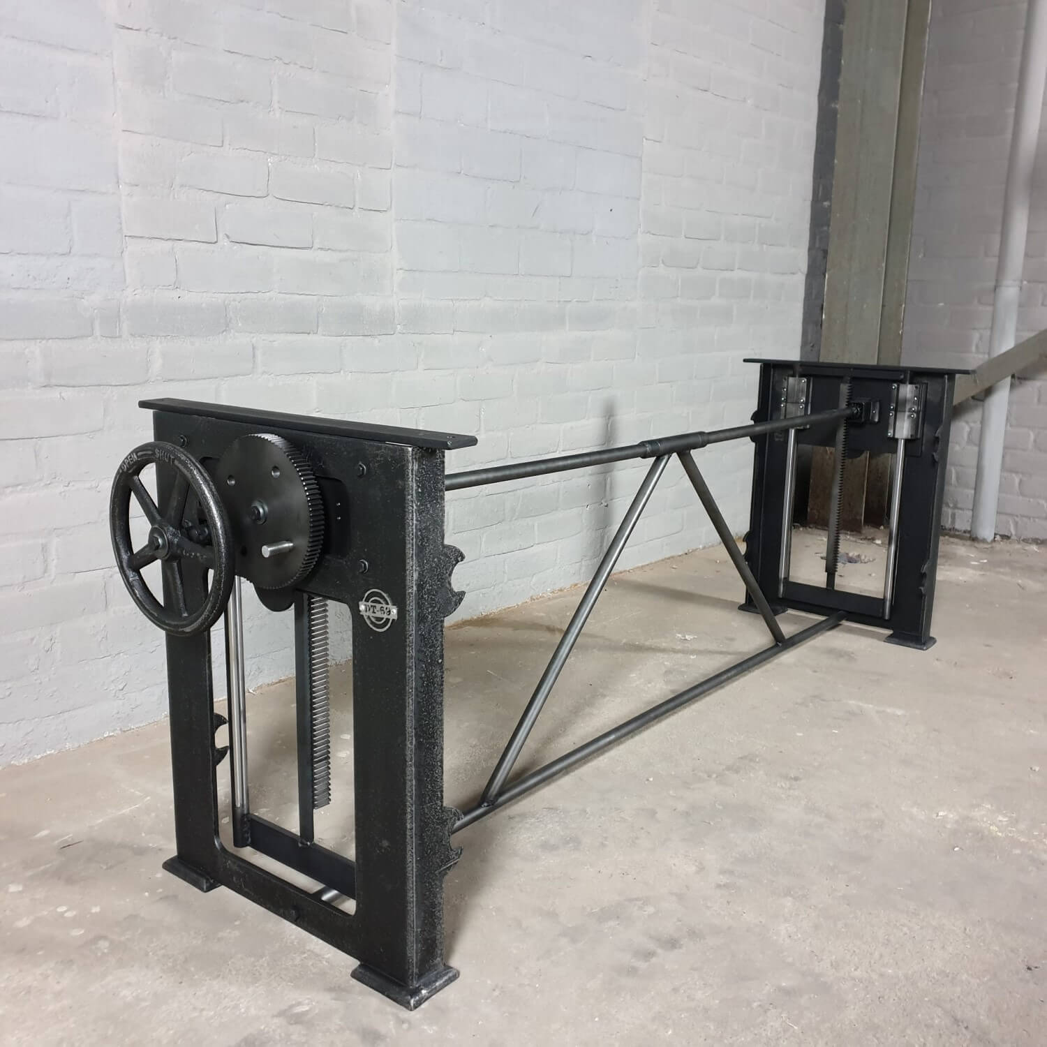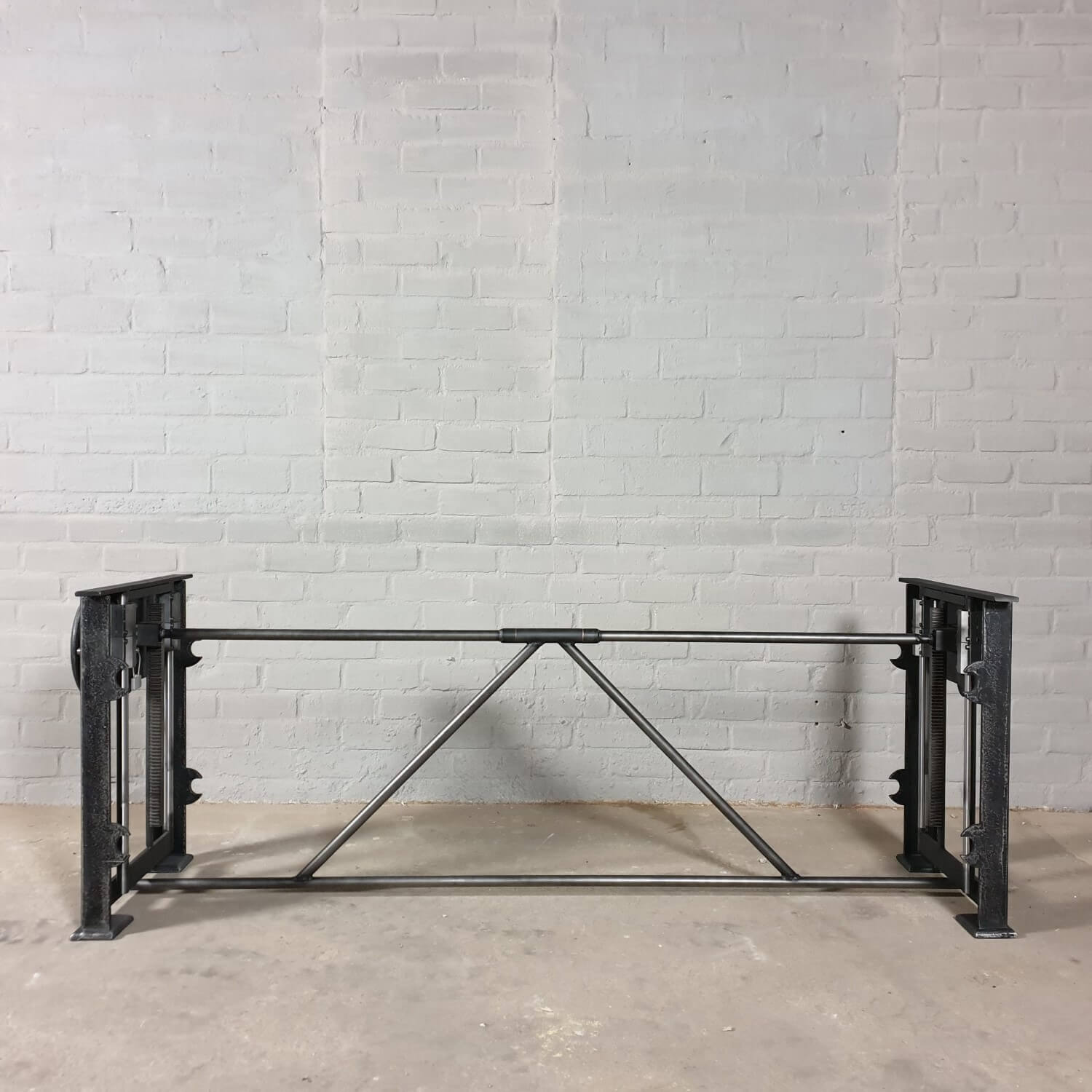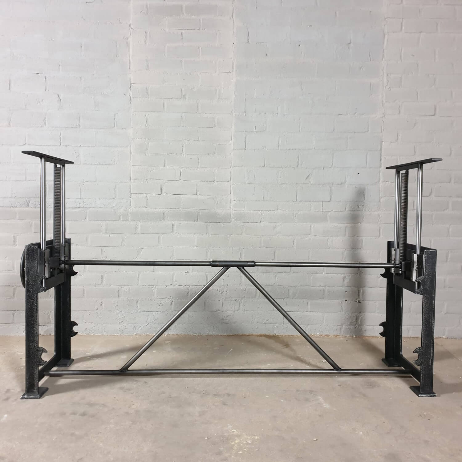 Dieser industrie Design Tischgestell hat einen in die Beine eingebauten Mechanismus zur Höhenverstellung. Mit diesem Mechanismus lässt sich eine Tischplatte von 71 cm bis 112 cm Höhe anheben und absenken. So kann ein Tisch mit diesem Gestell als Esstisch (niedrig) und als Stehtisch (hoch) verwendet werden. Denken Sie aber auch daran, den Küchentisch (niedrig) als Steh-Büro (hoch) zu nutzen.